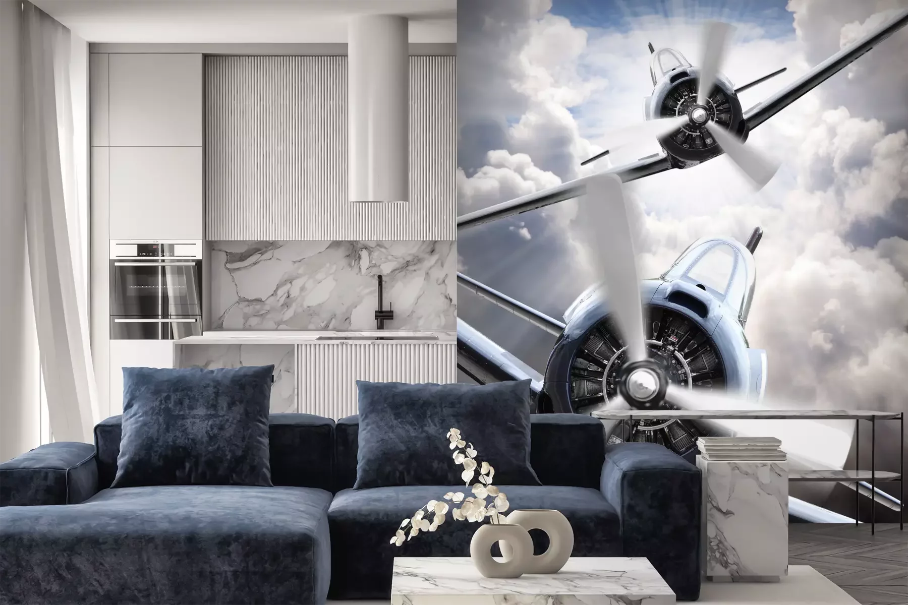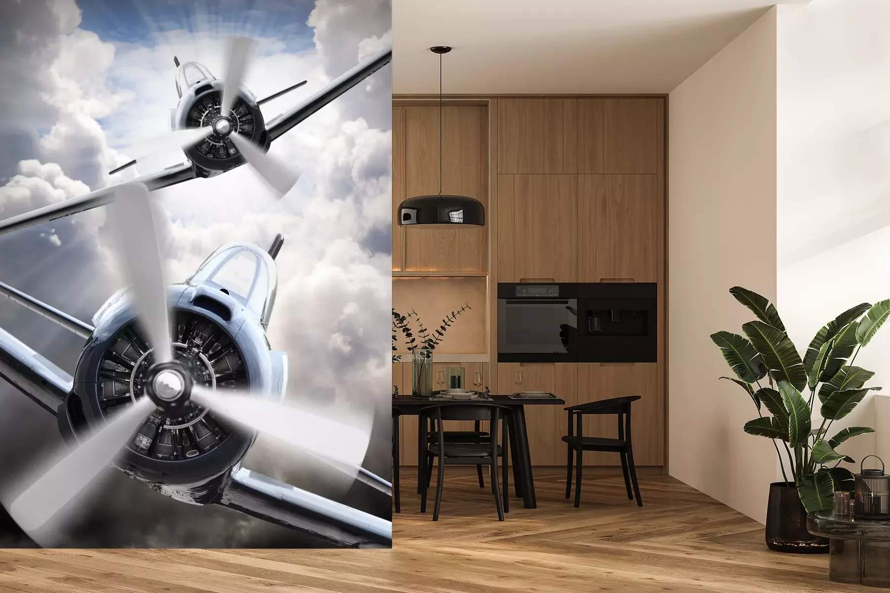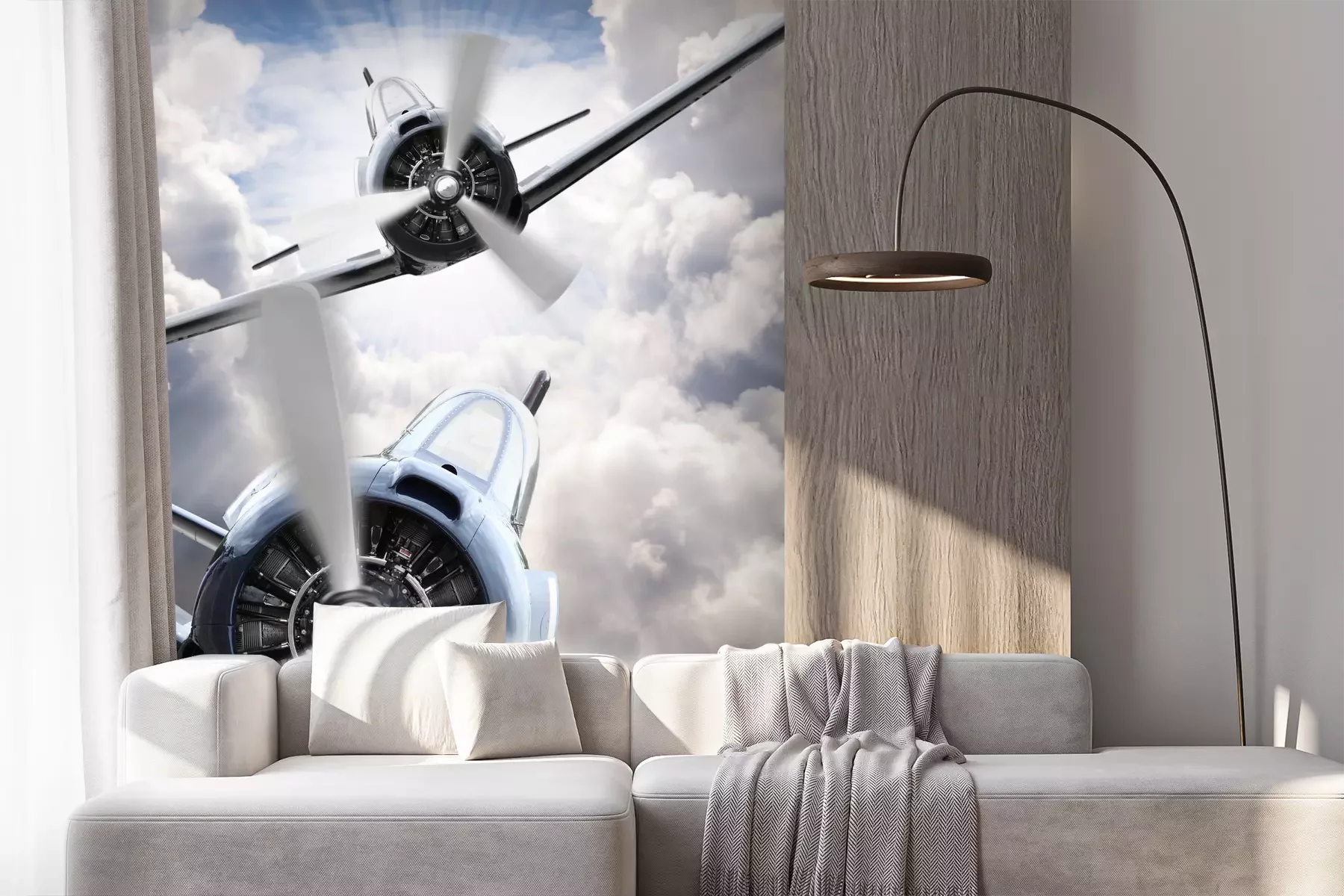 Een vintage vliegtuig in de wolkenFotobehang