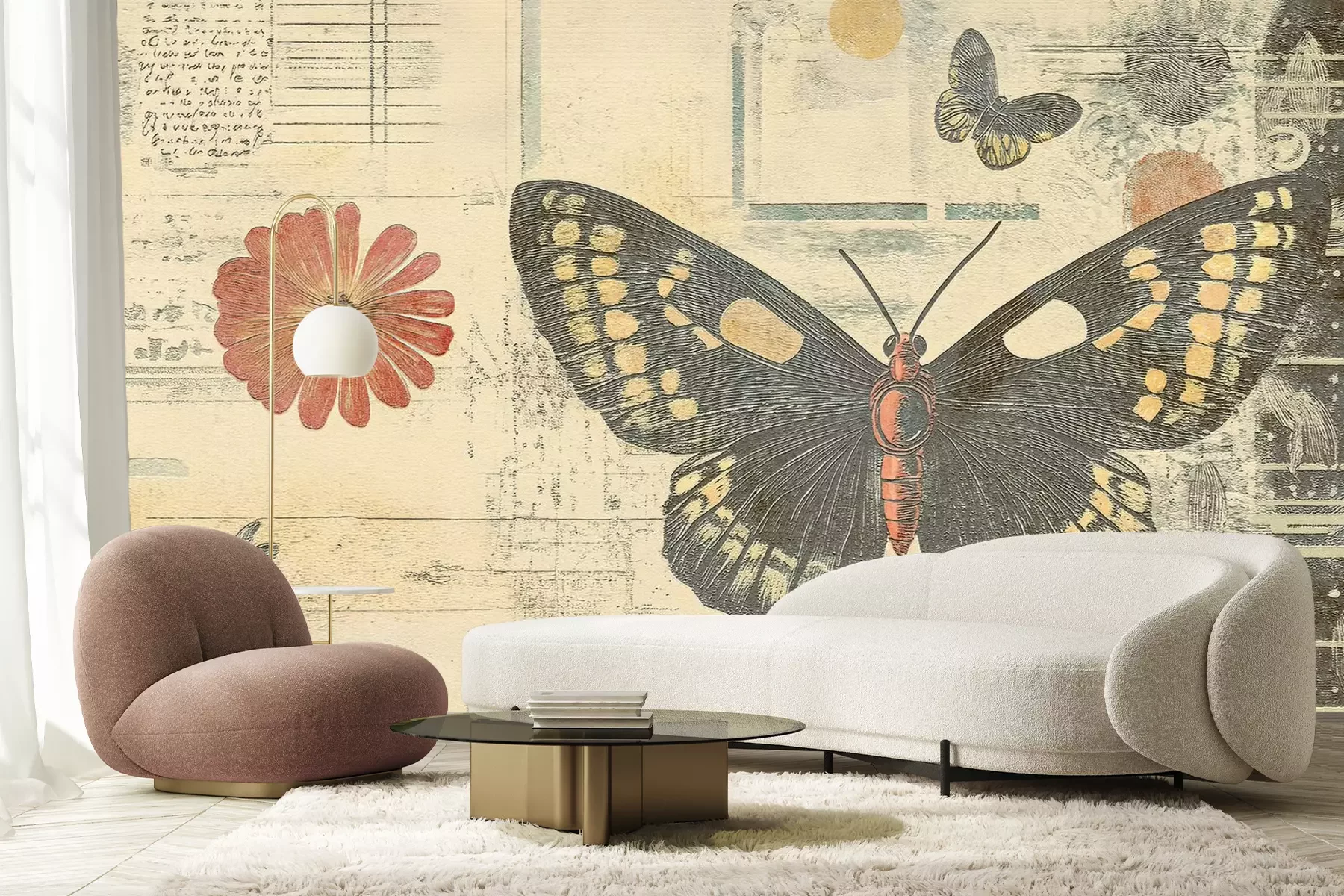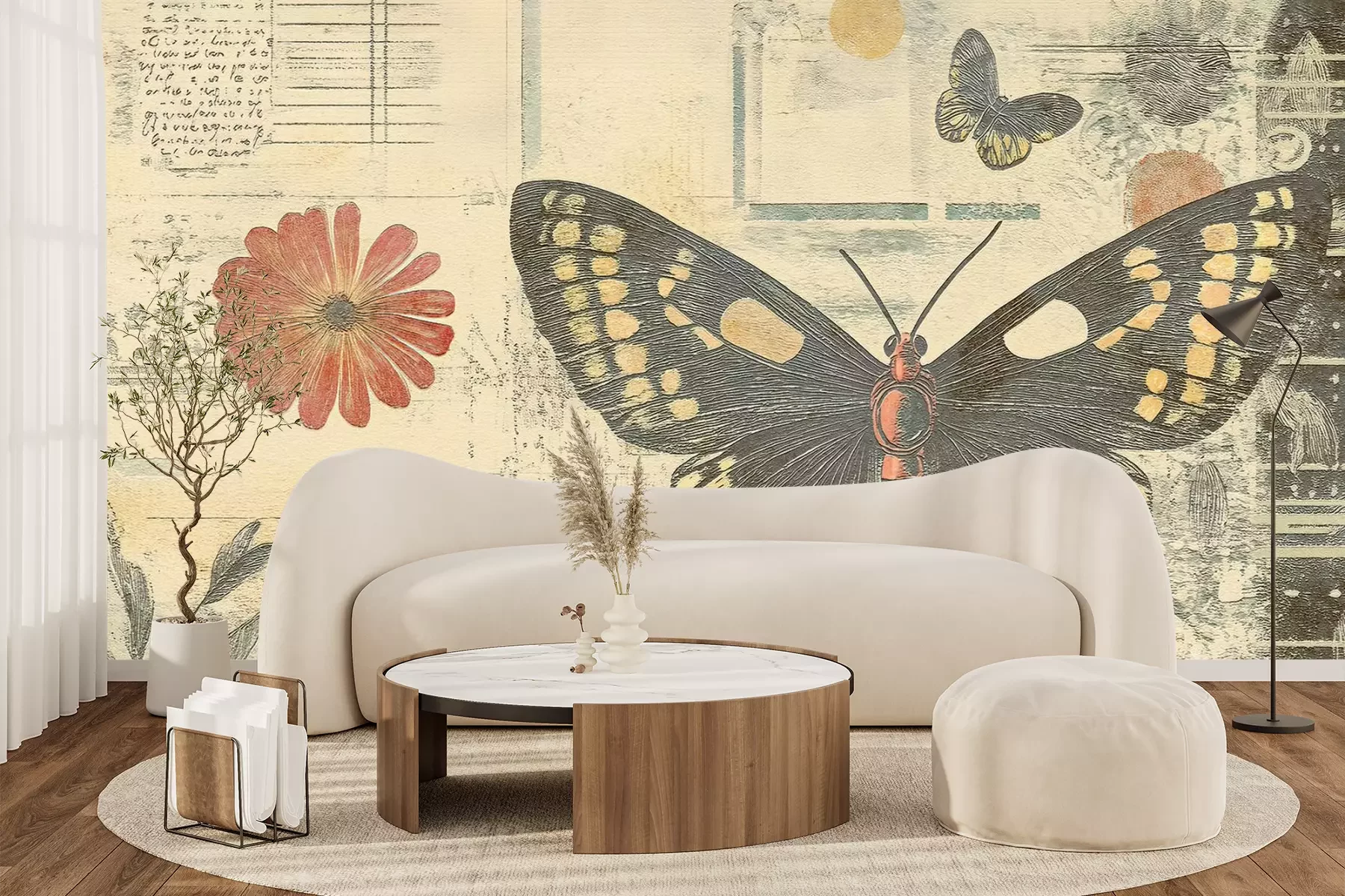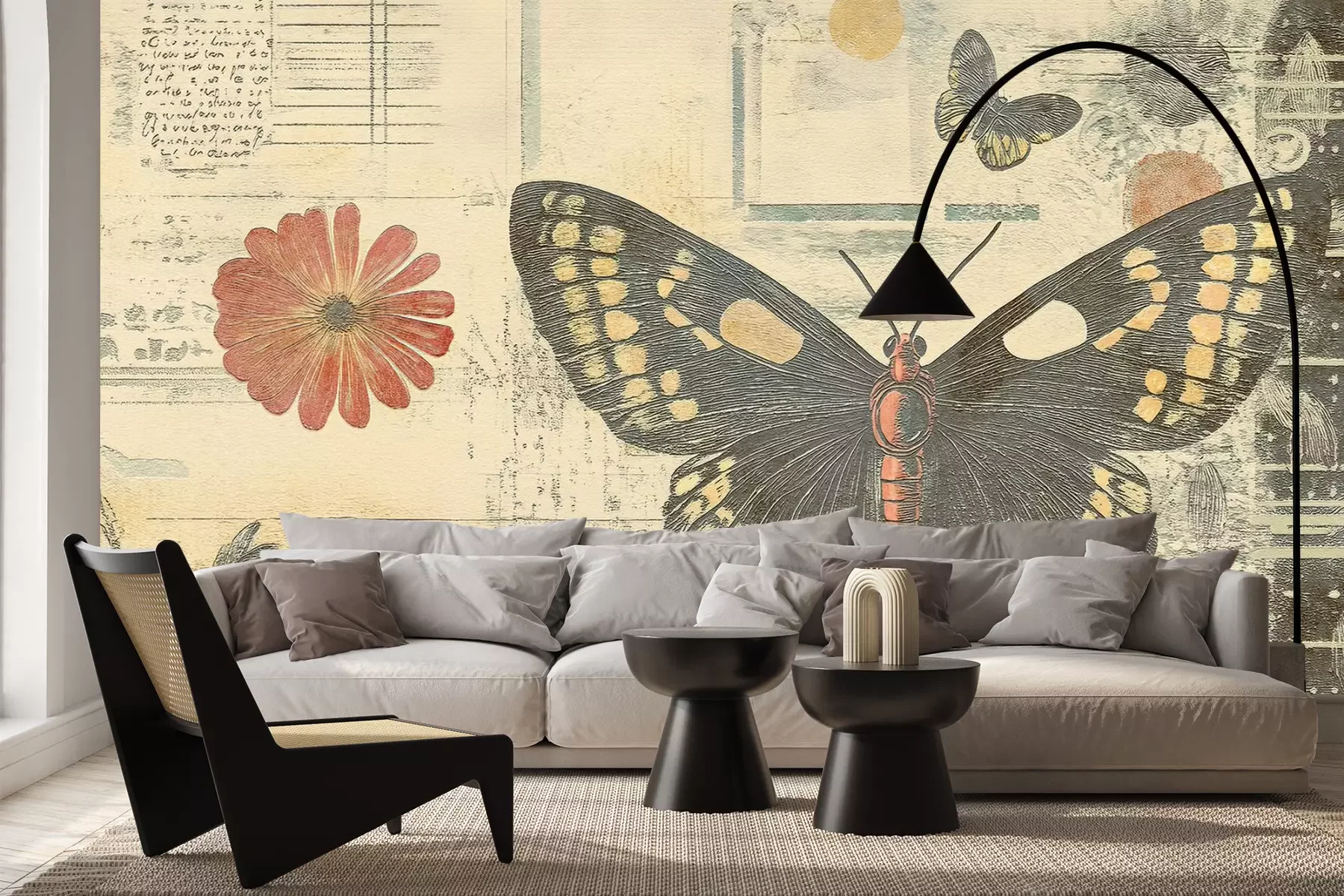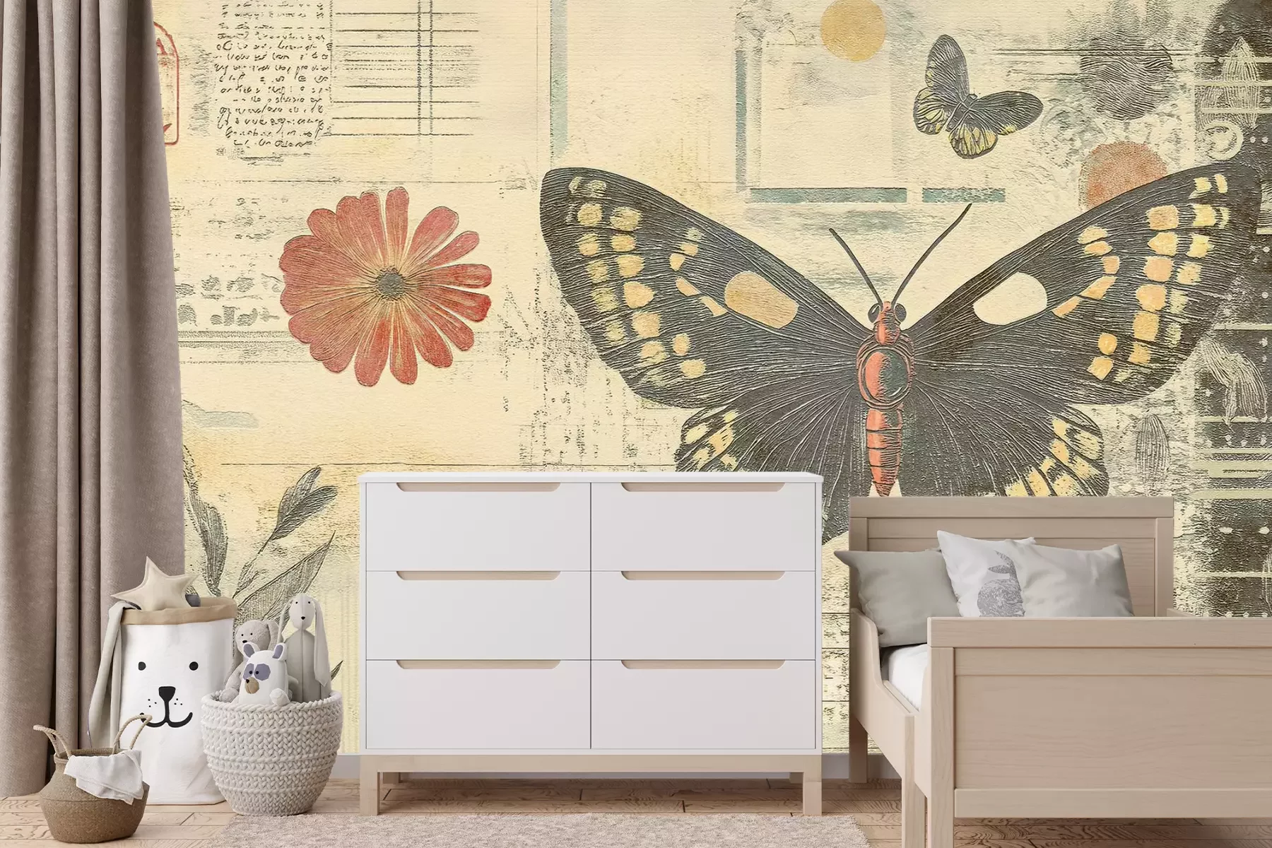 Retropatroon met vlinders, bloemen en bladeren, botanisch motief met een verouderd effect
