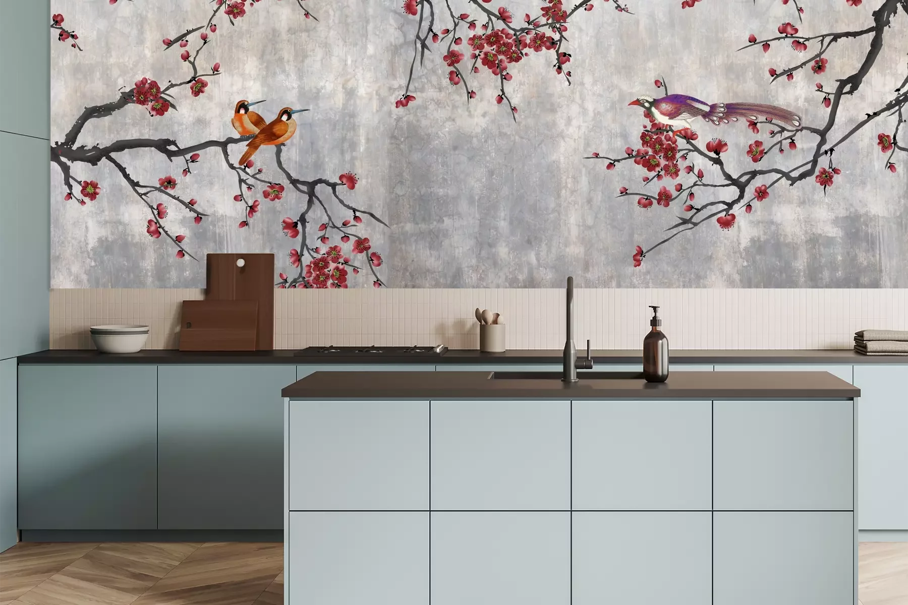 Het materiaal Premium is een glad vinyl op vlies, dat bestand is tegen uitrekken en vervorming. Het is dampdoorlatend – de muren kunnen vrij ademen – waardoor het geschikt is voor gebruik in de keuken en badkamer. Bij vervuiling kan het materiaal worden afgenomen met een vochtige doek. De maximale breedte van één baan bedraagt 95 of 105 cm, afhankelijk van de beschikbaarheid. Montage vindt plaats met de rand-aan-rand methode, wat een esthetisch resultaat zonder zichtbare naden oplevert. Omdat de lijm rechtstreeks op de muur wordt aangebracht, verloopt de installatie van het fotobehang snel en eenvoudig.