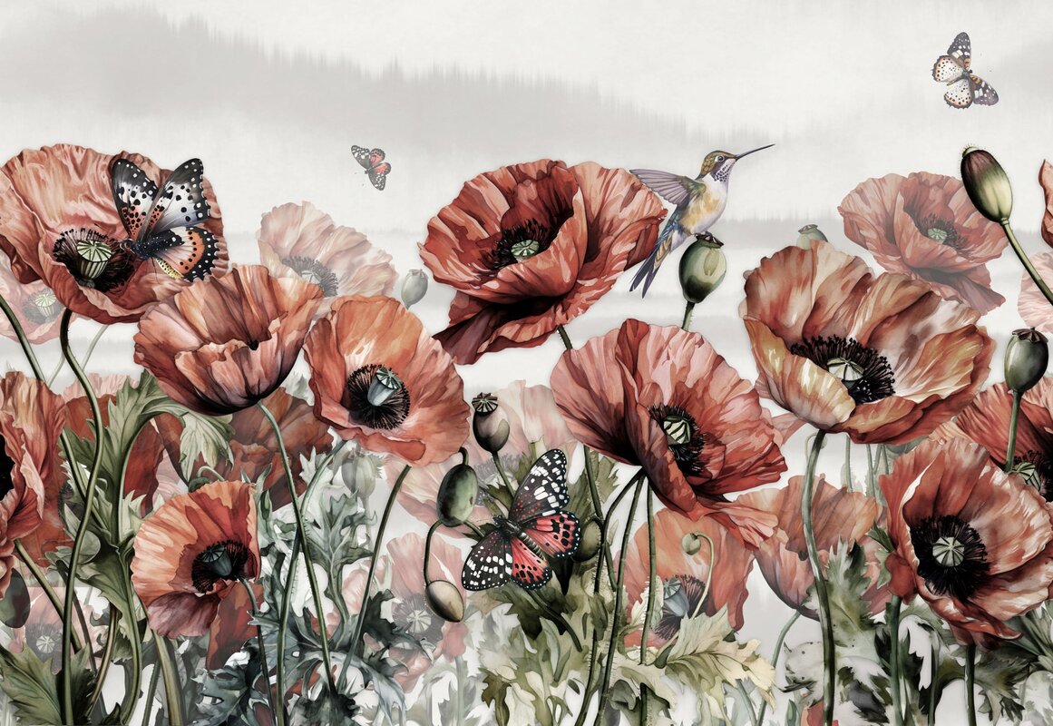 Fotobehang: Rode klaprozen, kolibries en vlinders