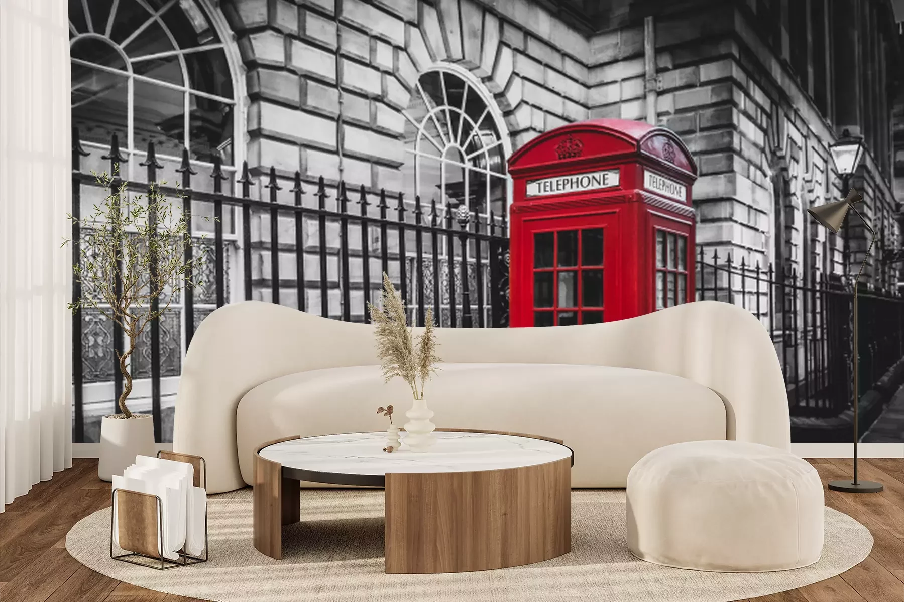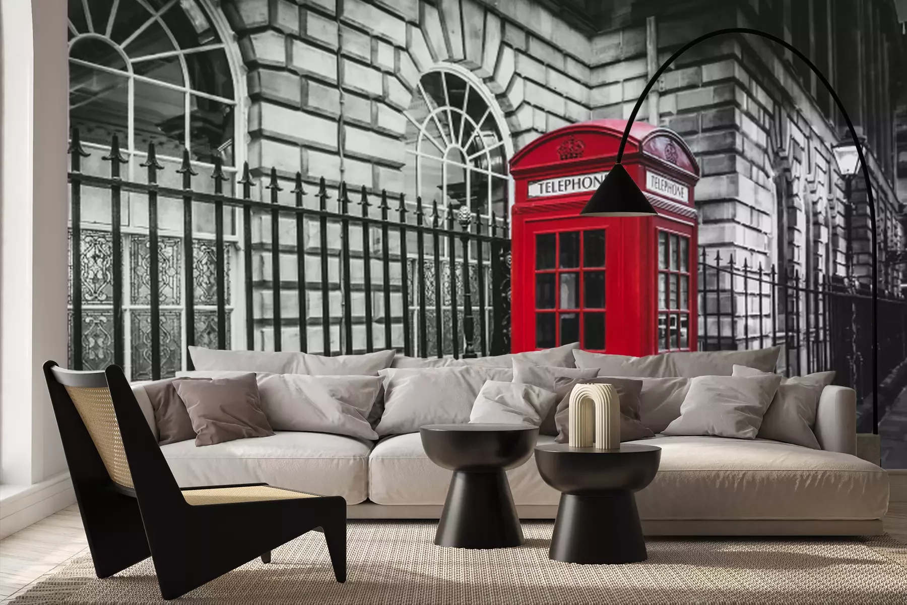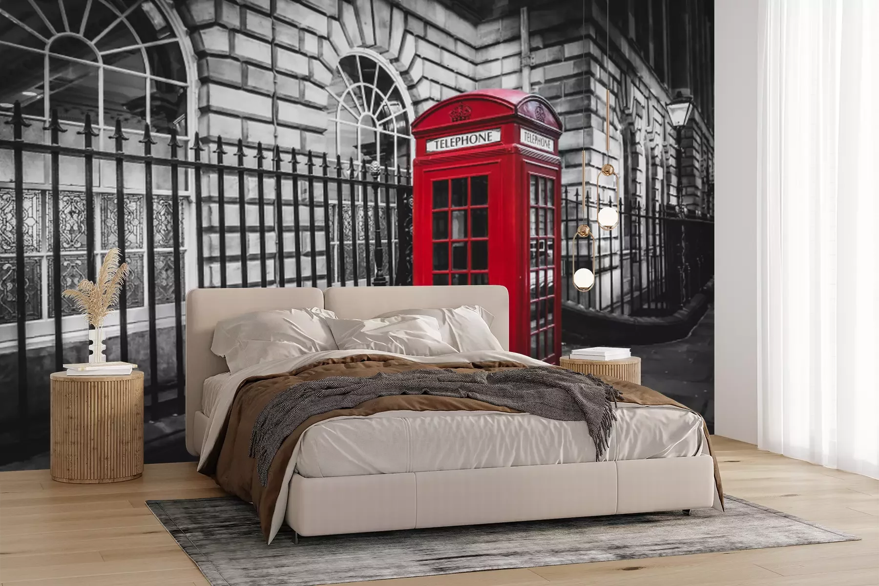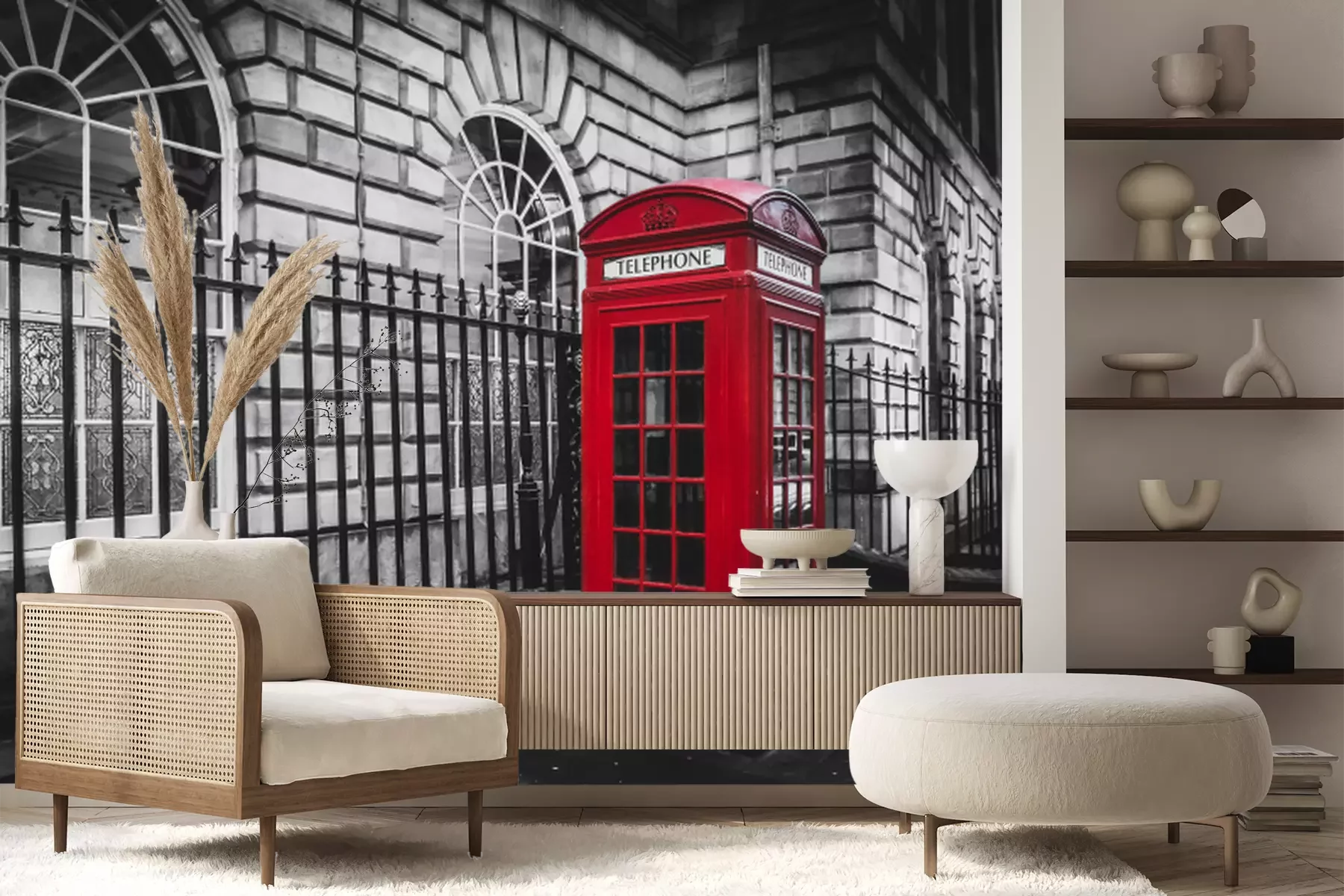 Fotobehang Rode telefooncel op een zwart-witte achtergrond