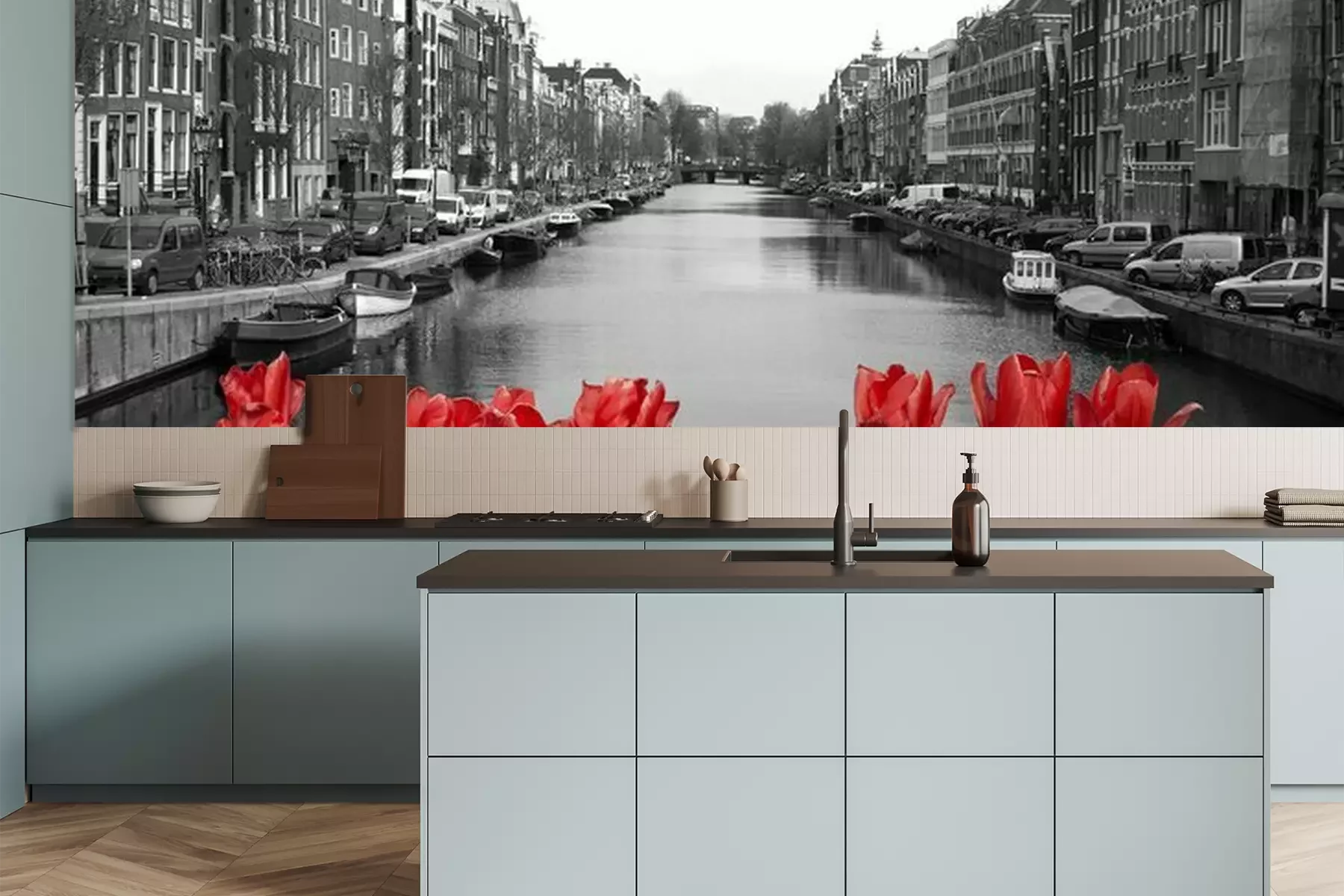 Het materiaal Premium is een glad vinyl op vlies, dat bestand is tegen uitrekken en vervorming. Het is dampdoorlatend – de muren kunnen vrij ademen – waardoor het geschikt is voor gebruik in de keuken en badkamer. Bij vervuiling kan het materiaal worden afgenomen met een vochtige doek. De maximale breedte van één baan bedraagt 95 of 105 cm, afhankelijk van de beschikbaarheid. Montage vindt plaats met de rand-aan-rand methode, wat een esthetisch resultaat zonder zichtbare naden oplevert. Omdat de lijm rechtstreeks op de muur wordt aangebracht, verloopt de installatie van het fotobehang snel en eenvoudig.