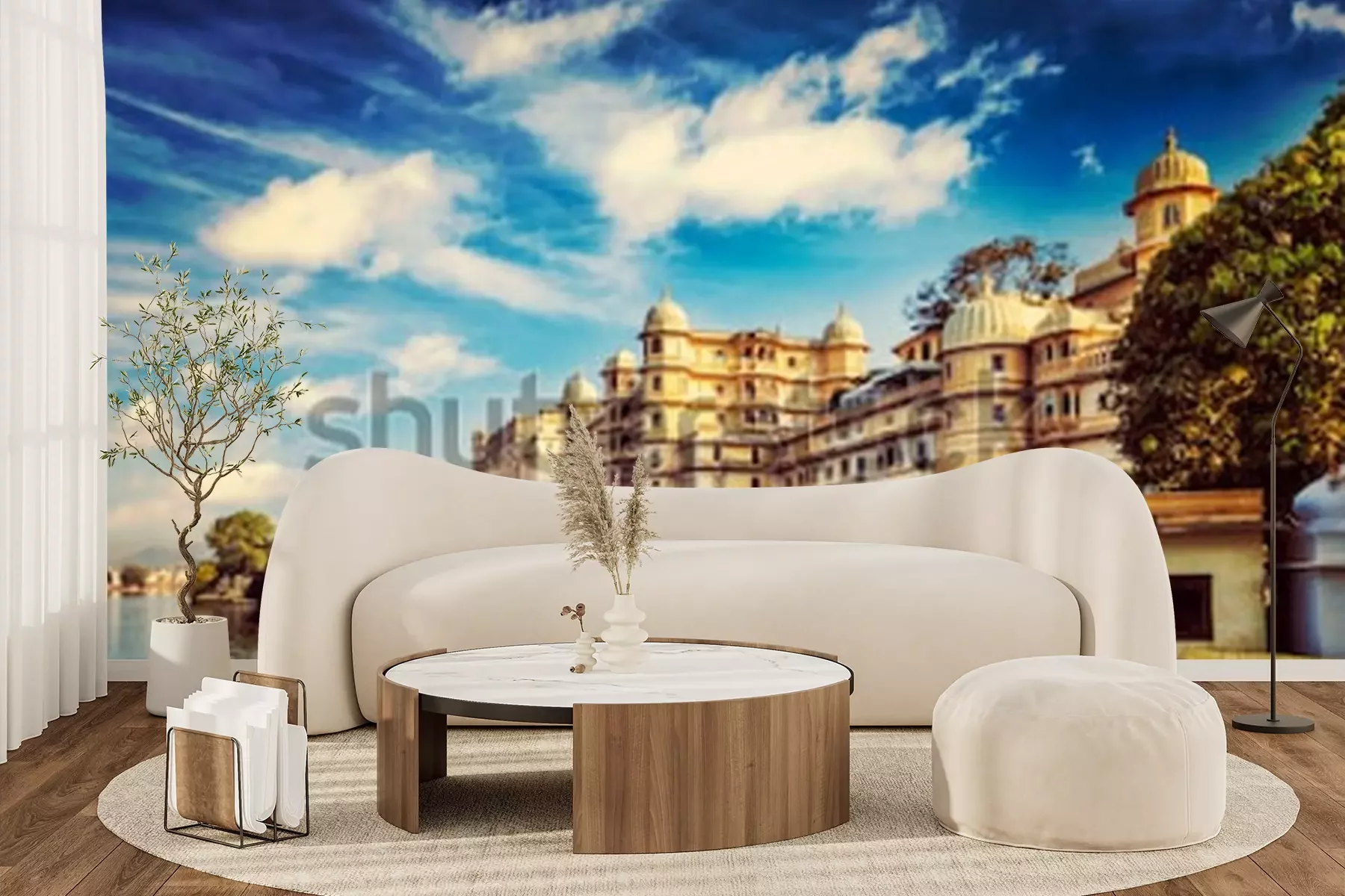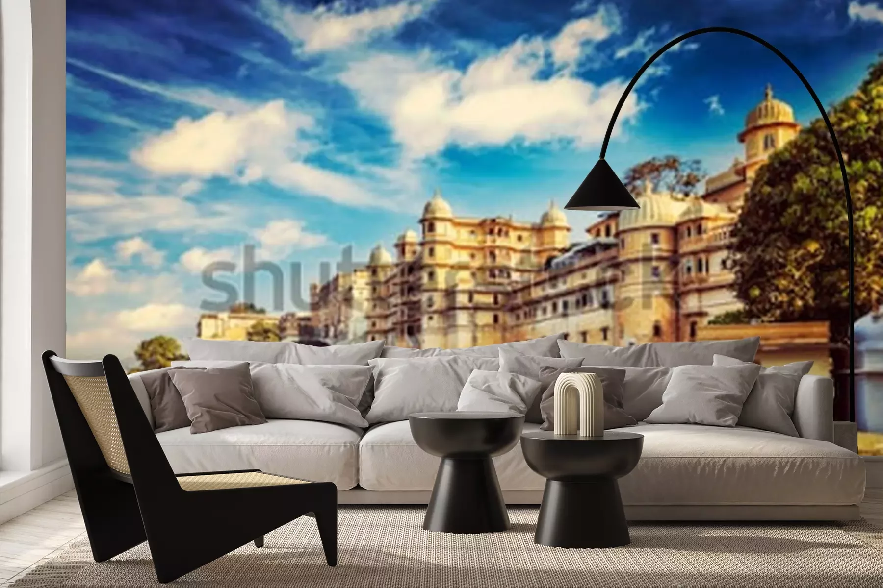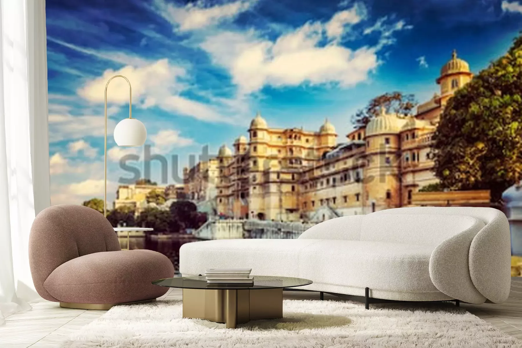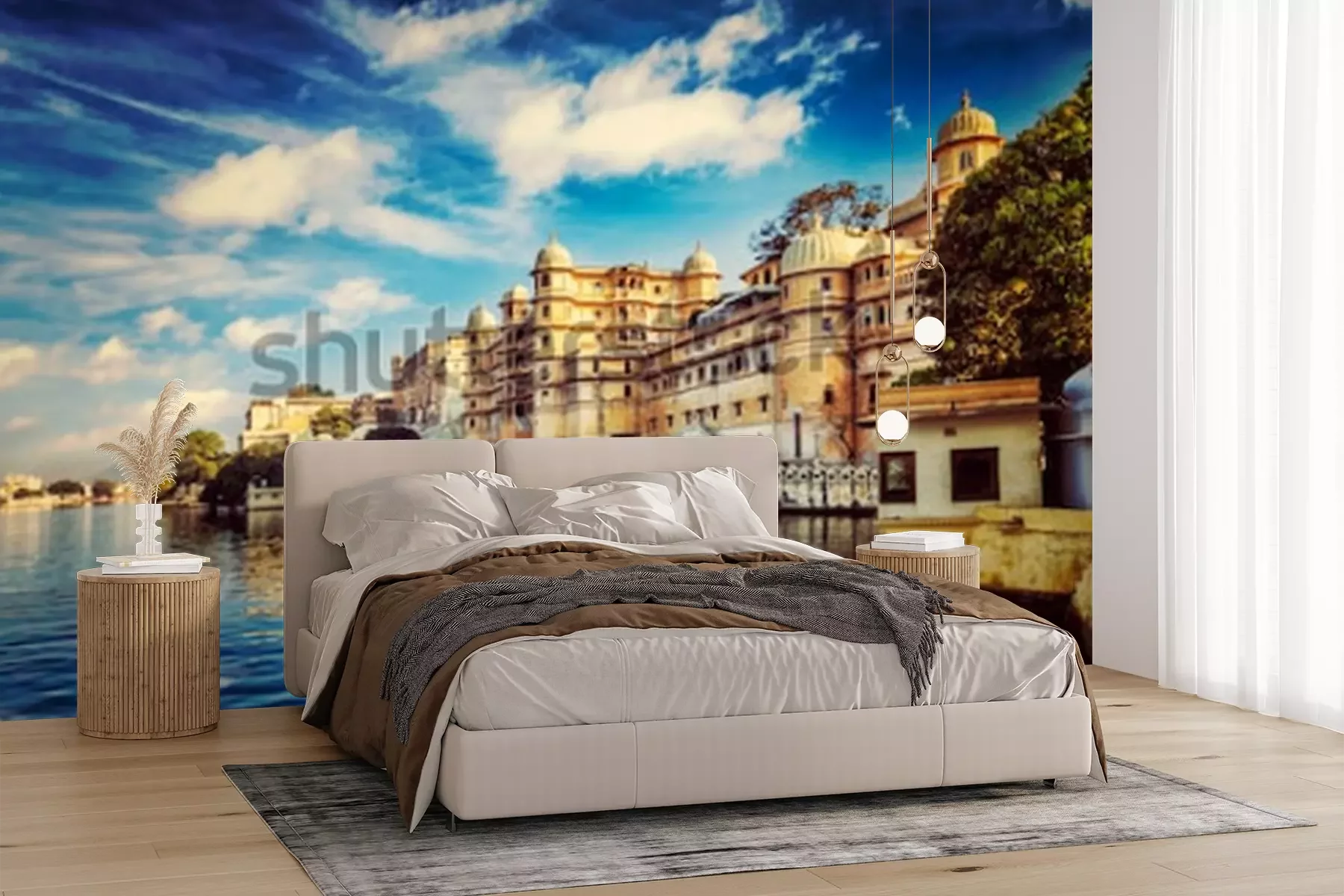 Fotobehang Romantisch India luxe toerisme behang - Vintage retro-effect gefilterde hipster stijl beeld van Udaipur City Palace en Lake Pichola. Udaipur, Rajasthan, India
