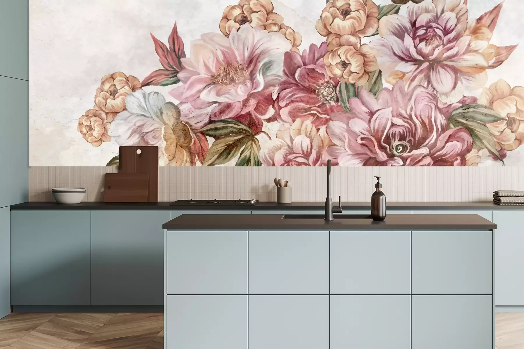 Het materiaal Premium is een glad vinyl op vlies, dat bestand is tegen uitrekken en vervorming. Het is dampdoorlatend – de muren kunnen vrij ademen – waardoor het geschikt is voor gebruik in de keuken en badkamer. Bij vervuiling kan het materiaal worden afgenomen met een vochtige doek. De maximale breedte van één baan bedraagt 95 of 105 cm, afhankelijk van de beschikbaarheid. Montage vindt plaats met de rand-aan-rand methode, wat een esthetisch resultaat zonder zichtbare naden oplevert. Omdat de lijm rechtstreeks op de muur wordt aangebracht, verloopt de installatie van het fotobehang snel en eenvoudig.