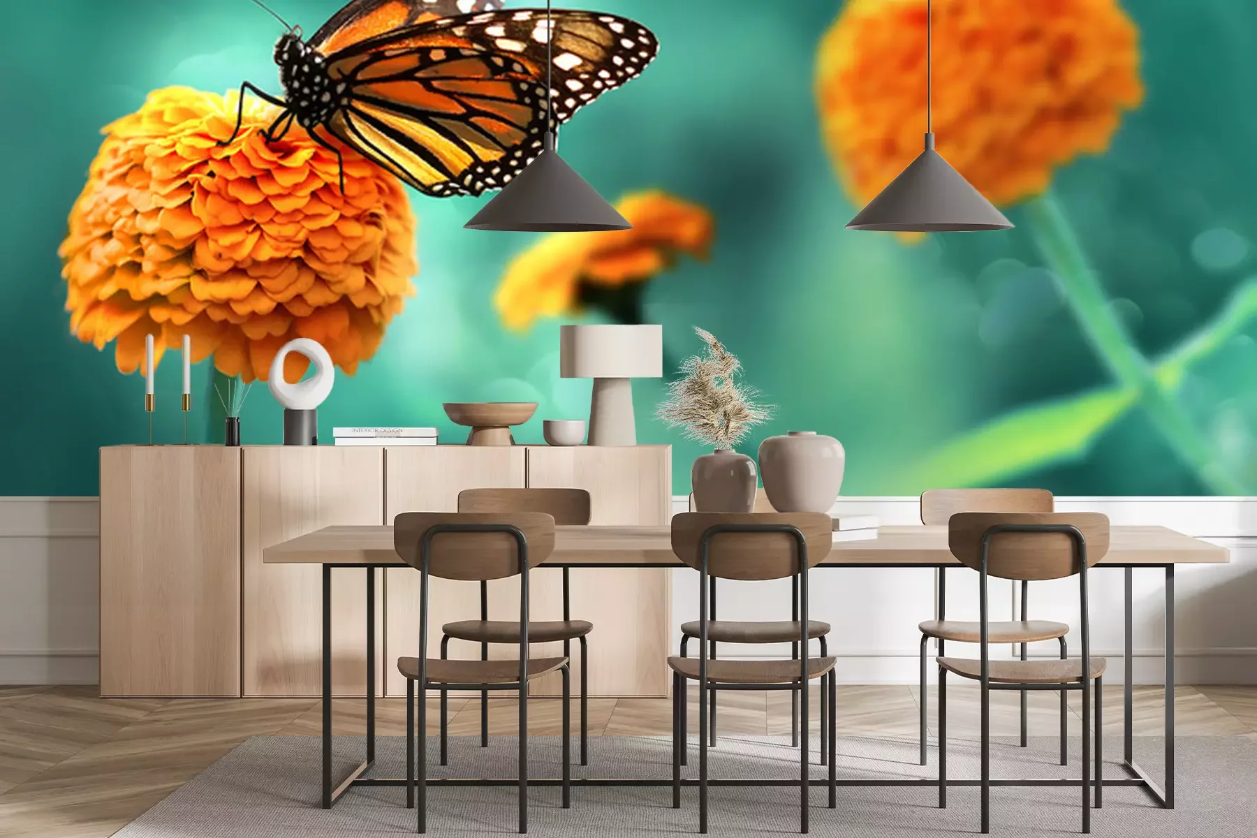 Fotobehang Rondfladderende vlinder op een oranje bloemetje