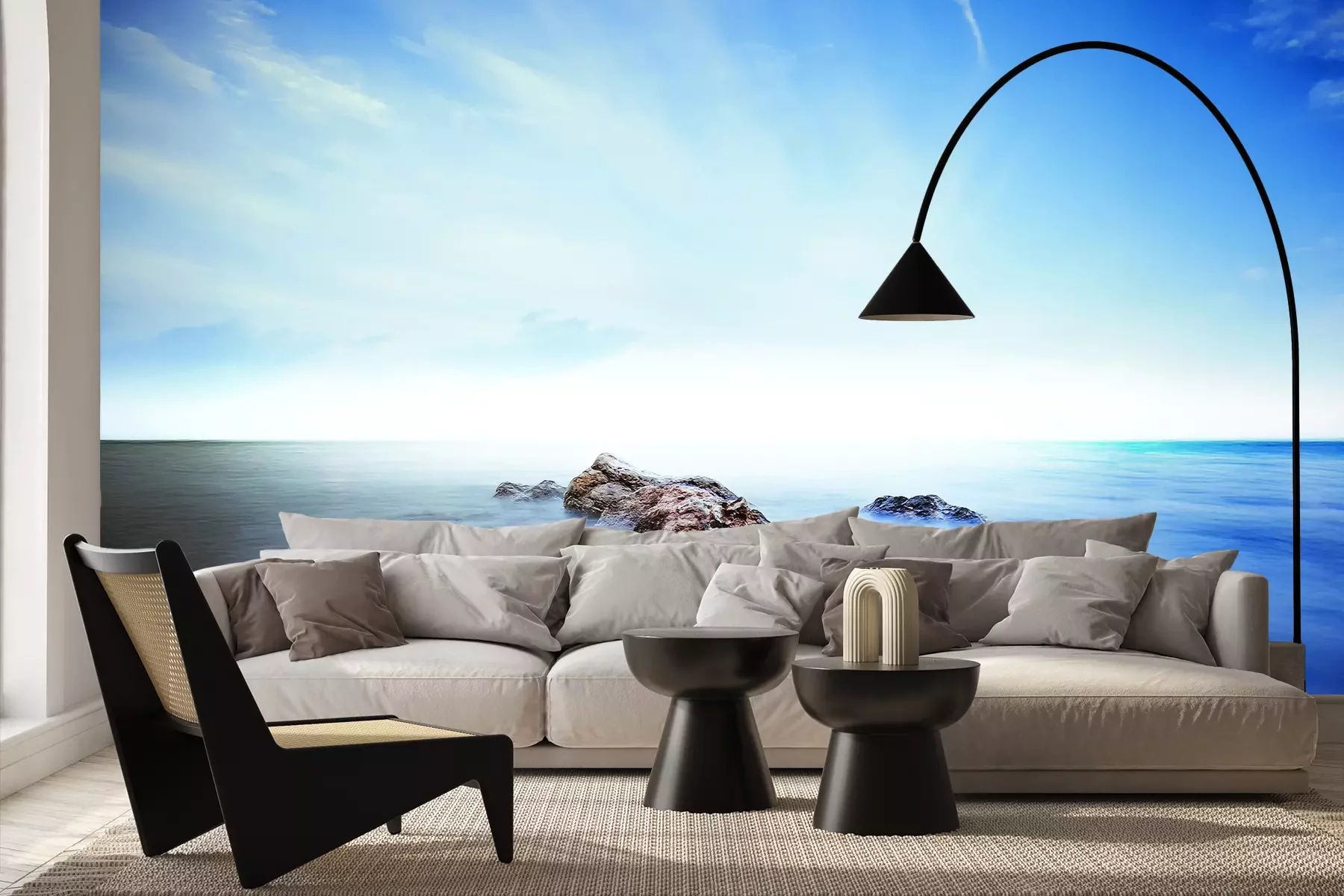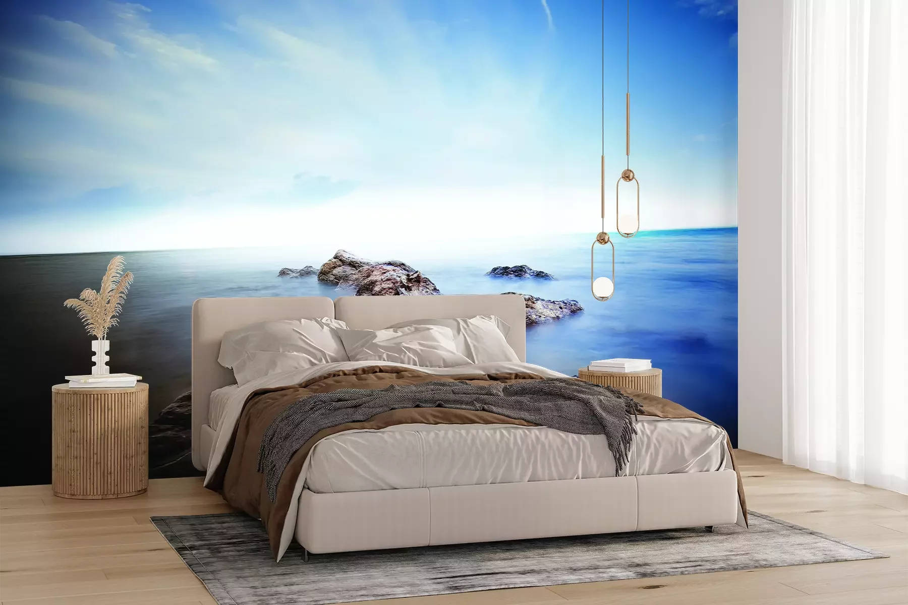 Het materiaal Premium+ is een gestructureerd vinyl op vlies met een gewicht van 255 g/m², dat kleine oneffenheden in de muur effectief camoufleert. De subtiele structuur van fijn zand geeft het oppervlak een exclusieve uitstraling, terwijl de halfmatte afwerking de diepte van de kleuren benadrukt. Het materiaal is dampdoorlatend, waardoor het ook in de keuken en badkamer kan worden gebruikt. De maximale breedte van één baan bedraagt 100 cm – bij grotere afmetingen wordt het fotobehang in meerdere gelijke banen verdeeld. De lijm wordt direct op de muur aangebracht en het behang wordt rand-aan-rand geplakt, wat zorgt voor een esthetisch resultaat zonder zichtbare naden. Het oppervlak kan gemakkelijk worden schoongemaakt door het voorzichtig af te nemen met een vochtige doek.