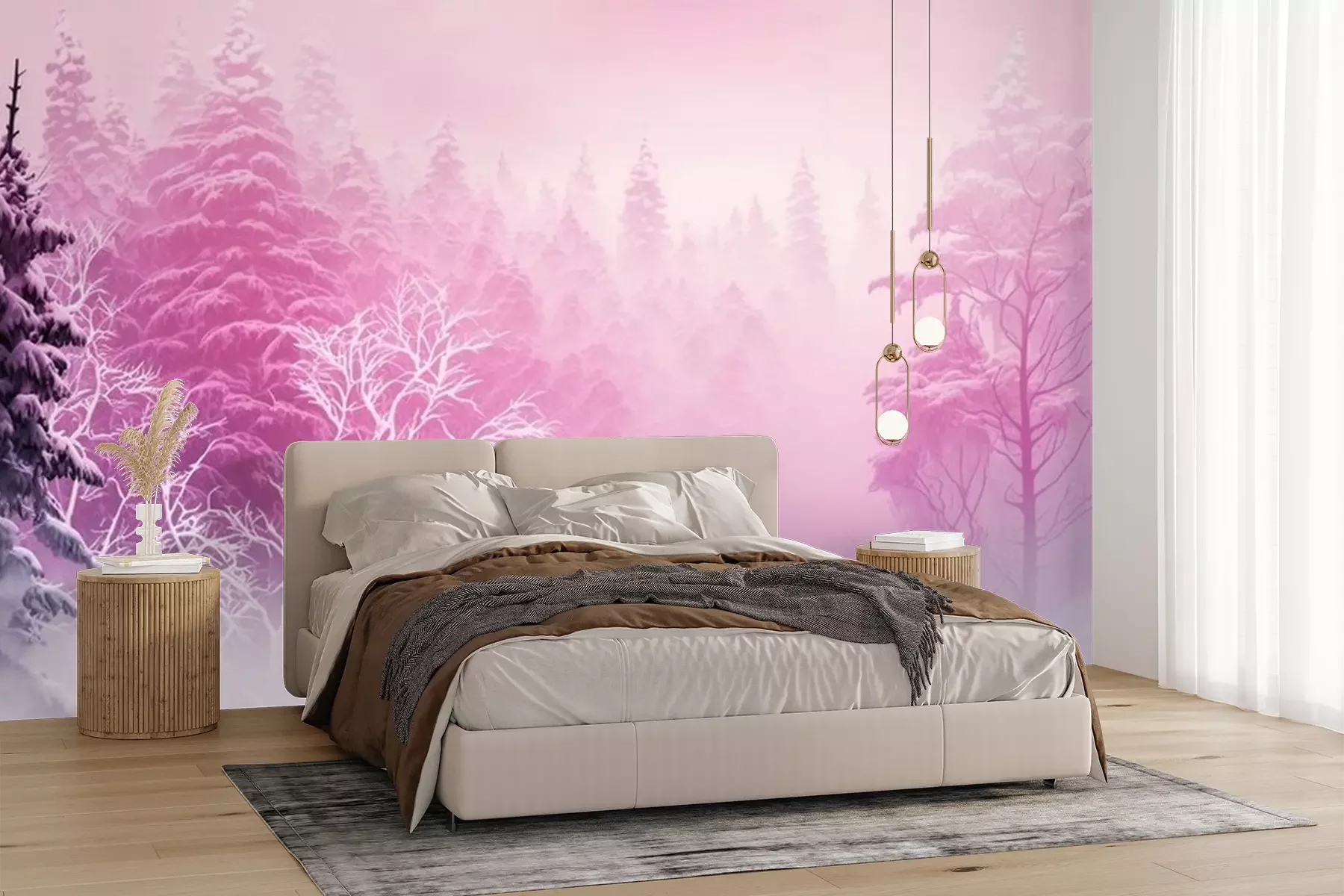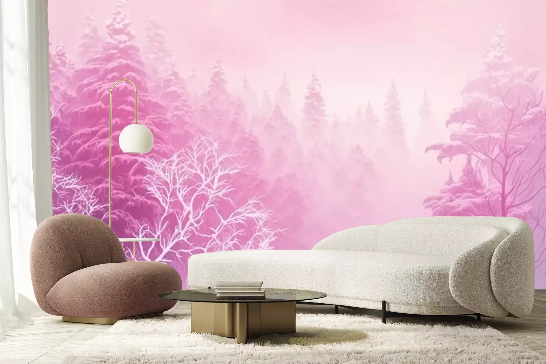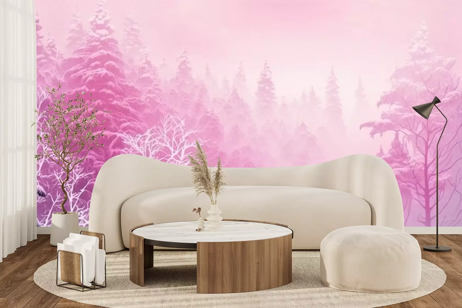 Fotobehang Roze aura boven de bomen in het bos