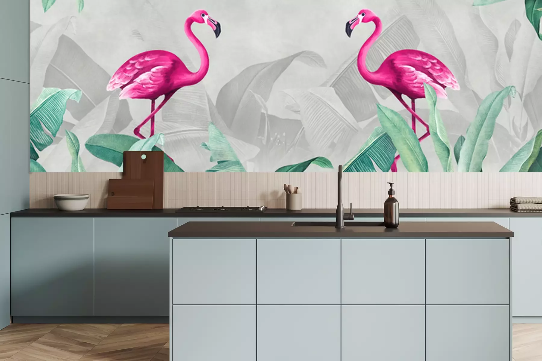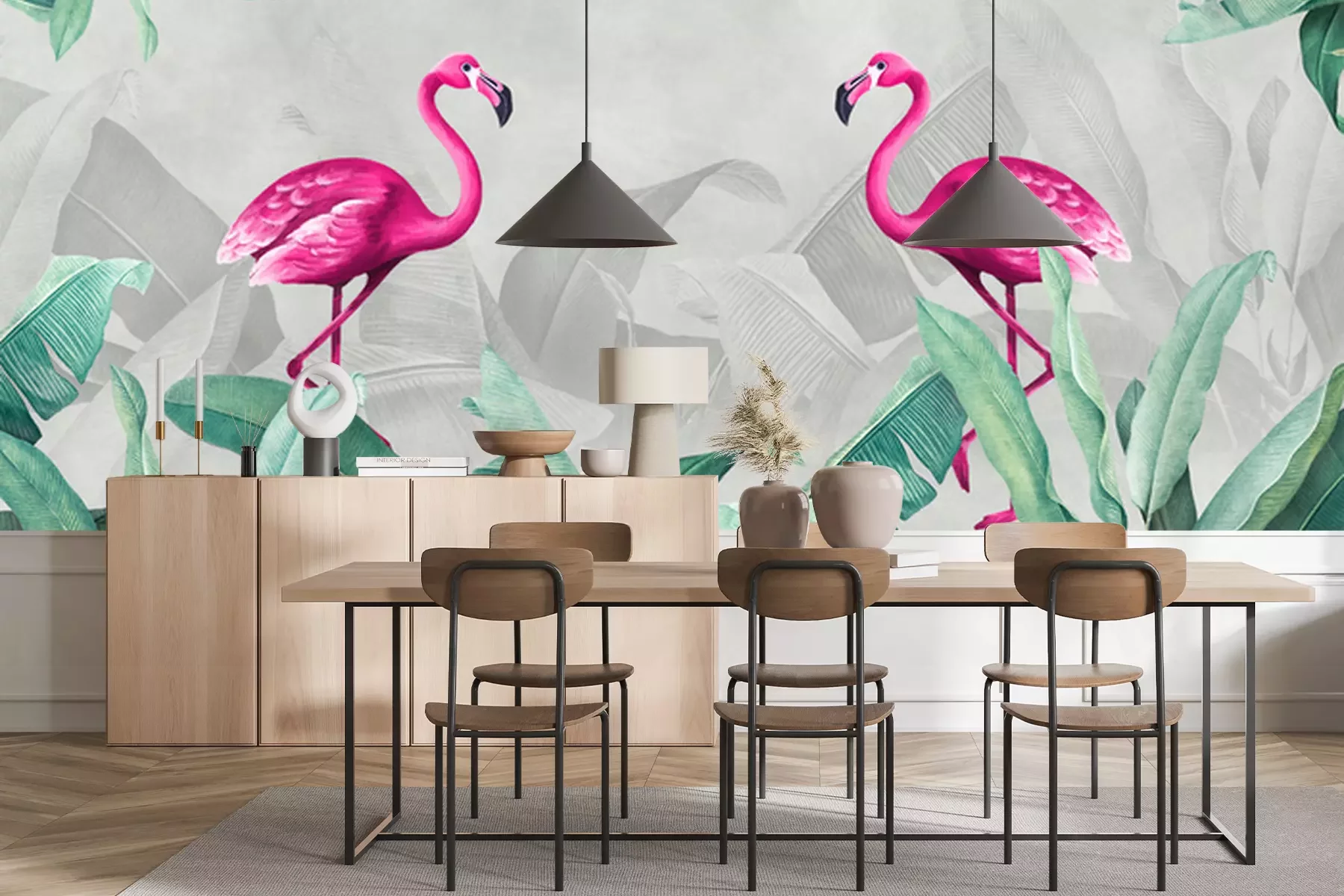 Fotobehang Roze flamingo's tussen bladeren op grijze achtergrond