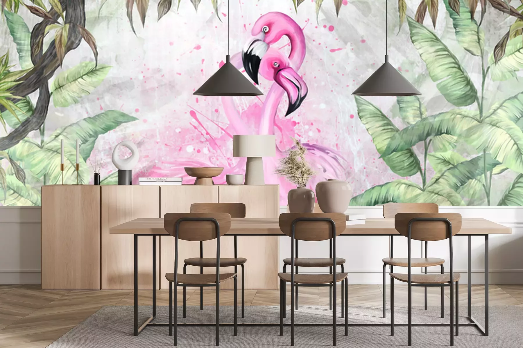 Fotobehang Roze flamingo's tussen grote tropische bladeren