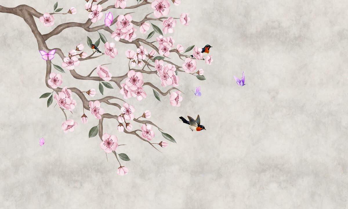 Fotobehang: Roze kersenbloesems met vogels op beton