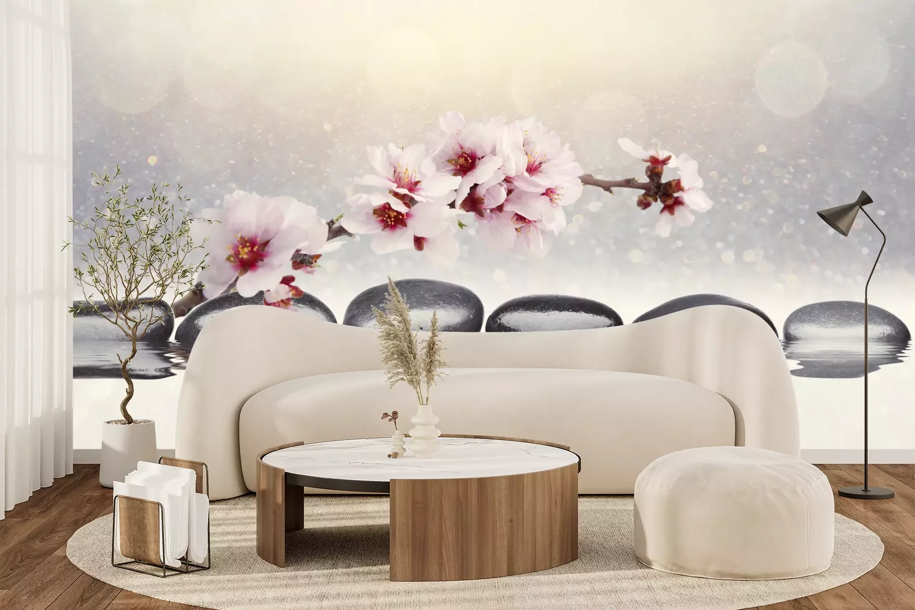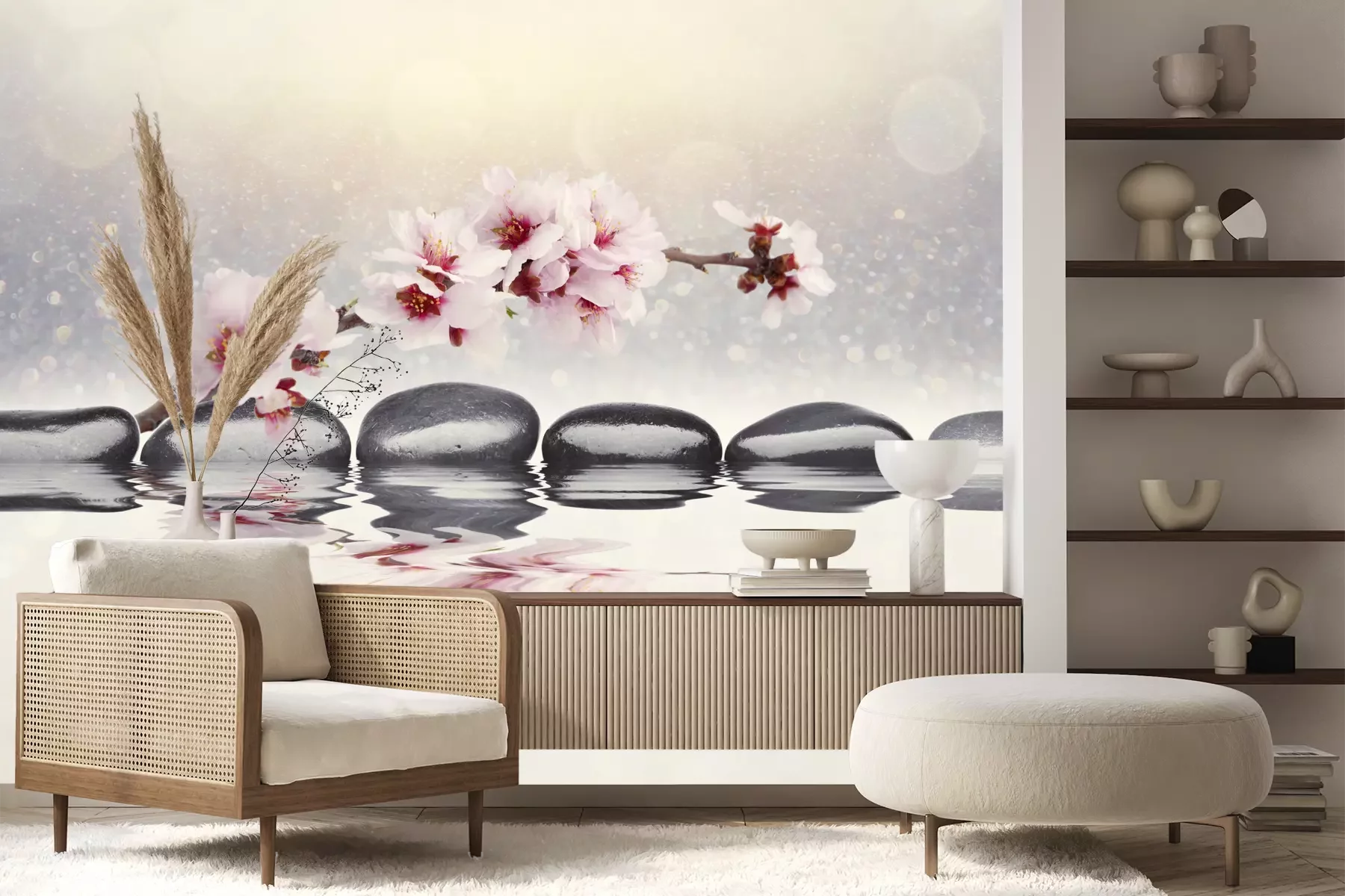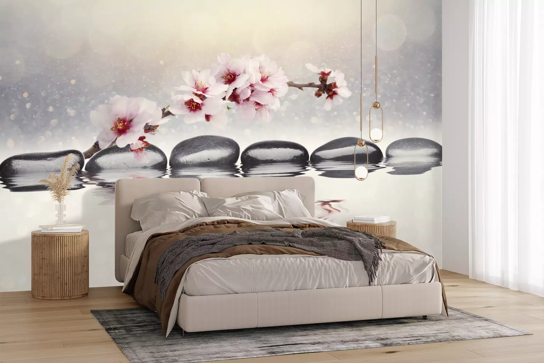 Het materiaal Premium+ is een gestructureerd vinyl op vlies met een gewicht van 255 g/m², dat kleine oneffenheden in de muur effectief camoufleert. De subtiele structuur van fijn zand geeft het oppervlak een exclusieve uitstraling, terwijl de halfmatte afwerking de diepte van de kleuren benadrukt. Het materiaal is dampdoorlatend, waardoor het ook in de keuken en badkamer kan worden gebruikt. De maximale breedte van één baan bedraagt 100 cm – bij grotere afmetingen wordt het fotobehang in meerdere gelijke banen verdeeld. De lijm wordt direct op de muur aangebracht en het behang wordt rand-aan-rand geplakt, wat zorgt voor een esthetisch resultaat zonder zichtbare naden. Het oppervlak kan gemakkelijk worden schoongemaakt door het voorzichtig af te nemen met een vochtige doek.