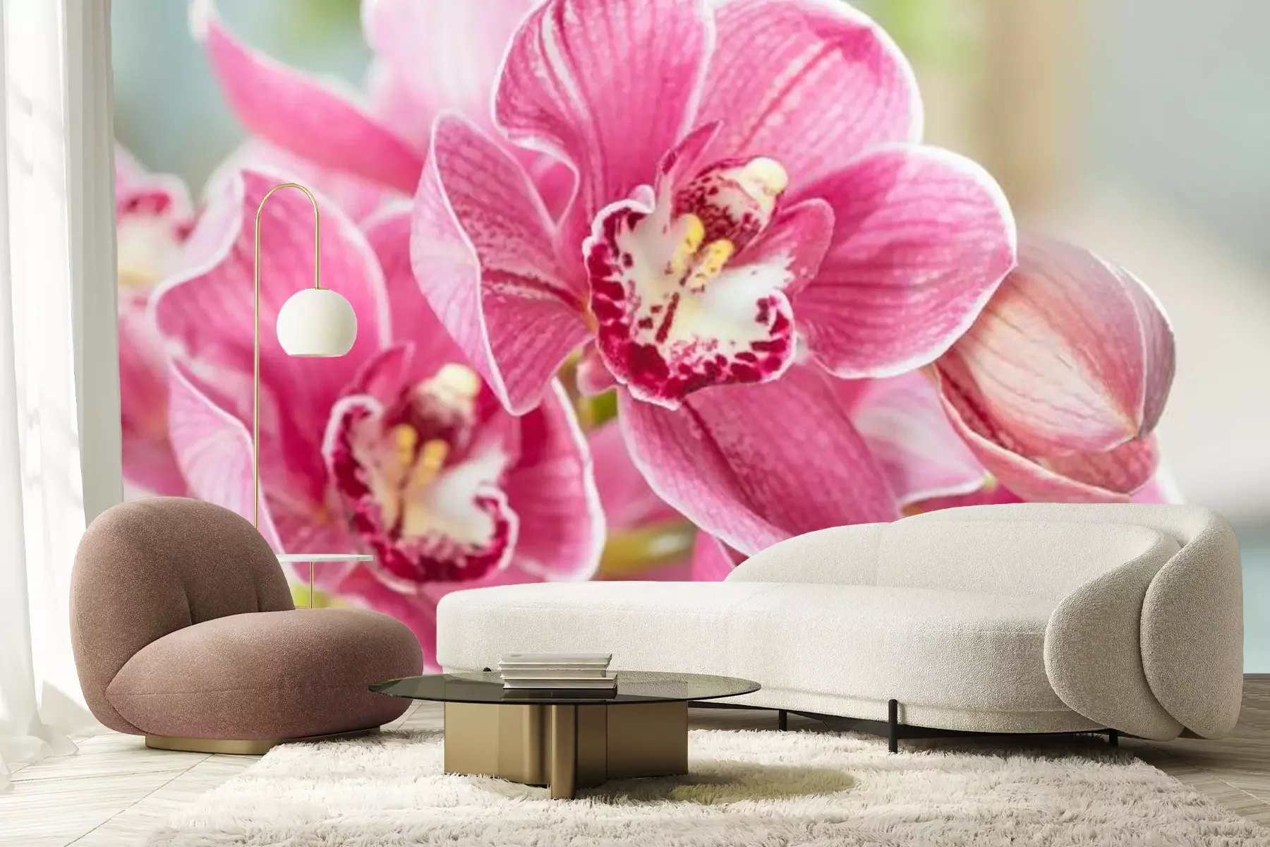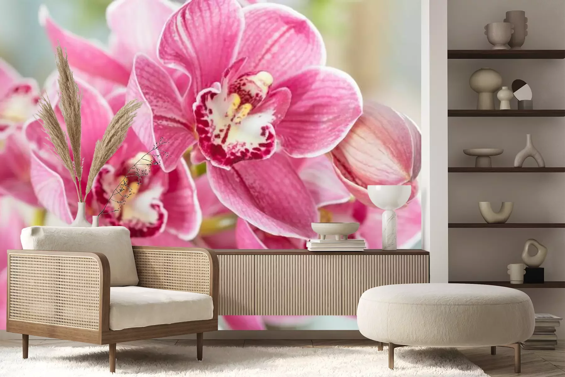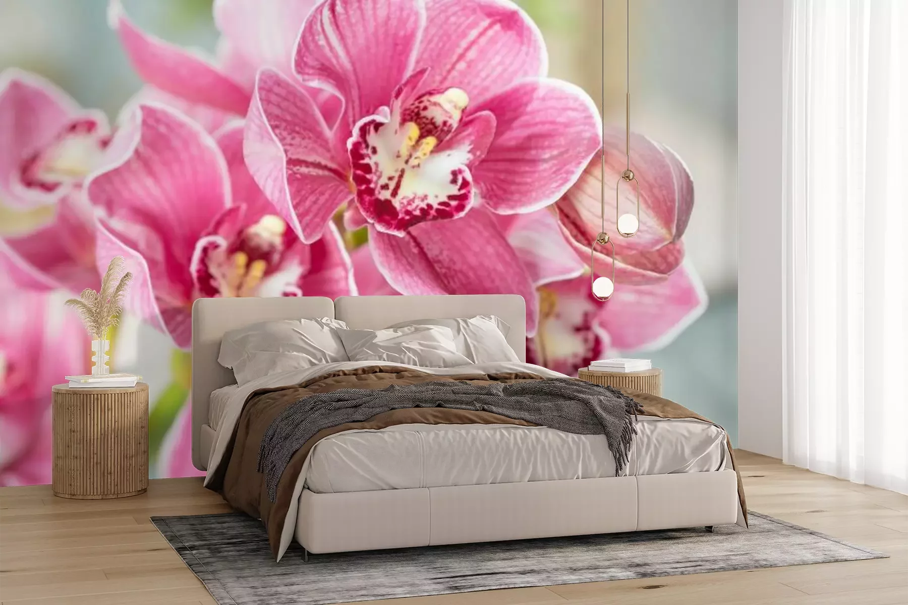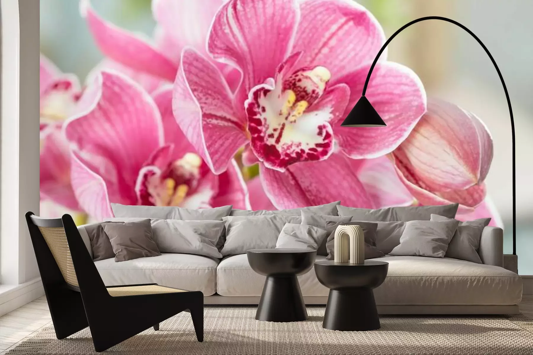Fotobehang Roze orchidee op een lichte achtergrond in minimalistische stijl