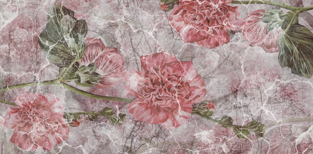 Fotobehang: Roze pioenrozen op een gebarsten muur