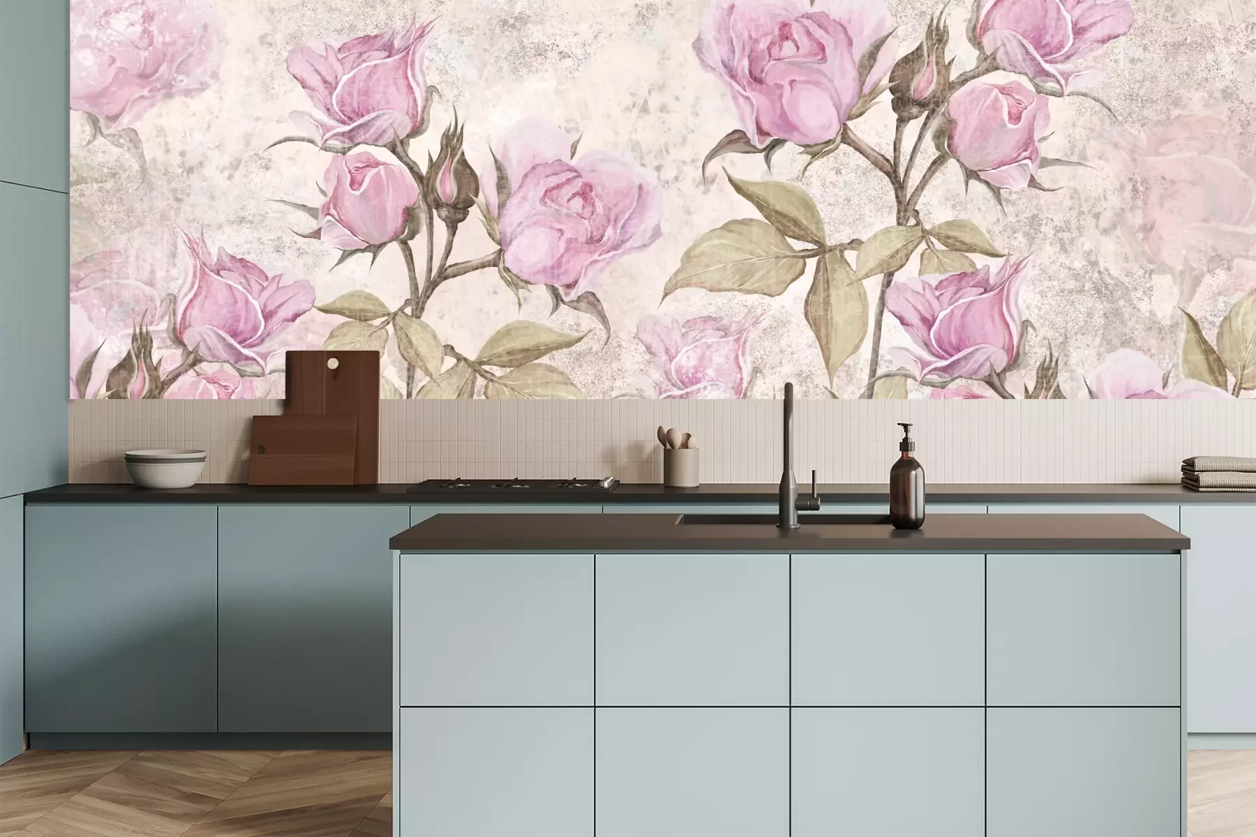 Het materiaal Premium is een glad vinyl op vlies, dat bestand is tegen uitrekken en vervorming. Het is dampdoorlatend – de muren kunnen vrij ademen – waardoor het geschikt is voor gebruik in de keuken en badkamer. Bij vervuiling kan het materiaal worden afgenomen met een vochtige doek. De maximale breedte van één baan bedraagt 95 of 105 cm, afhankelijk van de beschikbaarheid. Montage vindt plaats met de rand-aan-rand methode, wat een esthetisch resultaat zonder zichtbare naden oplevert. Omdat de lijm rechtstreeks op de muur wordt aangebracht, verloopt de installatie van het fotobehang snel en eenvoudig.