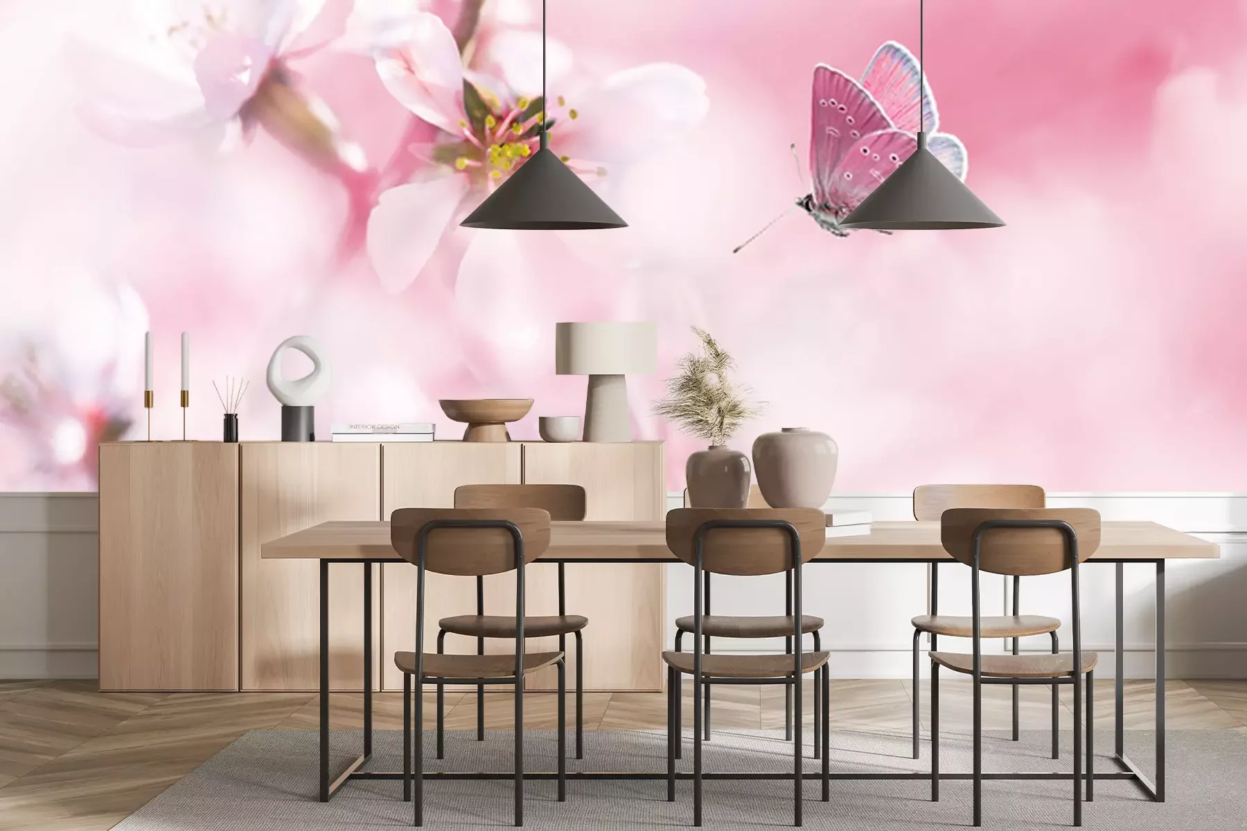 Fotobehang Roze vlinder op achtergrond van een amandelboompje