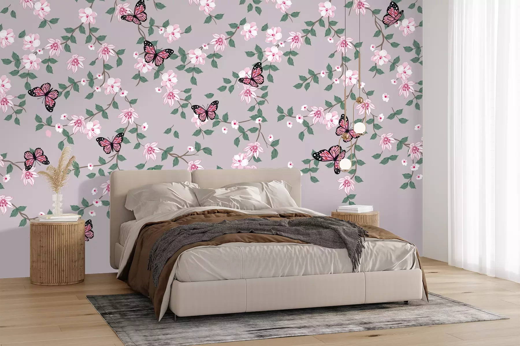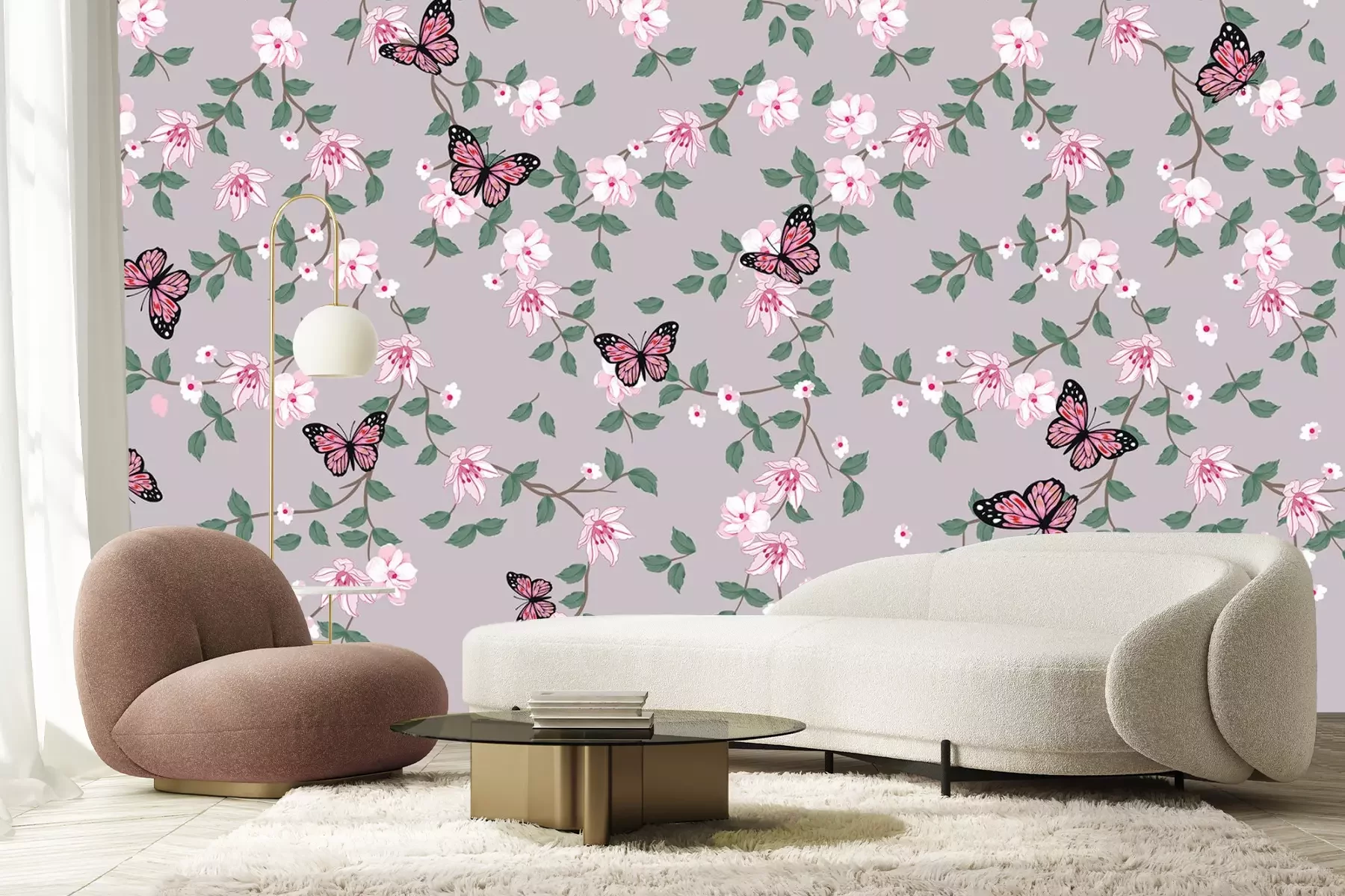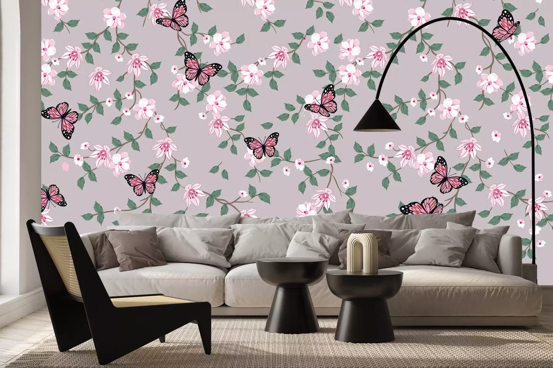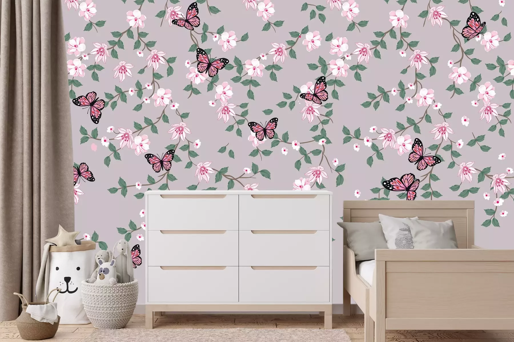 Roze vlinders en bloemen op takken met groen blad botanisch patroon