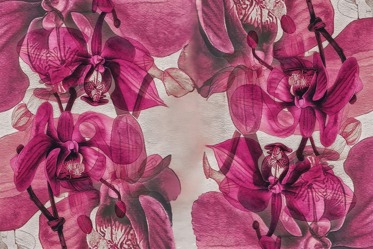 Fotobehang: Ruimtelijk geschilderde orchideeën op de muur