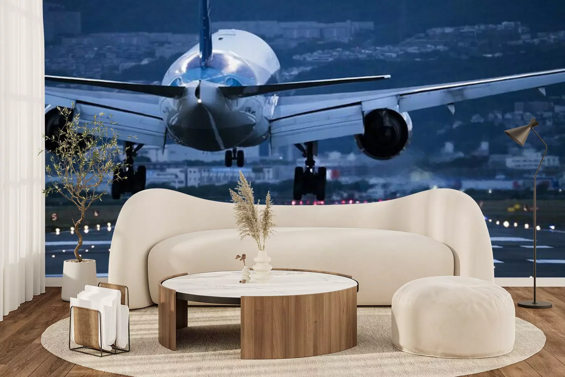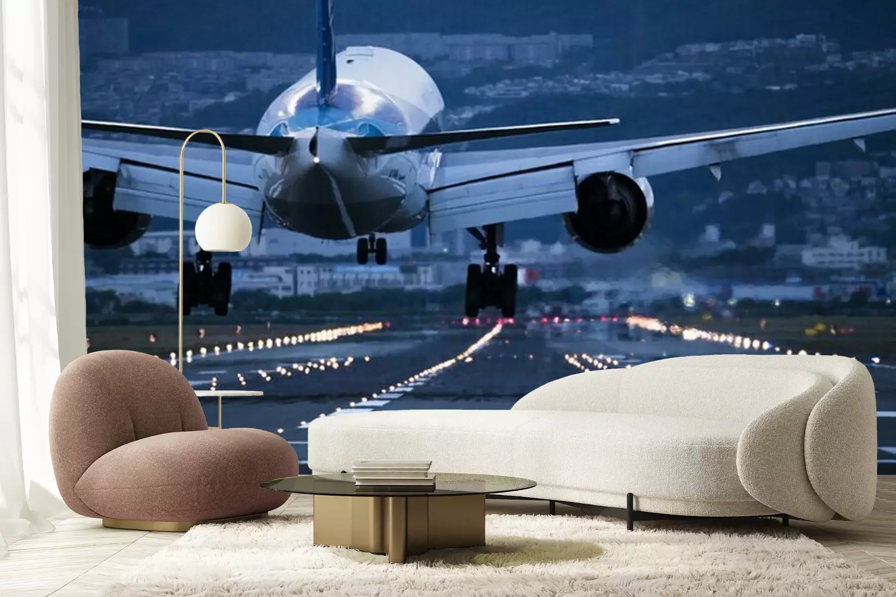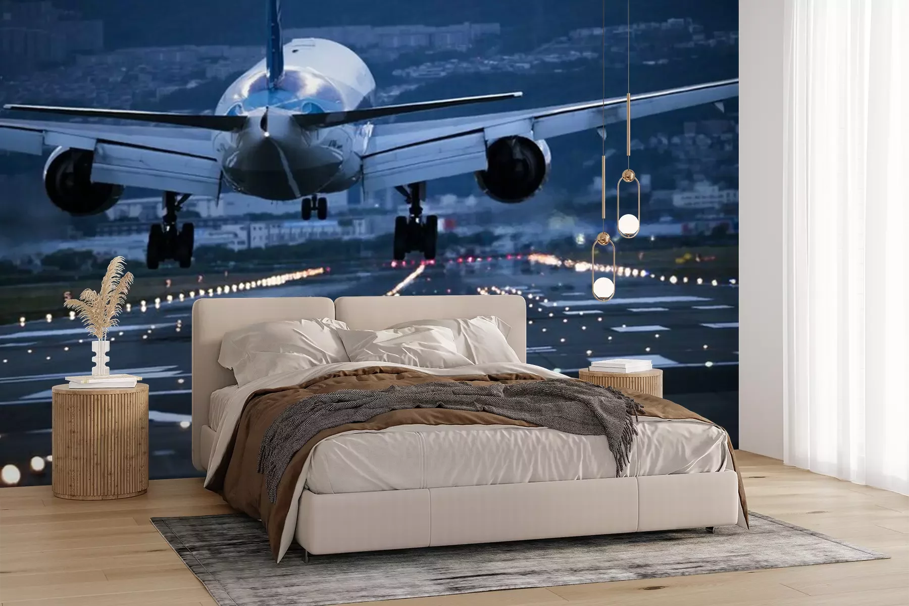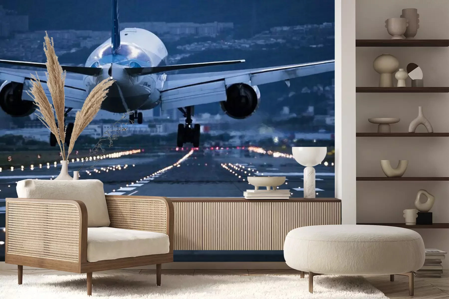Fotobehang 'S Avonds gaat het vliegtuig op de landingsbaan landen