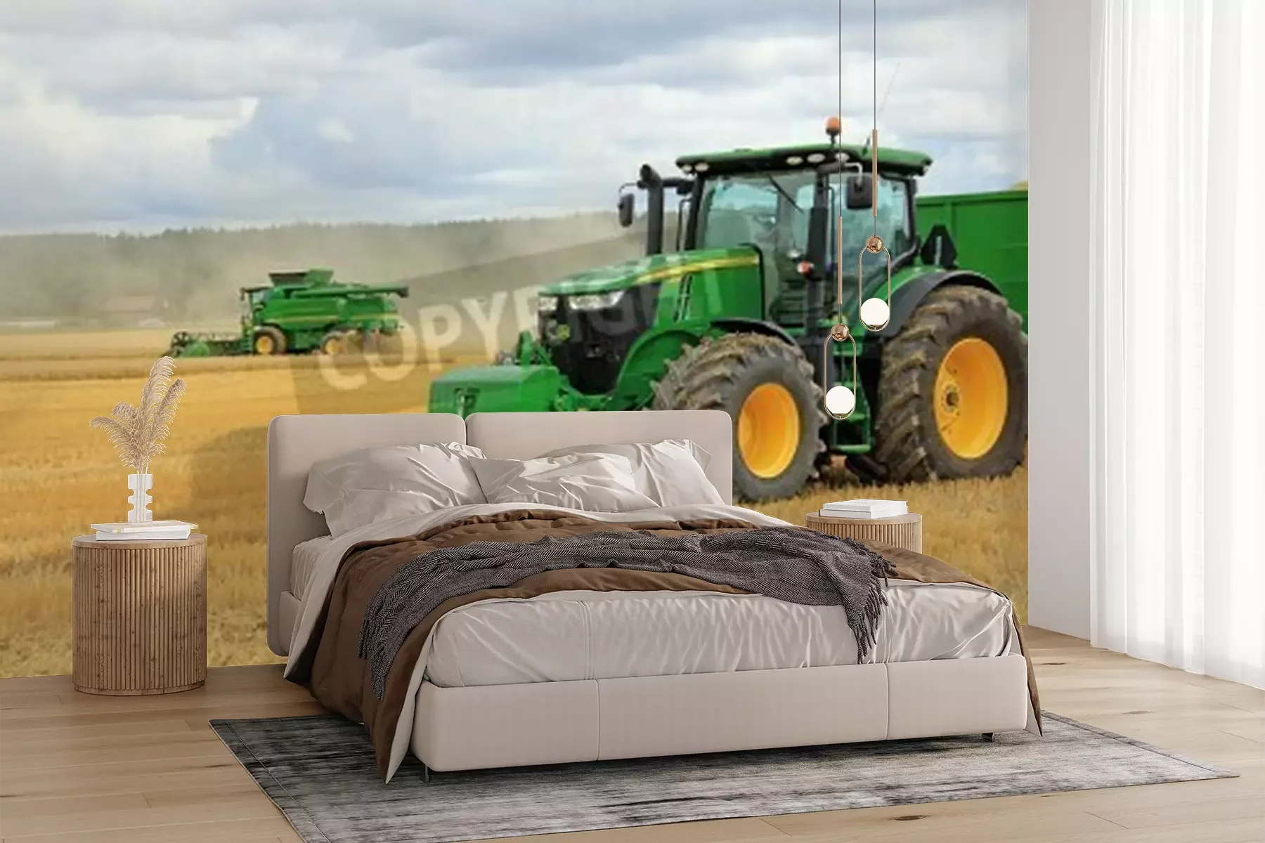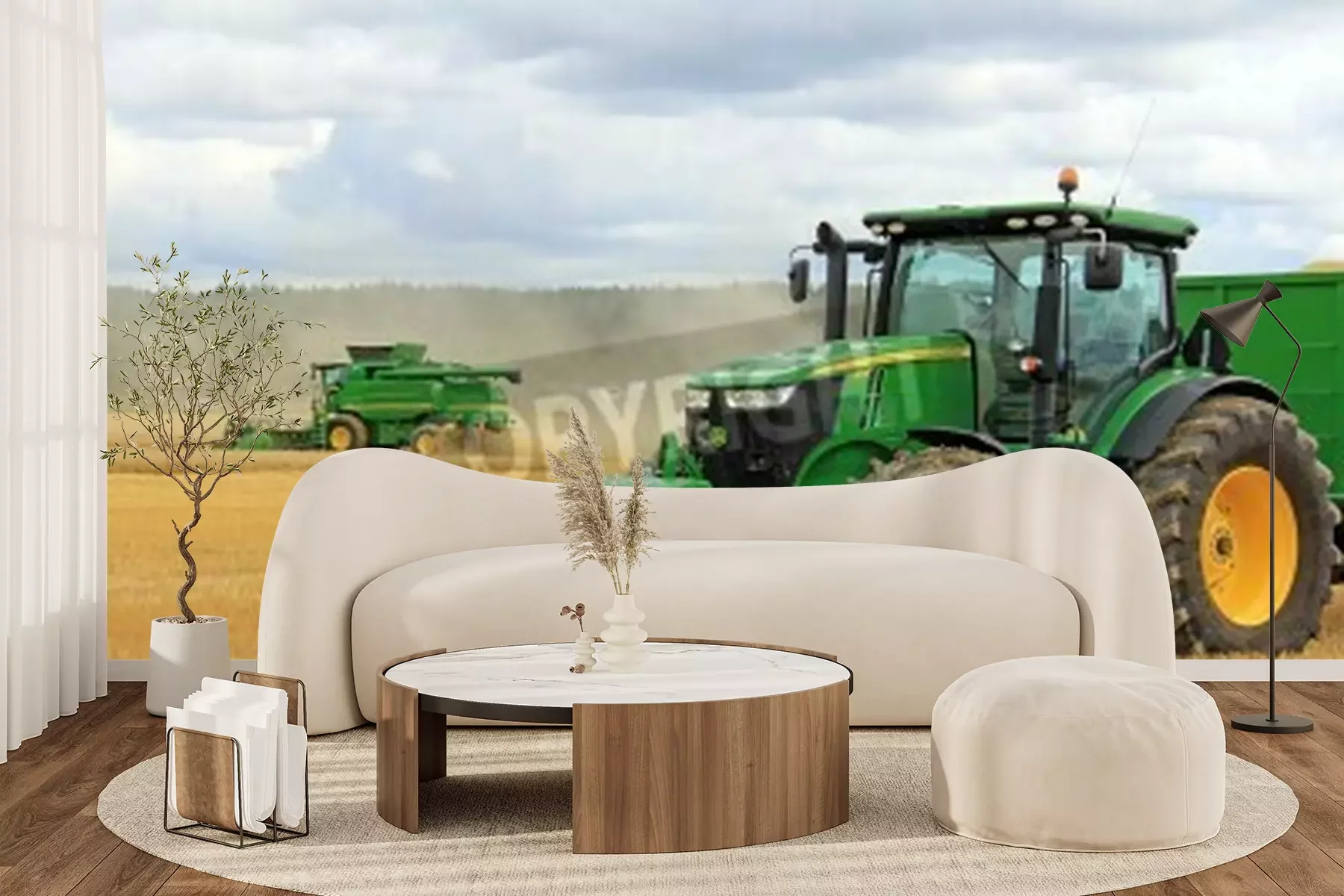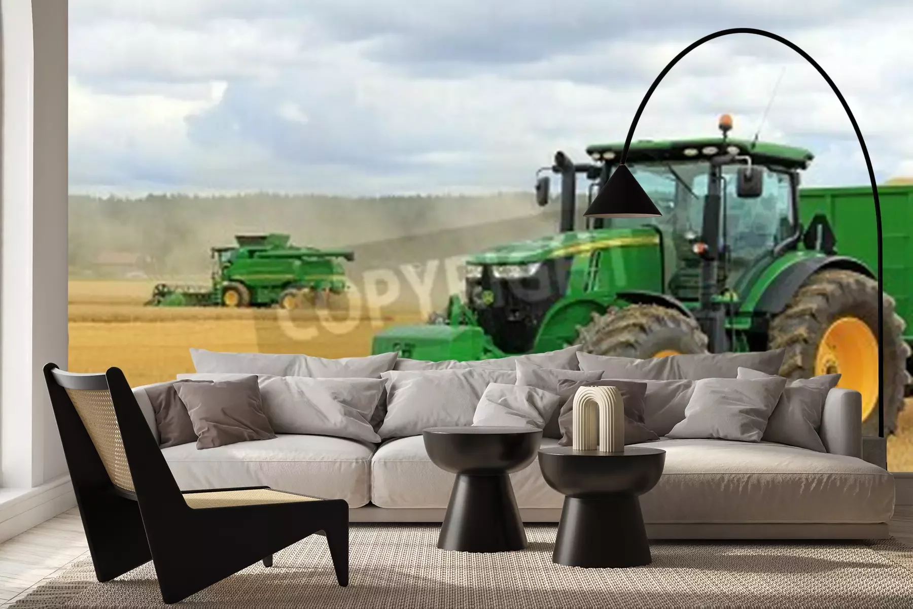 Fotobehang SALO, Finland - 10 augustus John Deere 7280R Landbouw Tractor en Modern Maaidorser T560 weergegeven op de jaarlijkse Puontin Peltopaivat Agricultural Show in Salo, Finland op 10 augustus 2013