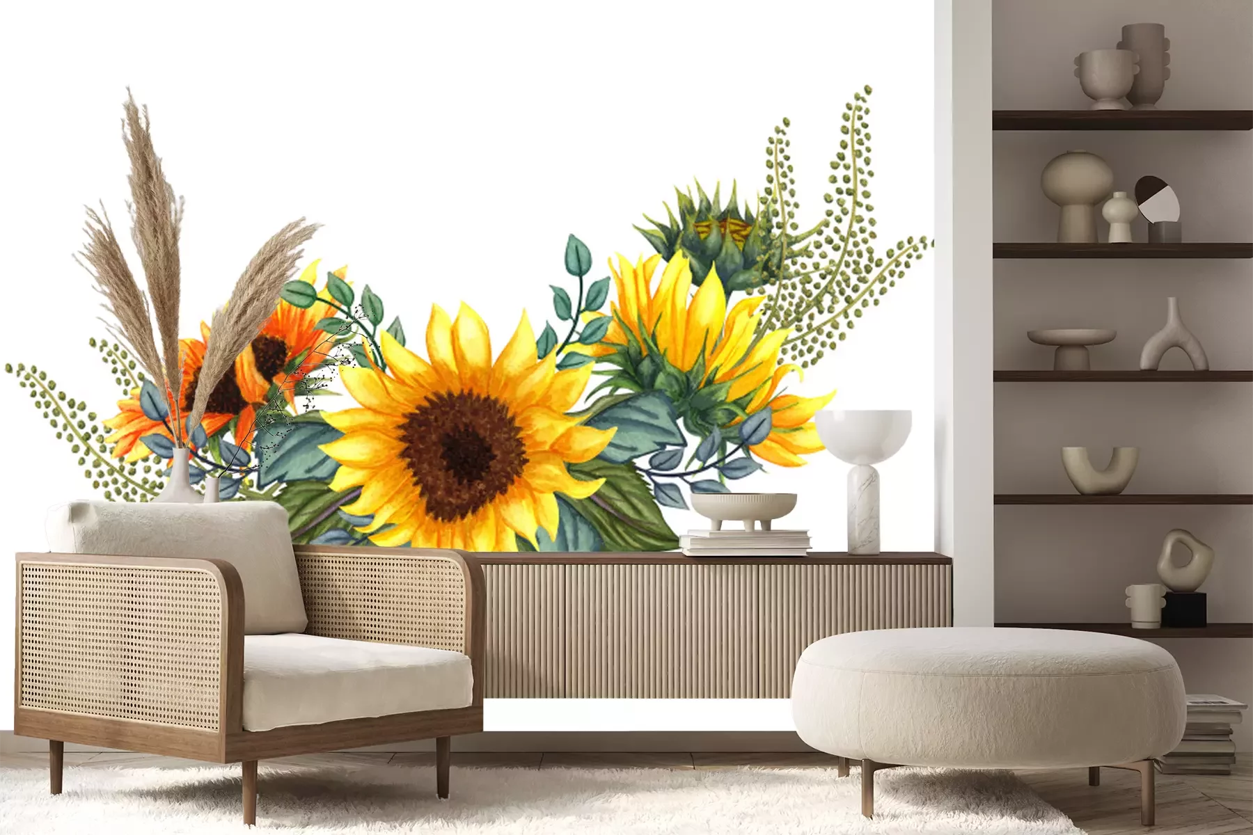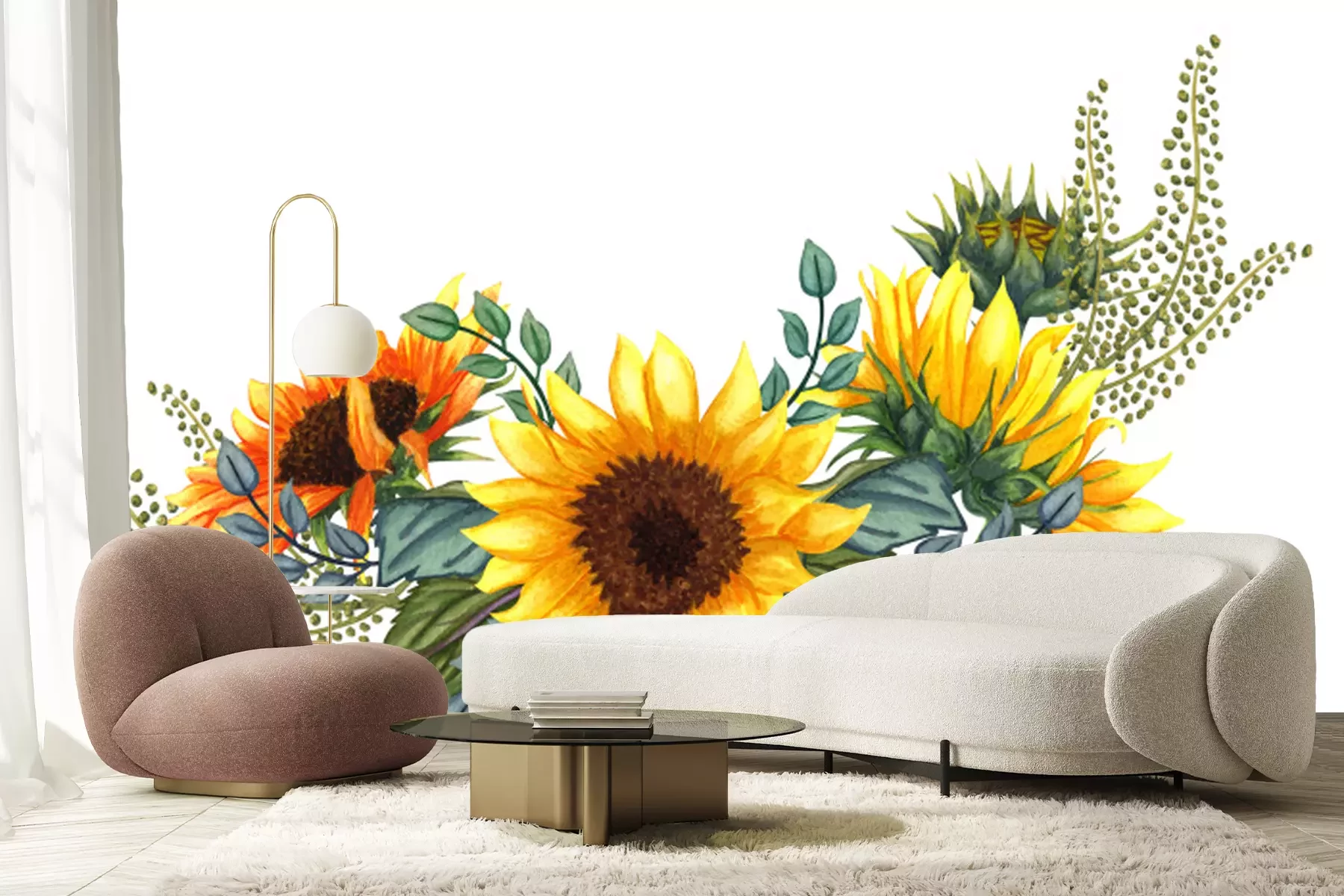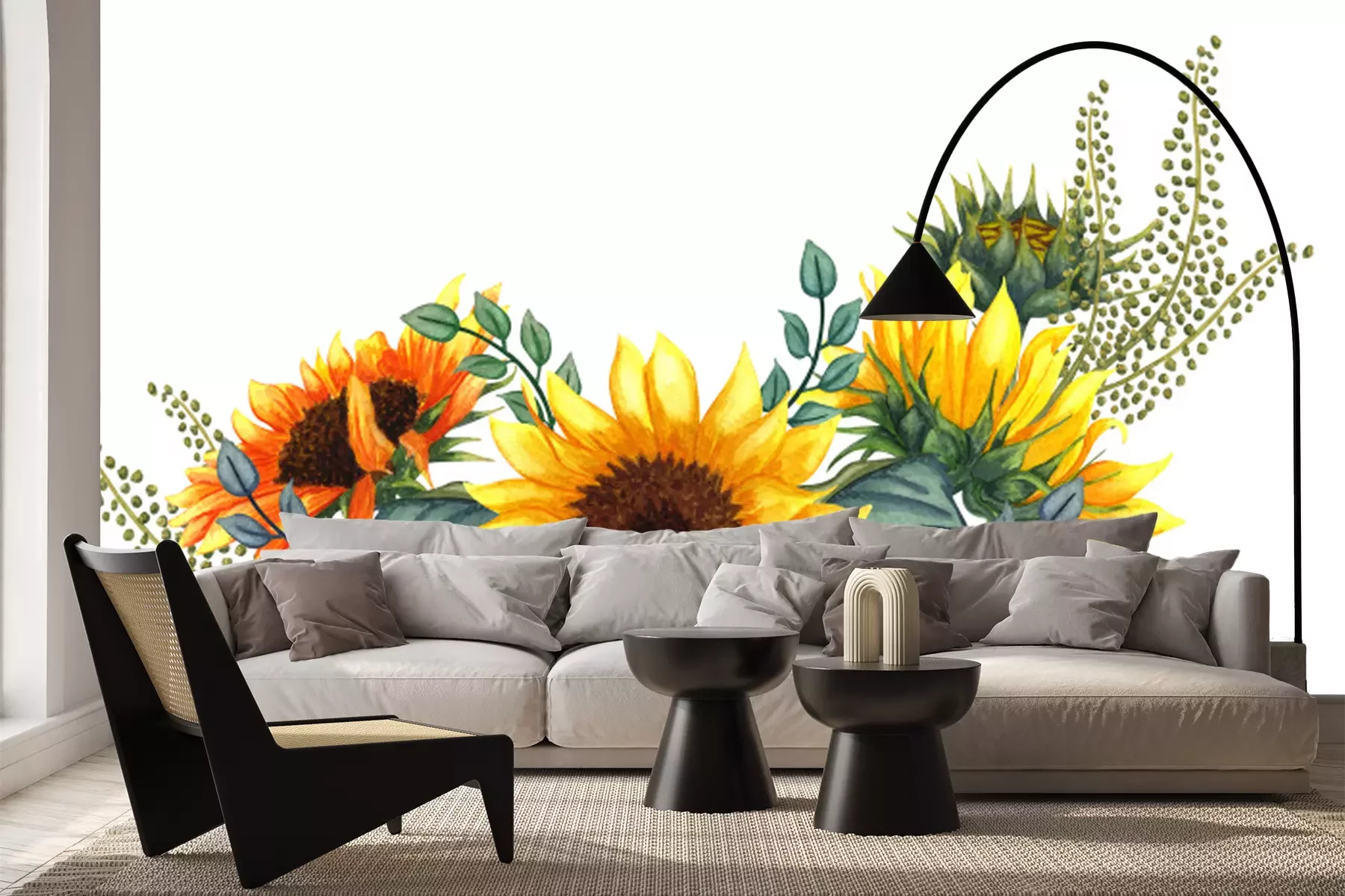 Fotobehang Samenstelling van zonnebloemen en bladeren