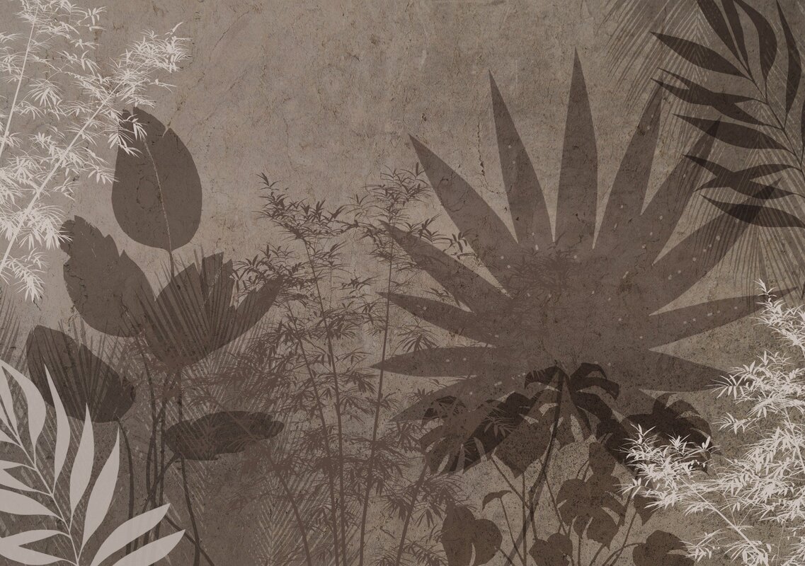 Fotobehang: Schaduwen van tropische bladeren op een bruine achtergrond