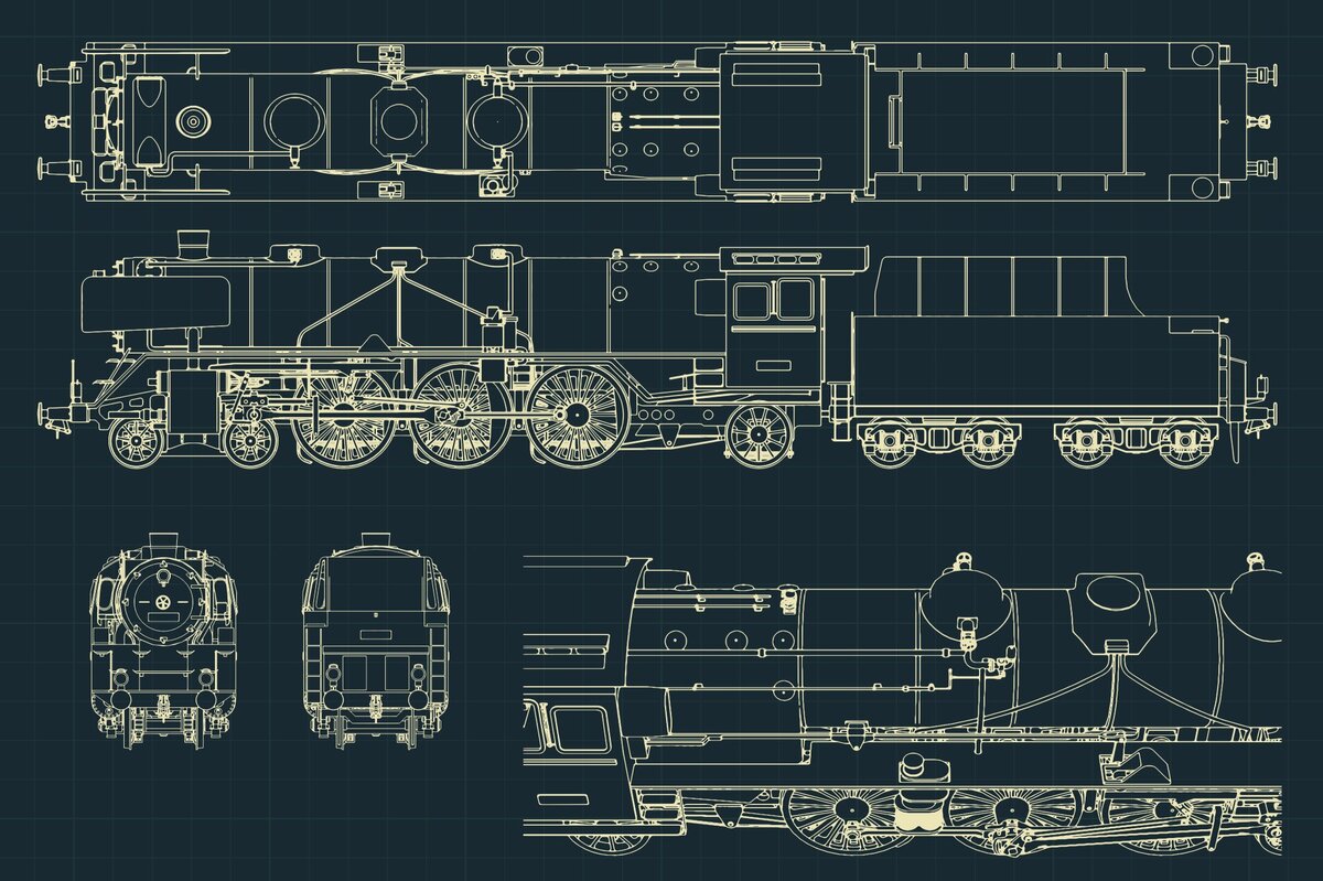 Fotobehang: Schets van de mechanische onderdelen van de locomotief