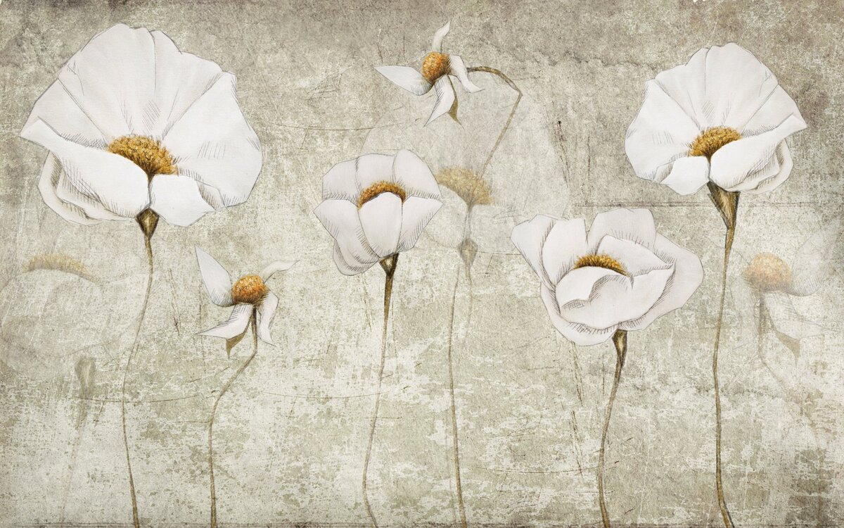 Fotobehang: Schets van witte bloemen op een moderne betonnen achtergrond