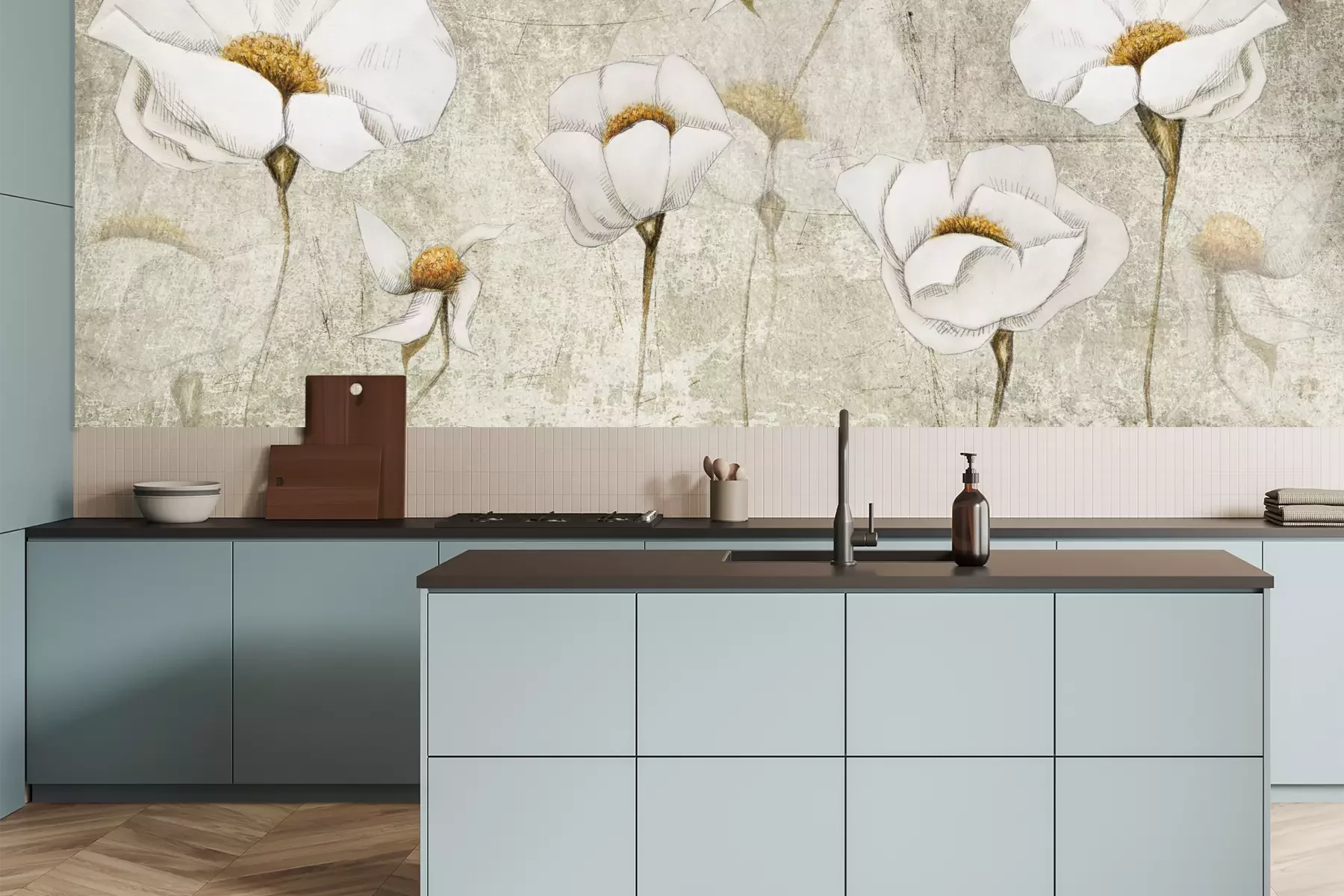 Het materiaal Premium is een glad vinyl op vlies, dat bestand is tegen uitrekken en vervorming. Het is dampdoorlatend – de muren kunnen vrij ademen – waardoor het geschikt is voor gebruik in de keuken en badkamer. Bij vervuiling kan het materiaal worden afgenomen met een vochtige doek. De maximale breedte van één baan bedraagt 95 of 105 cm, afhankelijk van de beschikbaarheid. Montage vindt plaats met de rand-aan-rand methode, wat een esthetisch resultaat zonder zichtbare naden oplevert. Omdat de lijm rechtstreeks op de muur wordt aangebracht, verloopt de installatie van het fotobehang snel en eenvoudig.