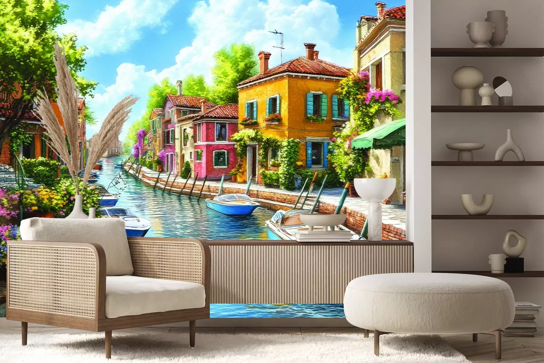 Het materiaal Premium+ is een gestructureerd vinyl op vlies met een gewicht van 255 g/m², dat kleine oneffenheden in de muur effectief camoufleert. De subtiele structuur van fijn zand geeft het oppervlak een exclusieve uitstraling, terwijl de halfmatte afwerking de diepte van de kleuren benadrukt. Het materiaal is dampdoorlatend, waardoor het ook in de keuken en badkamer kan worden gebruikt. De maximale breedte van één baan bedraagt 100 cm – bij grotere afmetingen wordt het fotobehang in meerdere gelijke banen verdeeld. De lijm wordt direct op de muur aangebracht en het behang wordt rand-aan-rand geplakt, wat zorgt voor een esthetisch resultaat zonder zichtbare naden. Het oppervlak kan gemakkelijk worden schoongemaakt door het voorzichtig af te nemen met een vochtige doek.