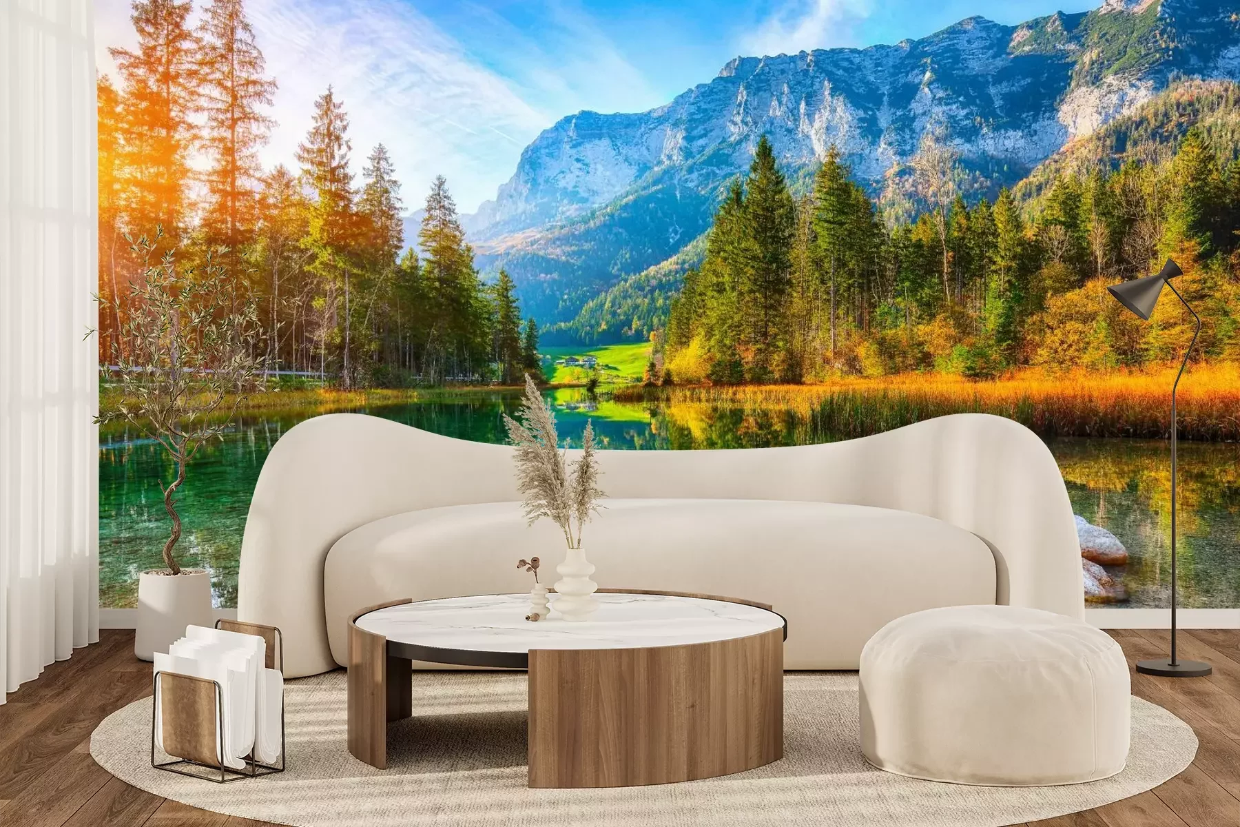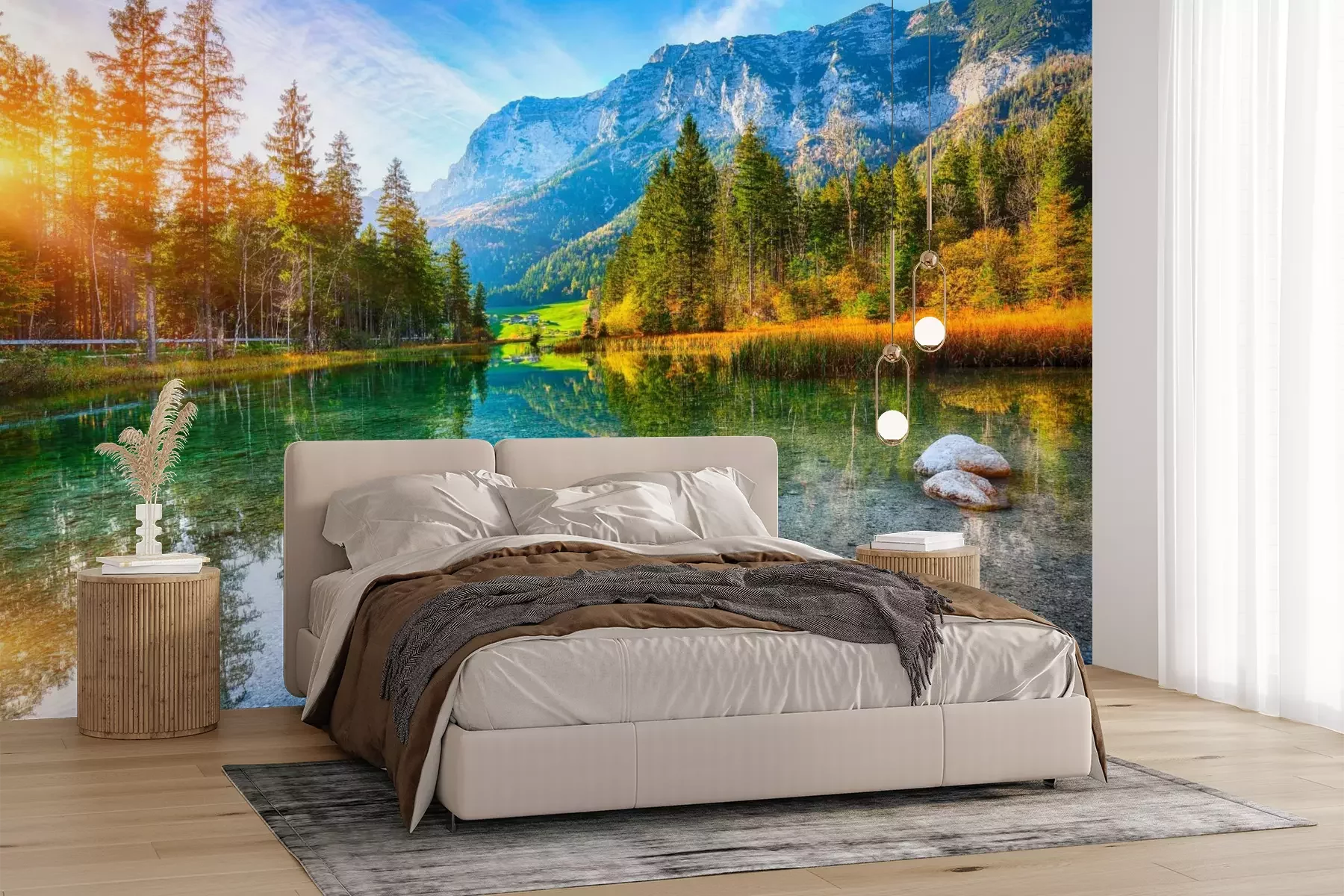 Het materiaal Premium+ is een gestructureerd vinyl op vlies met een gewicht van 255 g/m², dat kleine oneffenheden in de muur effectief camoufleert. De subtiele structuur van fijn zand geeft het oppervlak een exclusieve uitstraling, terwijl de halfmatte afwerking de diepte van de kleuren benadrukt. Het materiaal is dampdoorlatend, waardoor het ook in de keuken en badkamer kan worden gebruikt. De maximale breedte van één baan bedraagt 100 cm – bij grotere afmetingen wordt het fotobehang in meerdere gelijke banen verdeeld. De lijm wordt direct op de muur aangebracht en het behang wordt rand-aan-rand geplakt, wat zorgt voor een esthetisch resultaat zonder zichtbare naden. Het oppervlak kan gemakkelijk worden schoongemaakt door het voorzichtig af te nemen met een vochtige doek.