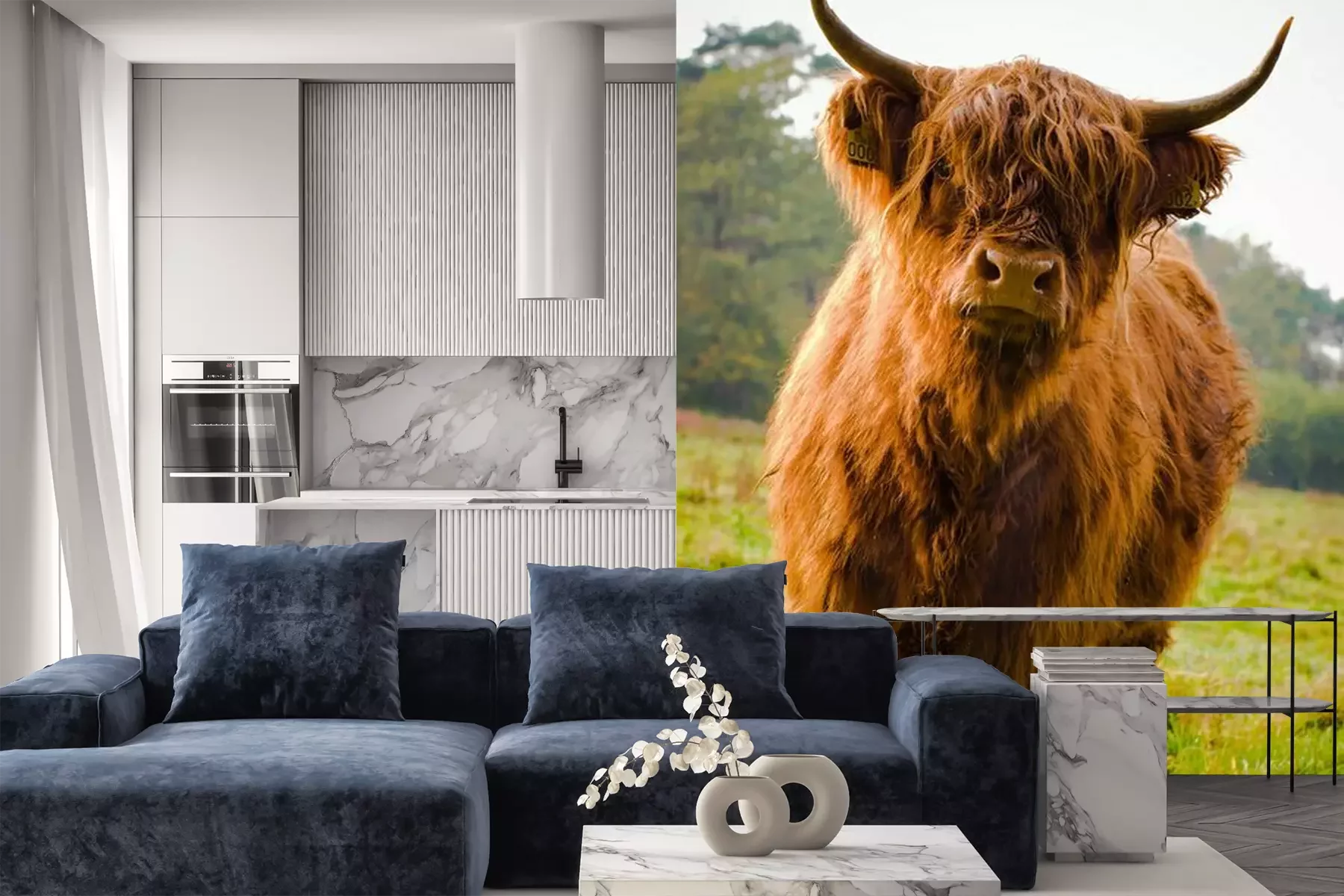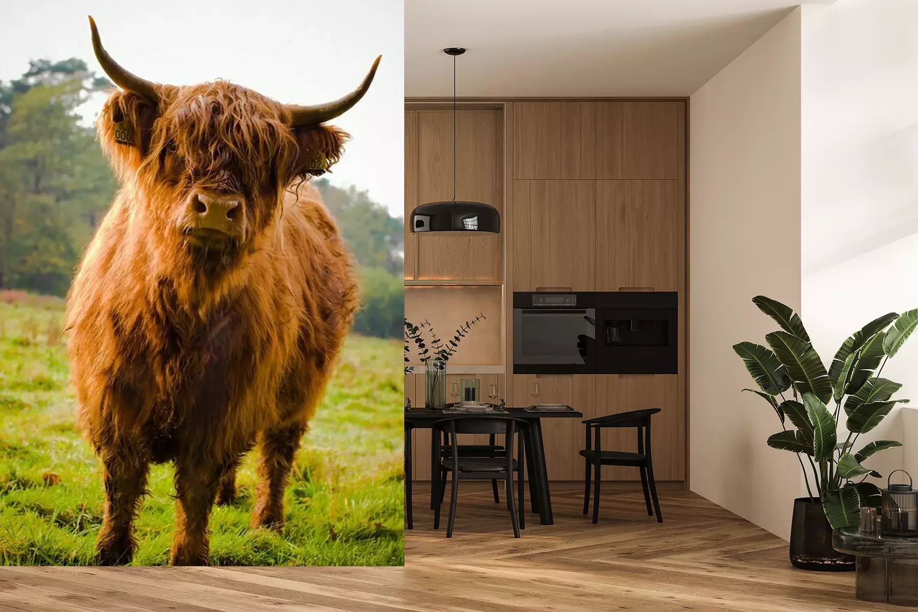 Het materiaal Premium is een glad vinyl op vlies, dat bestand is tegen uitrekken en vervorming. Het is dampdoorlatend – de muren kunnen vrij ademen – waardoor het geschikt is voor gebruik in de keuken en badkamer. Bij vervuiling kan het materiaal worden afgenomen met een vochtige doek. De maximale breedte van één baan bedraagt 95 of 105 cm, afhankelijk van de beschikbaarheid. Montage vindt plaats met de rand-aan-rand methode, wat een esthetisch resultaat zonder zichtbare naden oplevert. Omdat de lijm rechtstreeks op de muur wordt aangebracht, verloopt de installatie van het fotobehang snel en eenvoudig.