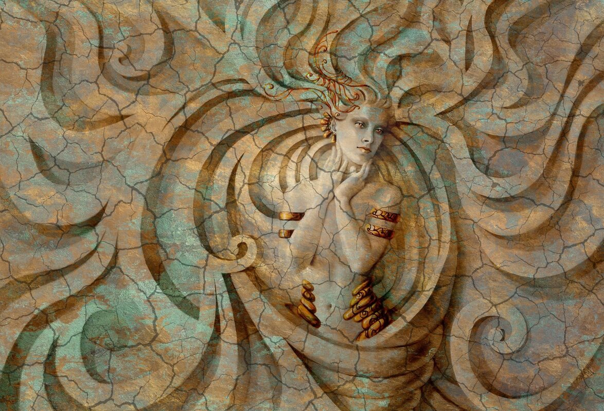 Sculpture of a woman in 3d style on a concrete-textured background