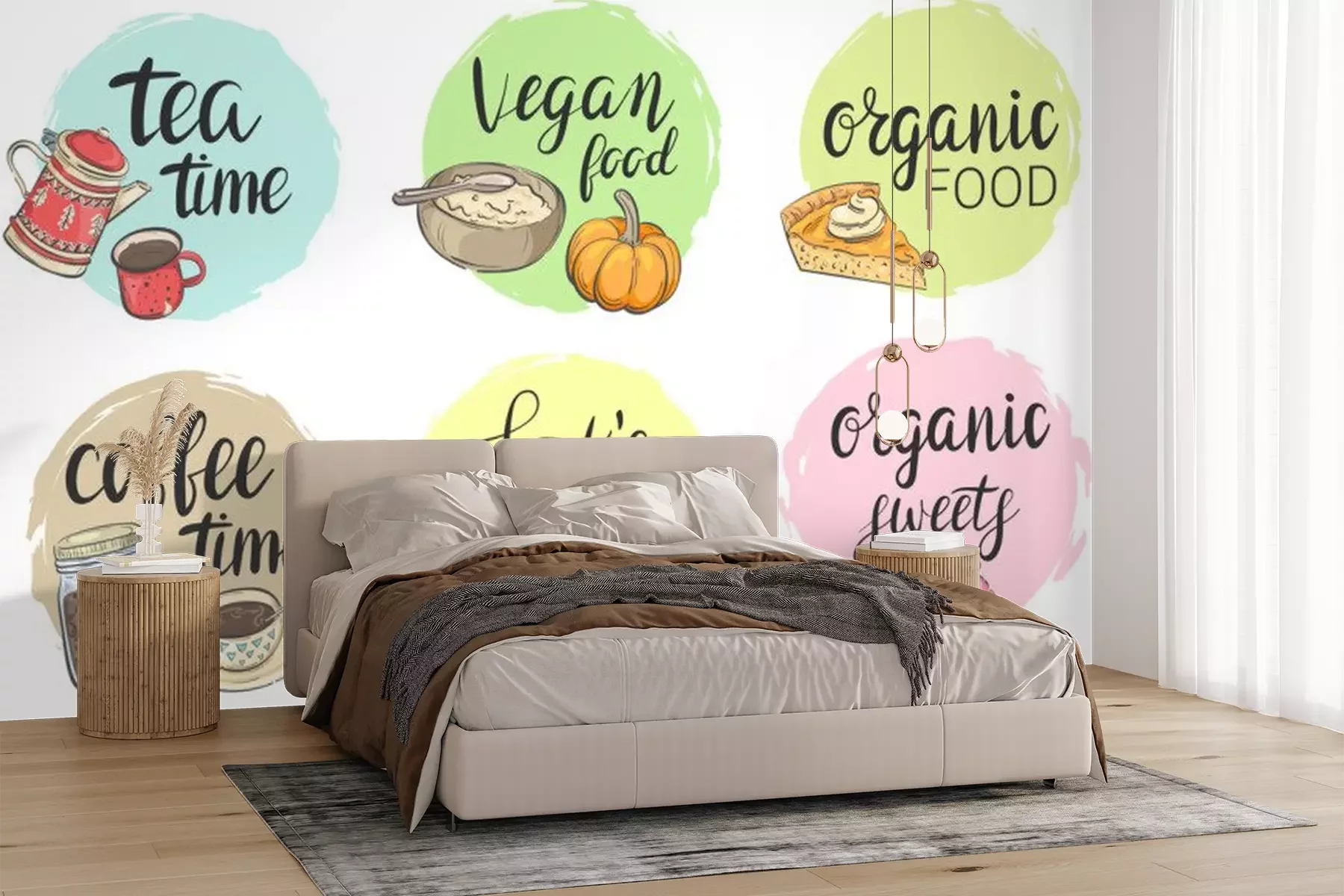 Fotobehang Set of round stickers with food and utensils. Coffee time, tea time, vegan food, let's cook, organic food, organic sweets