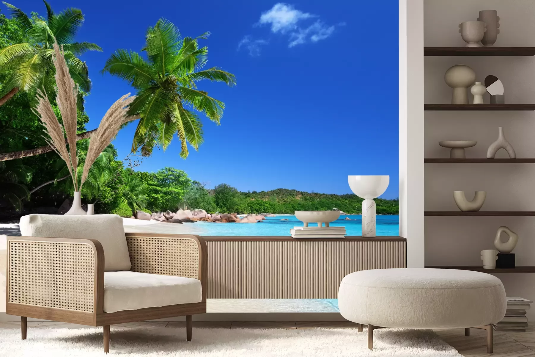 Het materiaal Premium+ is een gestructureerd vinyl op vlies met een gewicht van 255 g/m², dat kleine oneffenheden in de muur effectief camoufleert. De subtiele structuur van fijn zand geeft het oppervlak een exclusieve uitstraling, terwijl de halfmatte afwerking de diepte van de kleuren benadrukt. Het materiaal is dampdoorlatend, waardoor het ook in de keuken en badkamer kan worden gebruikt. De maximale breedte van één baan bedraagt 100 cm – bij grotere afmetingen wordt het fotobehang in meerdere gelijke banen verdeeld. De lijm wordt direct op de muur aangebracht en het behang wordt rand-aan-rand geplakt, wat zorgt voor een esthetisch resultaat zonder zichtbare naden. Het oppervlak kan gemakkelijk worden schoongemaakt door het voorzichtig af te nemen met een vochtige doek.