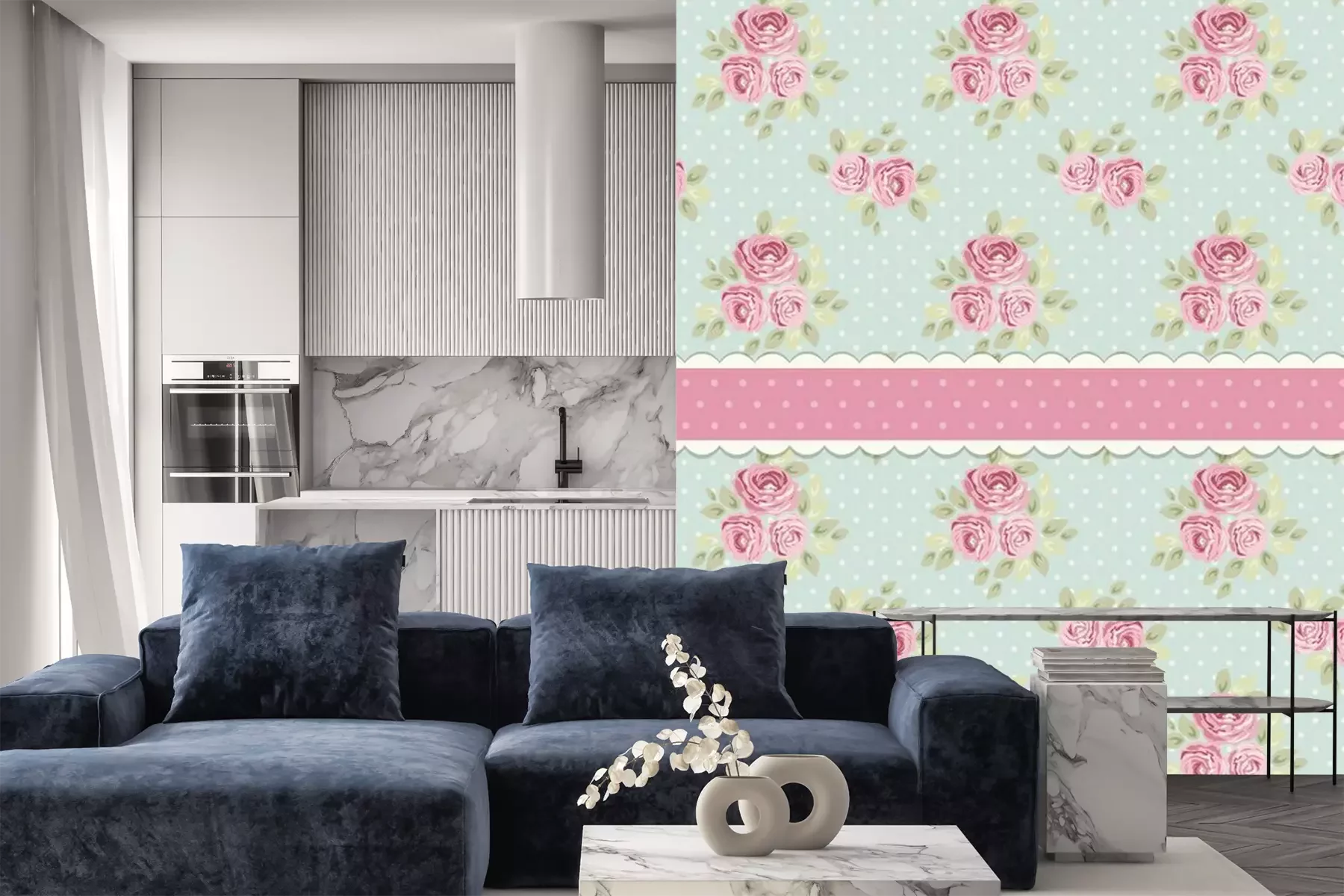 Het materiaal Premium is een glad vinyl op vlies, dat bestand is tegen uitrekken en vervorming. Het is dampdoorlatend – de muren kunnen vrij ademen – waardoor het geschikt is voor gebruik in de keuken en badkamer. Bij vervuiling kan het materiaal worden afgenomen met een vochtige doek. De maximale breedte van één baan bedraagt 95 of 105 cm, afhankelijk van de beschikbaarheid. Montage vindt plaats met de rand-aan-rand methode, wat een esthetisch resultaat zonder zichtbare naden oplevert. Omdat de lijm rechtstreeks op de muur wordt aangebracht, verloopt de installatie van het fotobehang snel en eenvoudig.