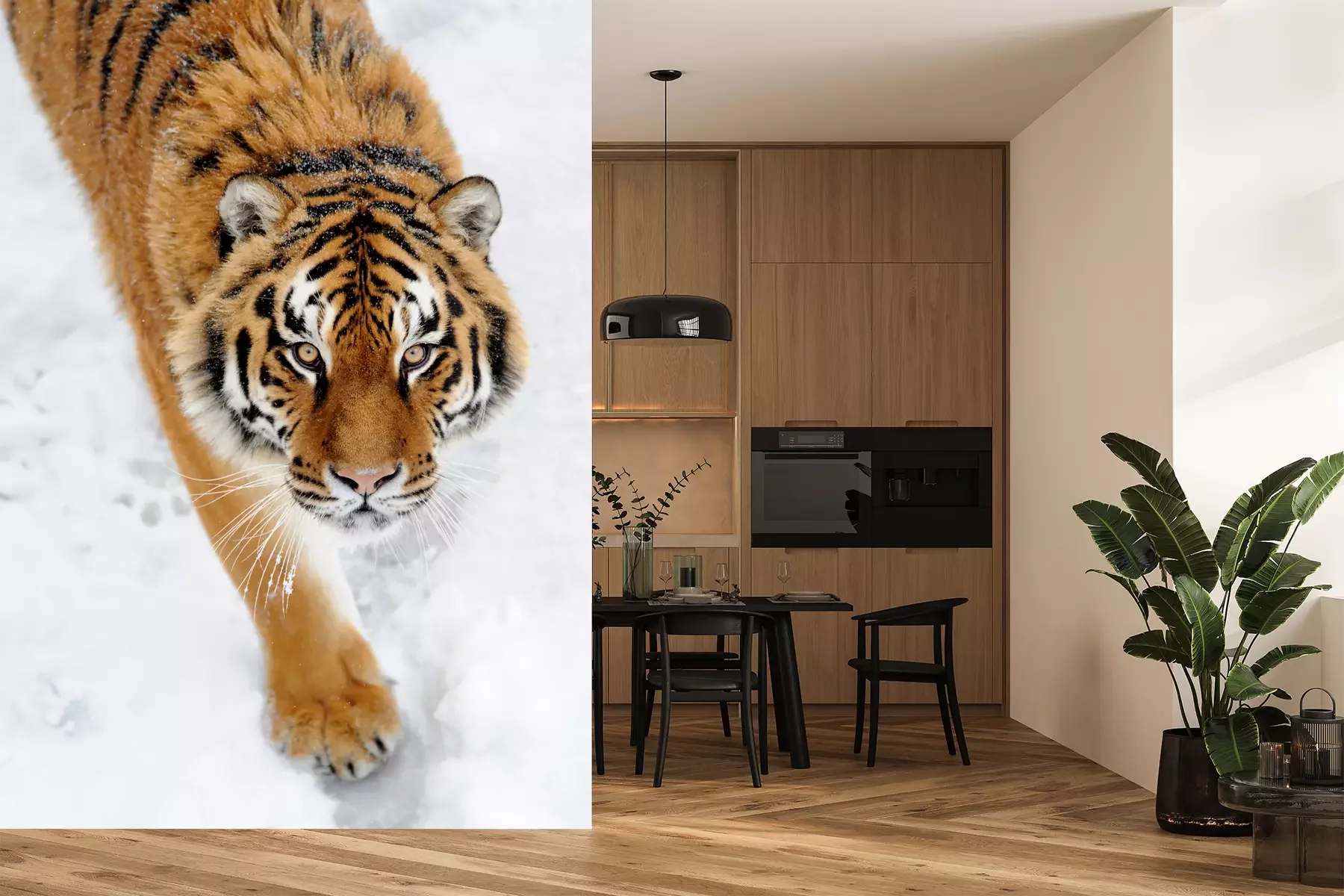 Het materiaal Premium is een glad vinyl op vlies, dat bestand is tegen uitrekken en vervorming. Het is dampdoorlatend – de muren kunnen vrij ademen – waardoor het geschikt is voor gebruik in de keuken en badkamer. Bij vervuiling kan het materiaal worden afgenomen met een vochtige doek. De maximale breedte van één baan bedraagt 95 of 105 cm, afhankelijk van de beschikbaarheid. Montage vindt plaats met de rand-aan-rand methode, wat een esthetisch resultaat zonder zichtbare naden oplevert. Omdat de lijm rechtstreeks op de muur wordt aangebracht, verloopt de installatie van het fotobehang snel en eenvoudig.
