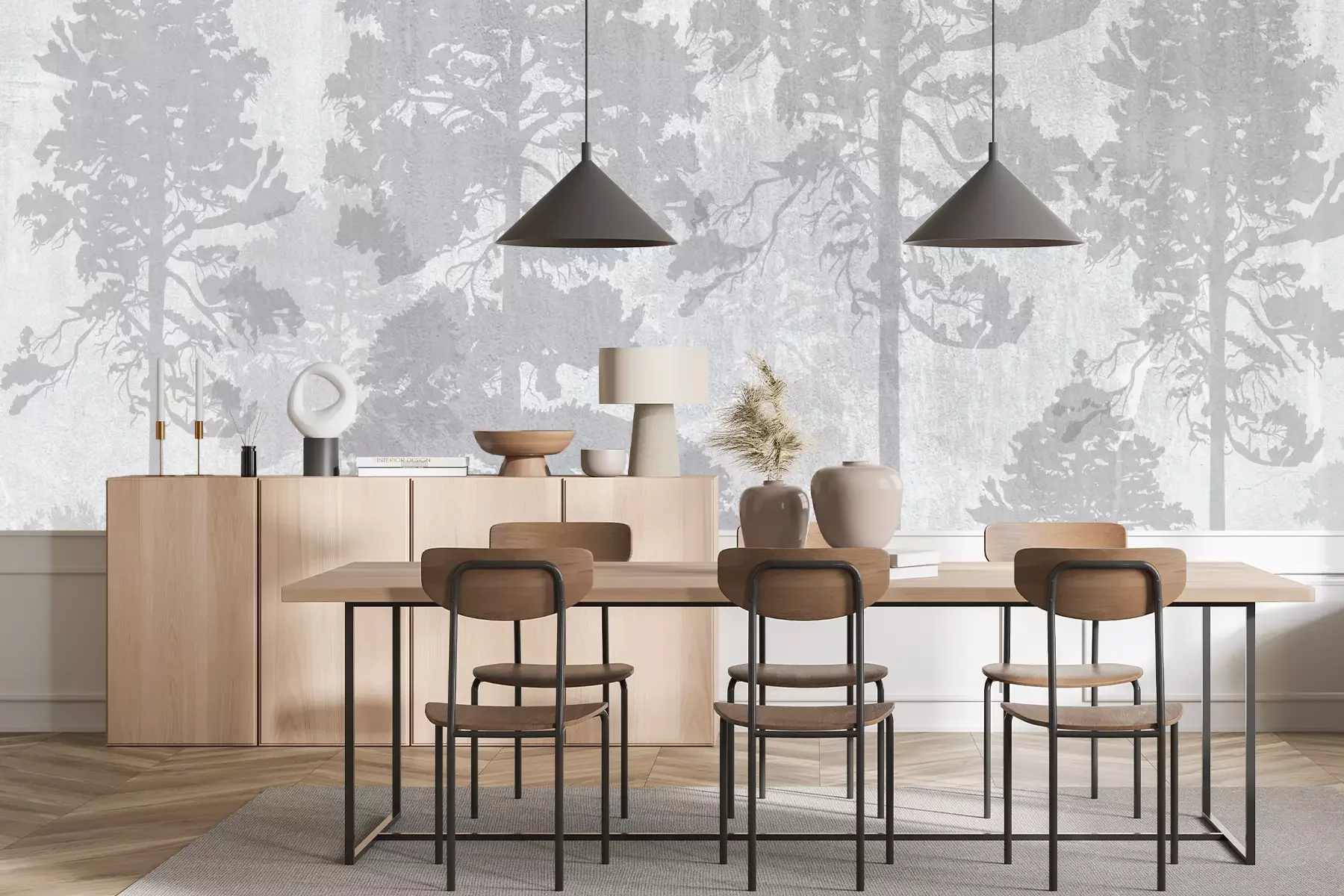 Mystiek grijs bos met herten en bomenFotobehang