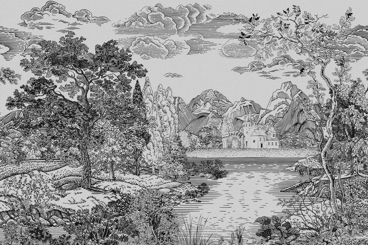 Fotobehang: Sketch style landscape with a river and trees in black and white tones