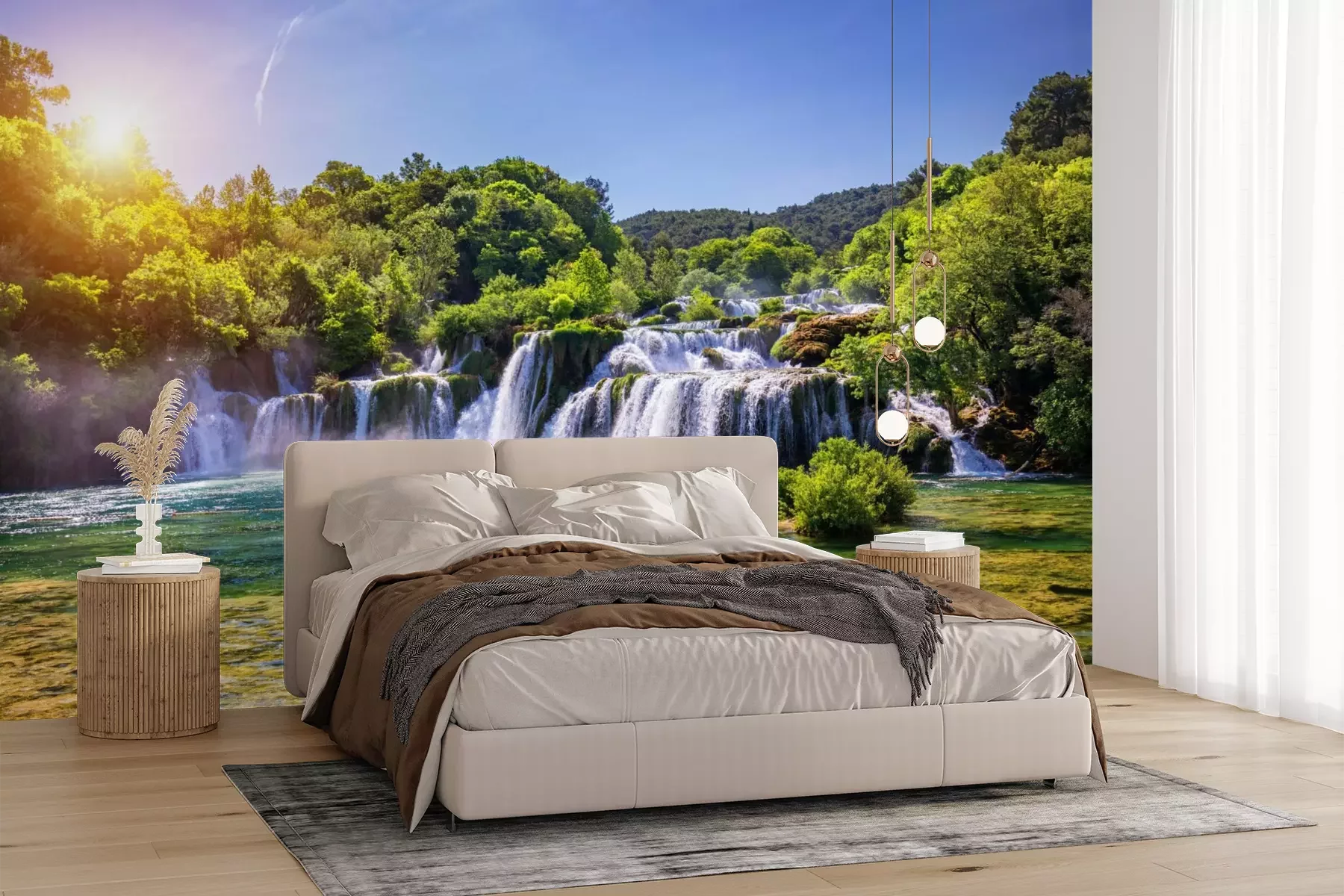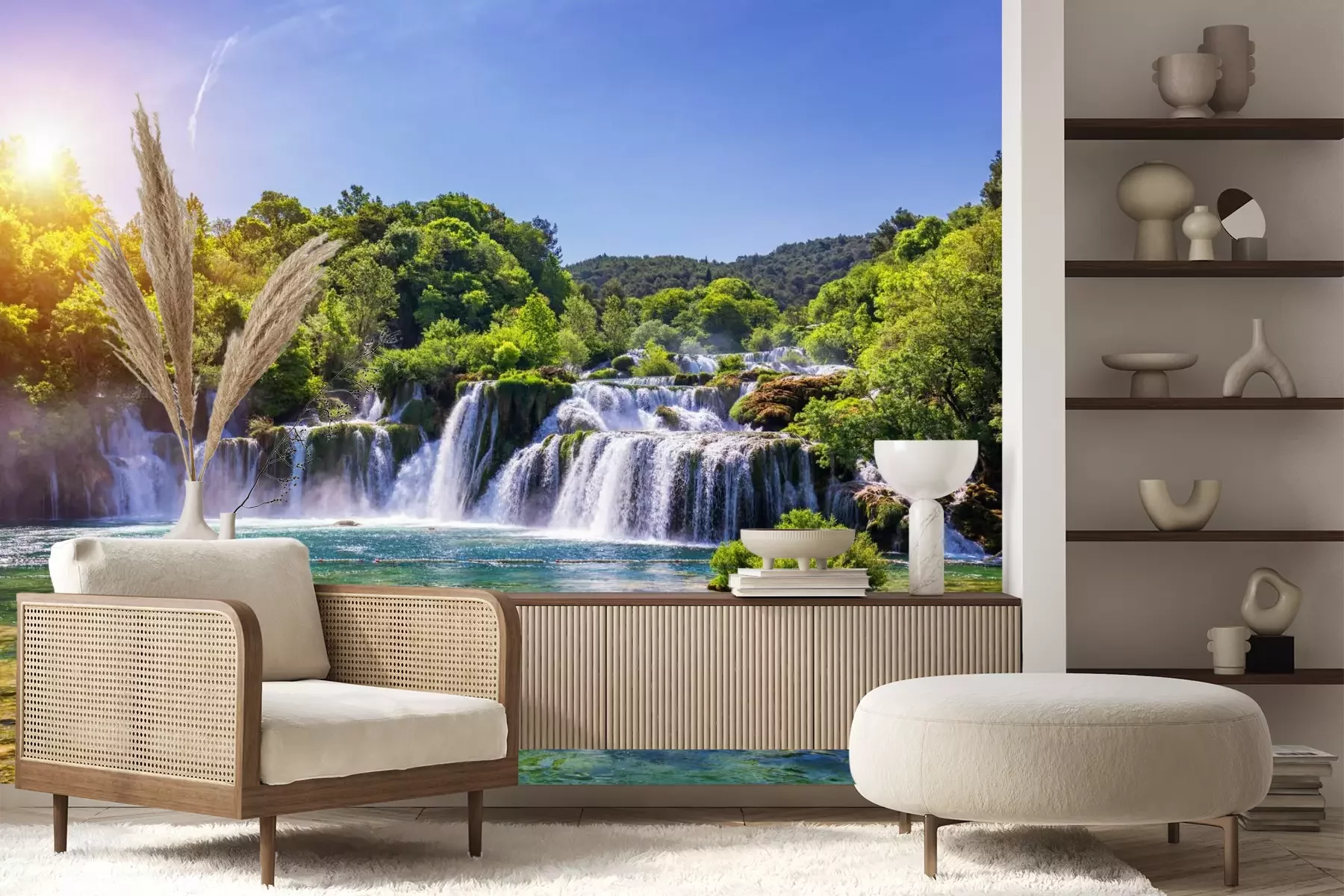 Muurdecoraties met een natuurmotief raken nooit uit de mode, en hun onmiskenbare voordeel is dat ze je laten genieten van de nabijheid van de natuur, zelfs als je in de stad woont. Een uitstekend bewijs hiervan is het door ons gekozen fotobehang. Landschap met een schilderachtig en uitgestrekt panorama heeft veel voordelen. Ten eerste, als je een adembenemend uitzicht in je interieur brengt, kun je ervan genieten in de rust van je woonkamer of slaapkamer. Ten tweede vergroot je optisch de ruimte wanneer zo’n fotobehang op de muur hangt. Waterval die in cascades van heuvels naar beneden stroomt, opent de ruimte visueel naar een uitgestrekt landschap, wat de perceptie van de werkelijke oppervlakte volledig verandert. Dit effect wordt versterkt door de blauwe lucht en het kristalheldere water op de voorgrond. Wanneer zo’n fotobehang in de kamer hangt, brengt het landschap een vrolijke en aangename sfeer in de ruimte. Ten derde is dit een ontwerp dat geschikt is voor de meeste kamers in huis. Je kunt hiermee de woonkamer of slaapkamer decoreren en zo een ideale omgeving creëren voor ontspanning en rust. Een landschap is een decoratief motief dat past bij veel interieurstijlen, waardoor dit fotobehang zo veelzijdig is. Natuur die op deze wanddecoratie wordt afgebeeld, zal prachtig staan in combinatie met houten meubels of een lichte loungeset, evenals weelderige planten met een exotisch karakter. Omdat onze producten van hoge kwaliteit zijn en bestand tegen schadelijke invloeden, is er nog een andere plek waar zo’n fotobehang perfect tot zijn recht komt. Waterval in een schilderachtig nationaal park kan het huidige uiterlijk van de badkamer volledig veranderen en de ruimte een geheel nieuwe uitstraling geven. Dit is een uitstekende oplossing om een kleine ruimte optisch te vergroten. De sleutel tot succes in deze ruimte is laminering. Welke eigenschappen krijgt het fotobehang hierdoor? Water en vocht vormen geen bedreiging meer voor de wanddecoratie, omdat de banen goed zijn beschermd met een beschermende folielaag. Hierdoor kan het ontwerp zelfs op de muur bij de wastafel of het bad worden aangebracht.