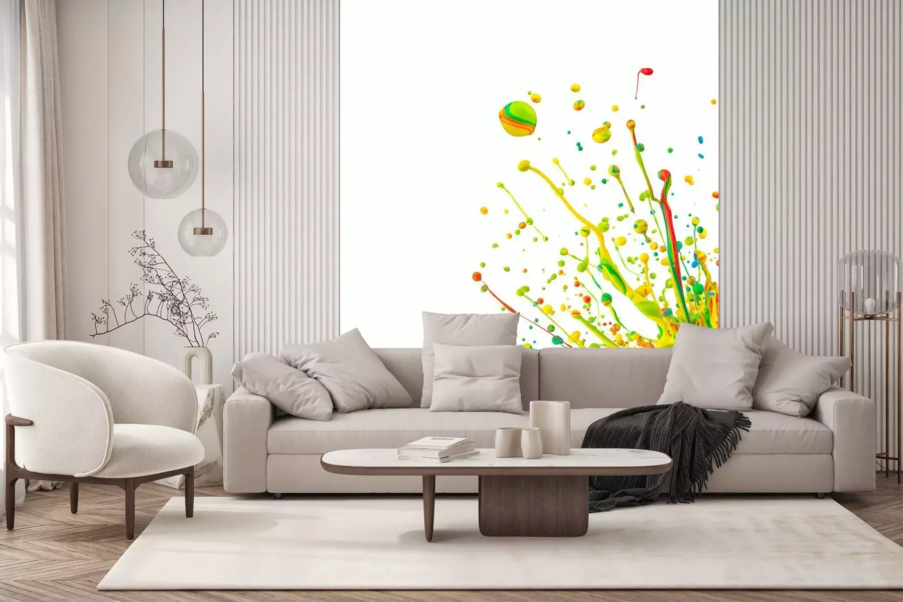 Het fotobehang wordt geleverd in banen. De afmetingen en het aantal banen waaruit het volledige fotobehang bestaat, zijn afhankelijk van het gekozen materiaal. Wanneer het formaat de maximale materiaalbreedte overschrijdt, bestaat de print uit meerdere gelijkmatige banen.