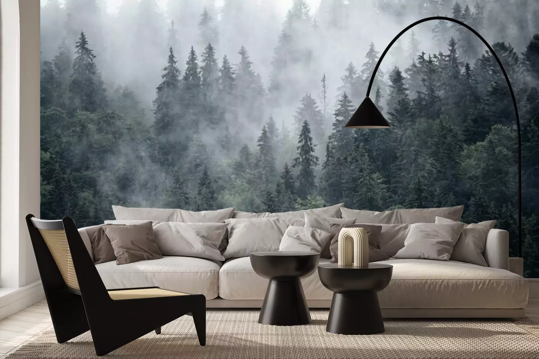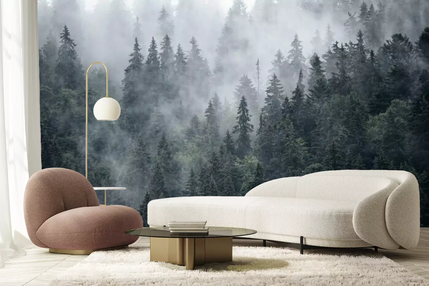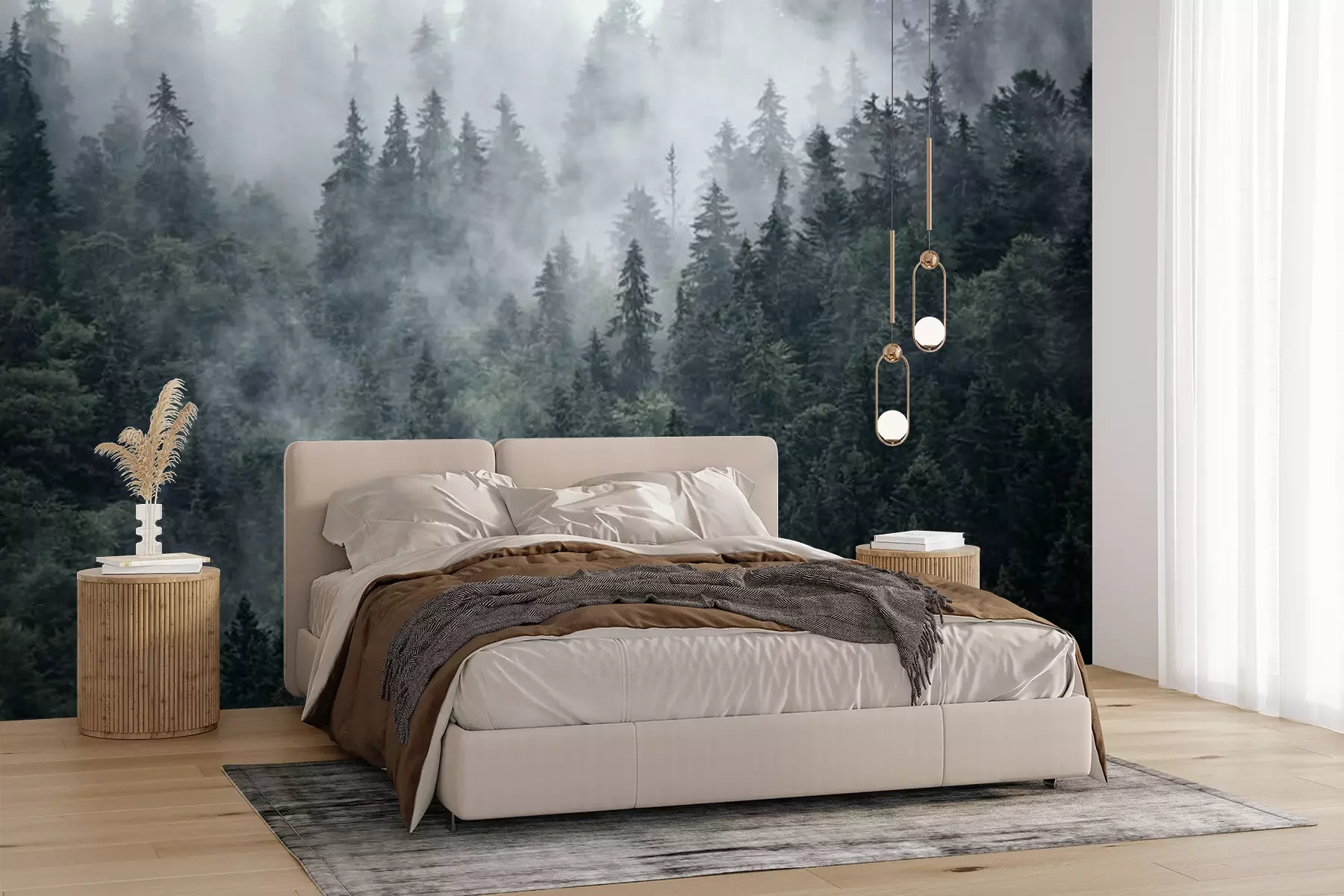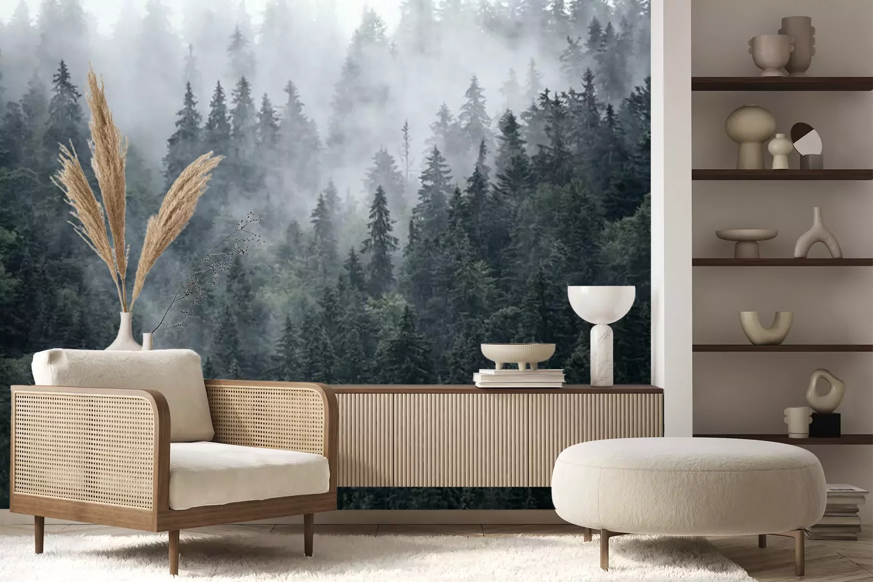 Naaldbomen in de mist, bos in de mistFotobehang