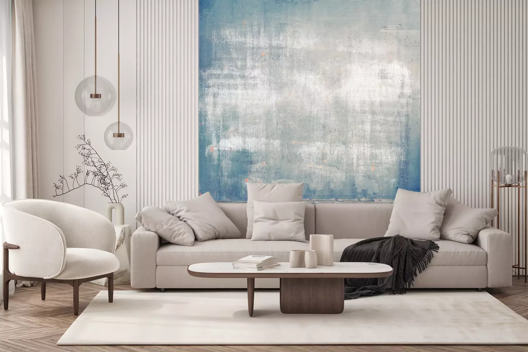 Het materiaal Premium+ is een gestructureerd vinyl op vlies met een gewicht van 255 g/m², dat kleine oneffenheden in de muur effectief camoufleert. De subtiele structuur van fijn zand geeft het oppervlak een exclusieve uitstraling, terwijl de halfmatte afwerking de diepte van de kleuren benadrukt. Het materiaal is dampdoorlatend, waardoor het ook in de keuken en badkamer kan worden gebruikt. De maximale breedte van één baan bedraagt 100 cm – bij grotere afmetingen wordt het fotobehang in meerdere gelijke banen verdeeld. De lijm wordt direct op de muur aangebracht en het behang wordt rand-aan-rand geplakt, wat zorgt voor een esthetisch resultaat zonder zichtbare naden. Het oppervlak kan gemakkelijk worden schoongemaakt door het voorzichtig af te nemen met een vochtige doek.