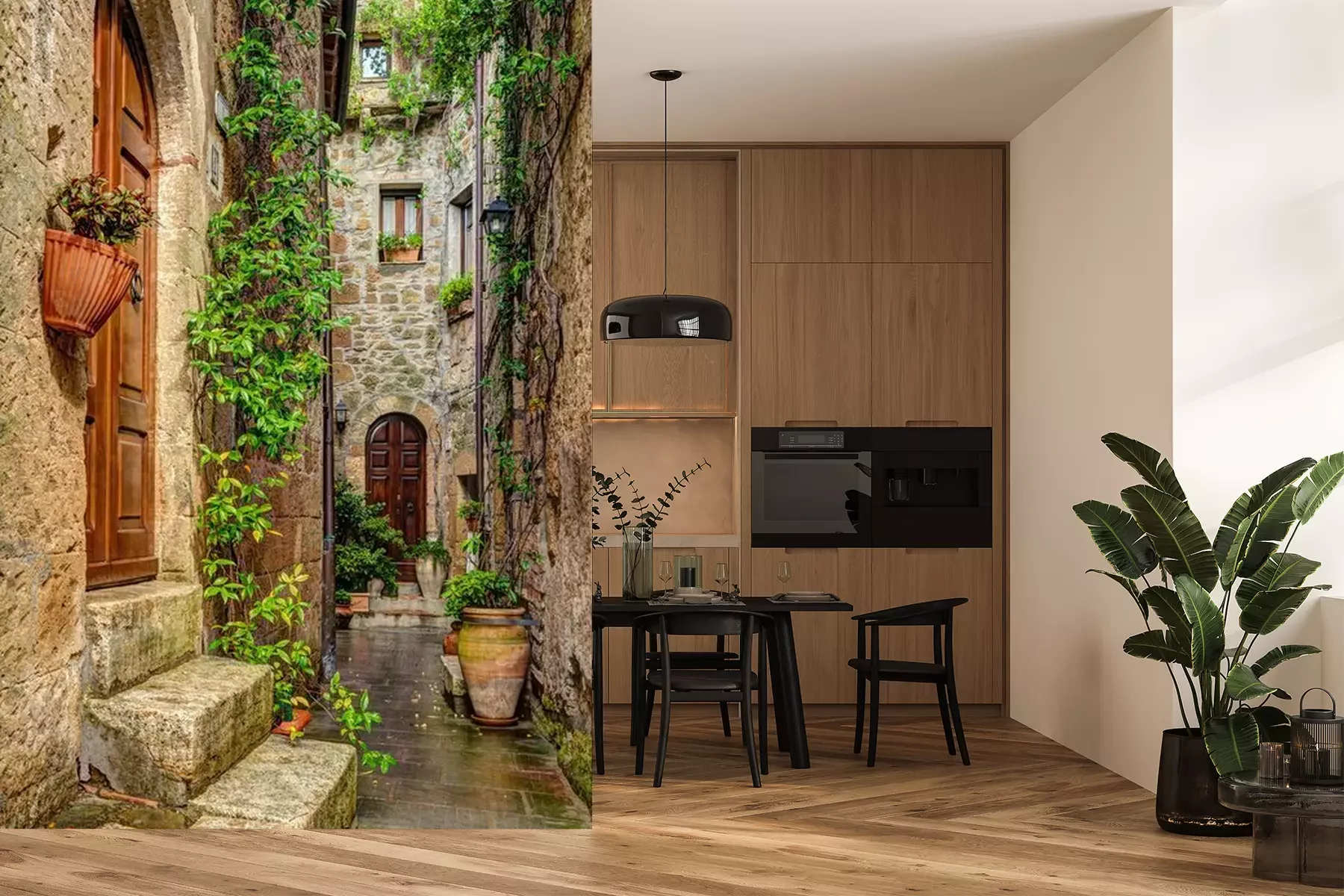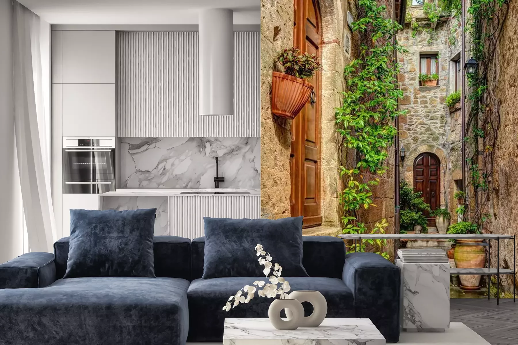 Het materiaal Premium is een glad vinyl op vlies, dat bestand is tegen uitrekken en vervorming. Het is dampdoorlatend – de muren kunnen vrij ademen – waardoor het geschikt is voor gebruik in de keuken en badkamer. Bij vervuiling kan het materiaal worden afgenomen met een vochtige doek. De maximale breedte van één baan bedraagt 95 of 105 cm, afhankelijk van de beschikbaarheid. Montage vindt plaats met de rand-aan-rand methode, wat een esthetisch resultaat zonder zichtbare naden oplevert. Omdat de lijm rechtstreeks op de muur wordt aangebracht, verloopt de installatie van het fotobehang snel en eenvoudig.
