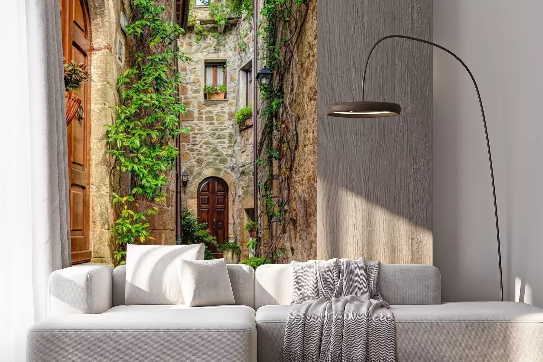 Het materiaal Premium+ is een gestructureerd vinyl op vlies met een gewicht van 255 g/m², dat kleine oneffenheden in de muur effectief camoufleert. De subtiele structuur van fijn zand geeft het oppervlak een exclusieve uitstraling, terwijl de halfmatte afwerking de diepte van de kleuren benadrukt. Het materiaal is dampdoorlatend, waardoor het ook in de keuken en badkamer kan worden gebruikt. De maximale breedte van één baan bedraagt 100 cm – bij grotere afmetingen wordt het fotobehang in meerdere gelijke banen verdeeld. De lijm wordt direct op de muur aangebracht en het behang wordt rand-aan-rand geplakt, wat zorgt voor een esthetisch resultaat zonder zichtbare naden. Het oppervlak kan gemakkelijk worden schoongemaakt door het voorzichtig af te nemen met een vochtige doek.