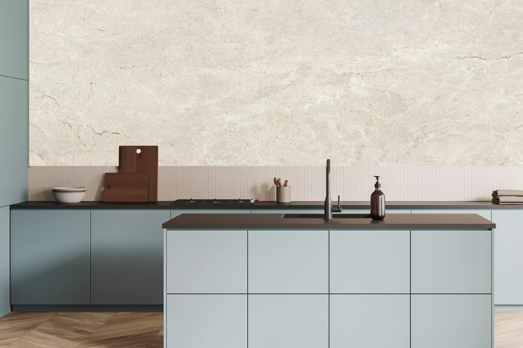 Het materiaal Premium is een glad vinyl op vlies, dat bestand is tegen uitrekken en vervorming. Het is dampdoorlatend – de muren kunnen vrij ademen – waardoor het geschikt is voor gebruik in de keuken en badkamer. Bij vervuiling kan het materiaal worden afgenomen met een vochtige doek. De maximale breedte van één baan bedraagt 95 of 105 cm, afhankelijk van de beschikbaarheid. Montage vindt plaats met de rand-aan-rand methode, wat een esthetisch resultaat zonder zichtbare naden oplevert. Omdat de lijm rechtstreeks op de muur wordt aangebracht, verloopt de installatie van het fotobehang snel en eenvoudig.