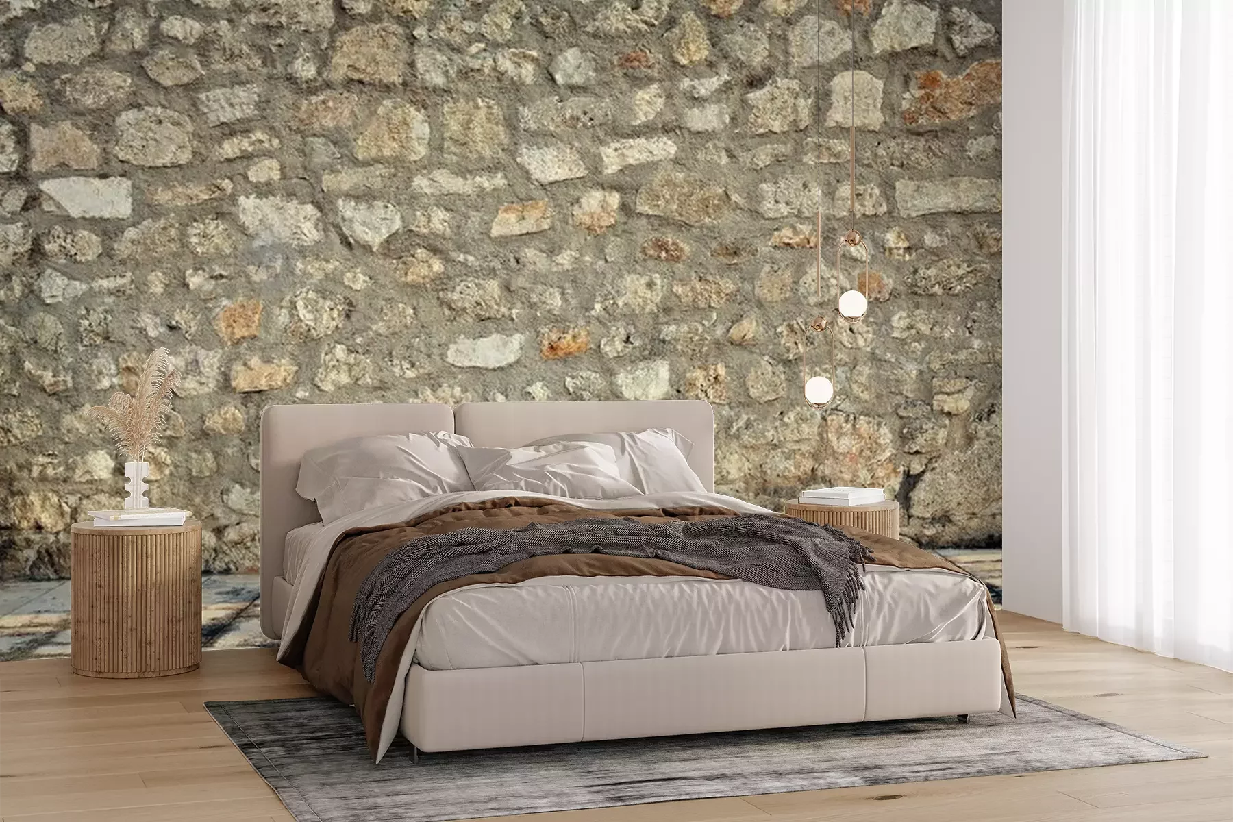 Het materiaal Premium+ is een gestructureerd vinyl op vlies met een gewicht van 255 g/m², dat kleine oneffenheden in de muur effectief camoufleert. De subtiele structuur van fijn zand geeft het oppervlak een exclusieve uitstraling, terwijl de halfmatte afwerking de diepte van de kleuren benadrukt. Het materiaal is dampdoorlatend, waardoor het ook in de keuken en badkamer kan worden gebruikt. De maximale breedte van één baan bedraagt 100 cm – bij grotere afmetingen wordt het fotobehang in meerdere gelijke banen verdeeld. De lijm wordt direct op de muur aangebracht en het behang wordt rand-aan-rand geplakt, wat zorgt voor een esthetisch resultaat zonder zichtbare naden. Het oppervlak kan gemakkelijk worden schoongemaakt door het voorzichtig af te nemen met een vochtige doek.