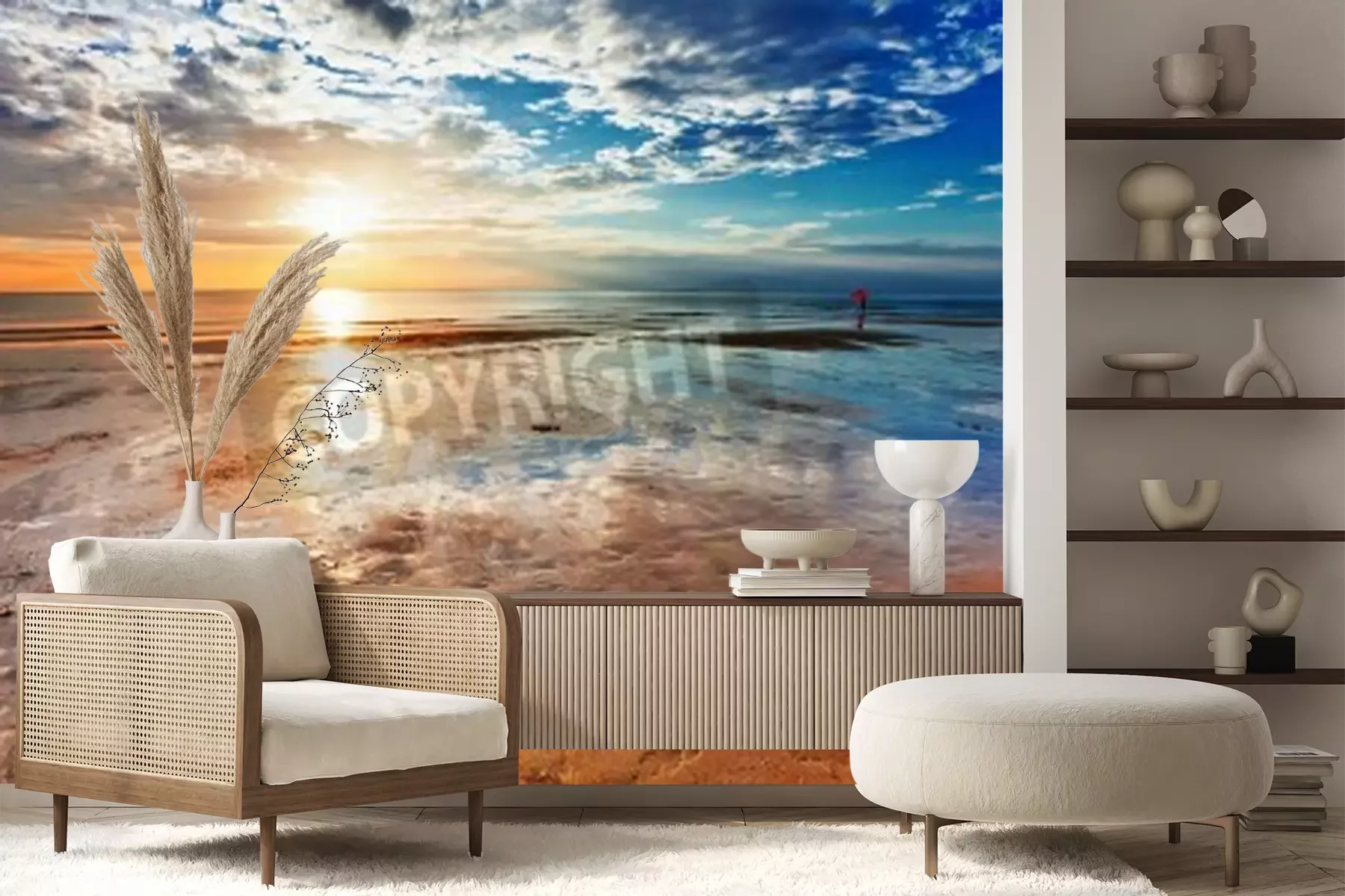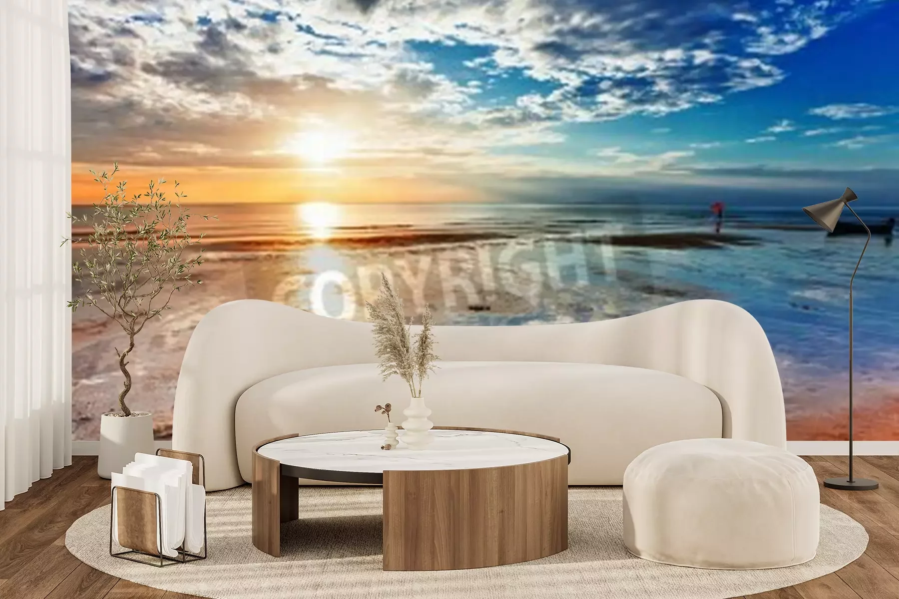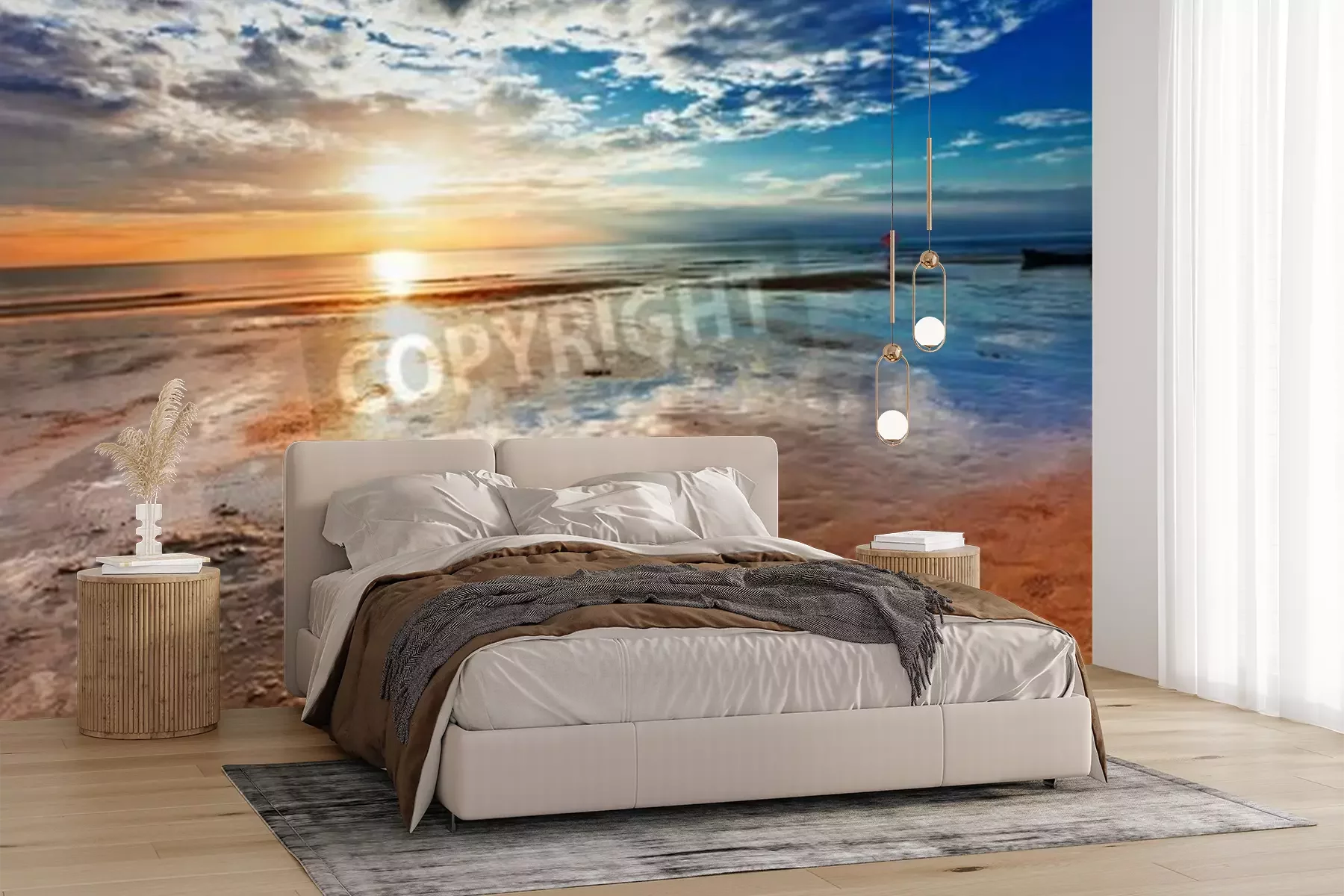 Fotobehang Strand en weerspiegeling van de zonsondergang in de zee