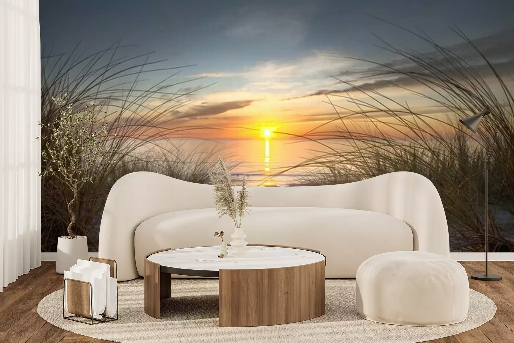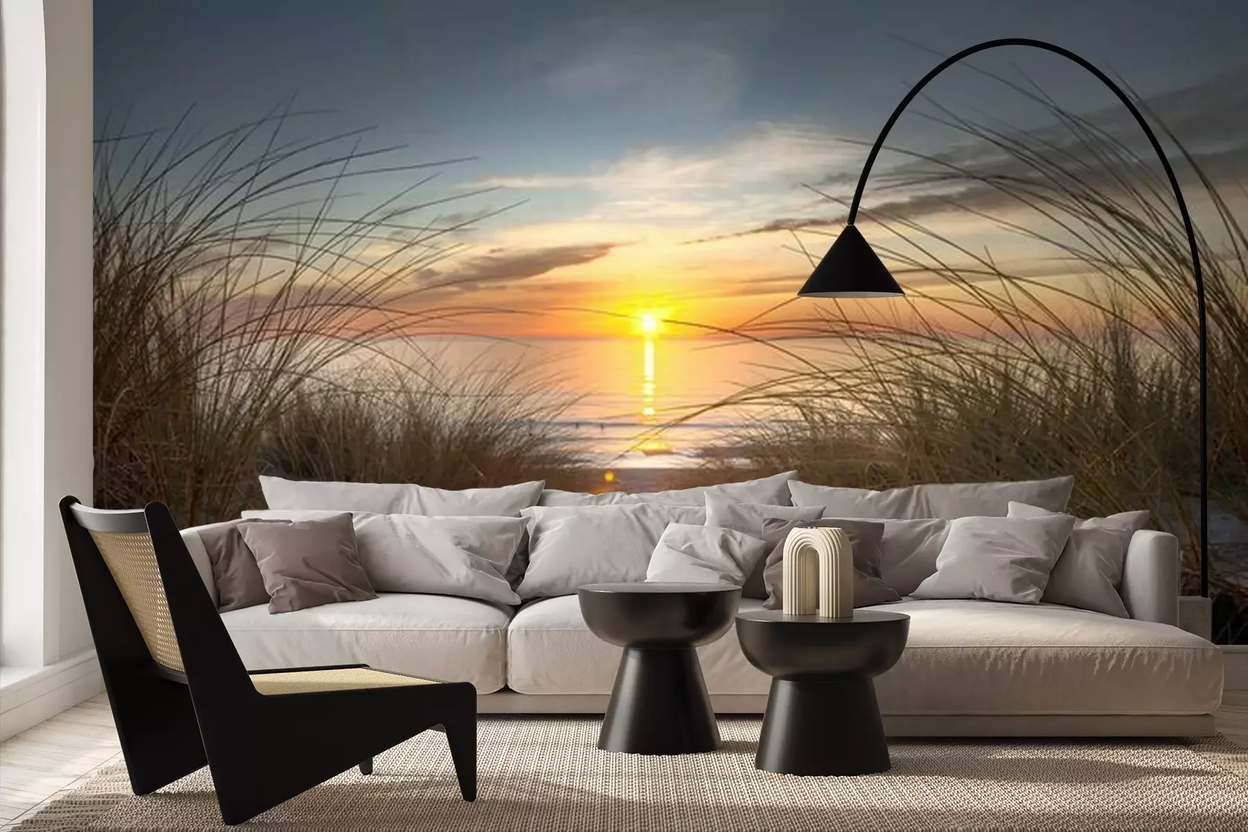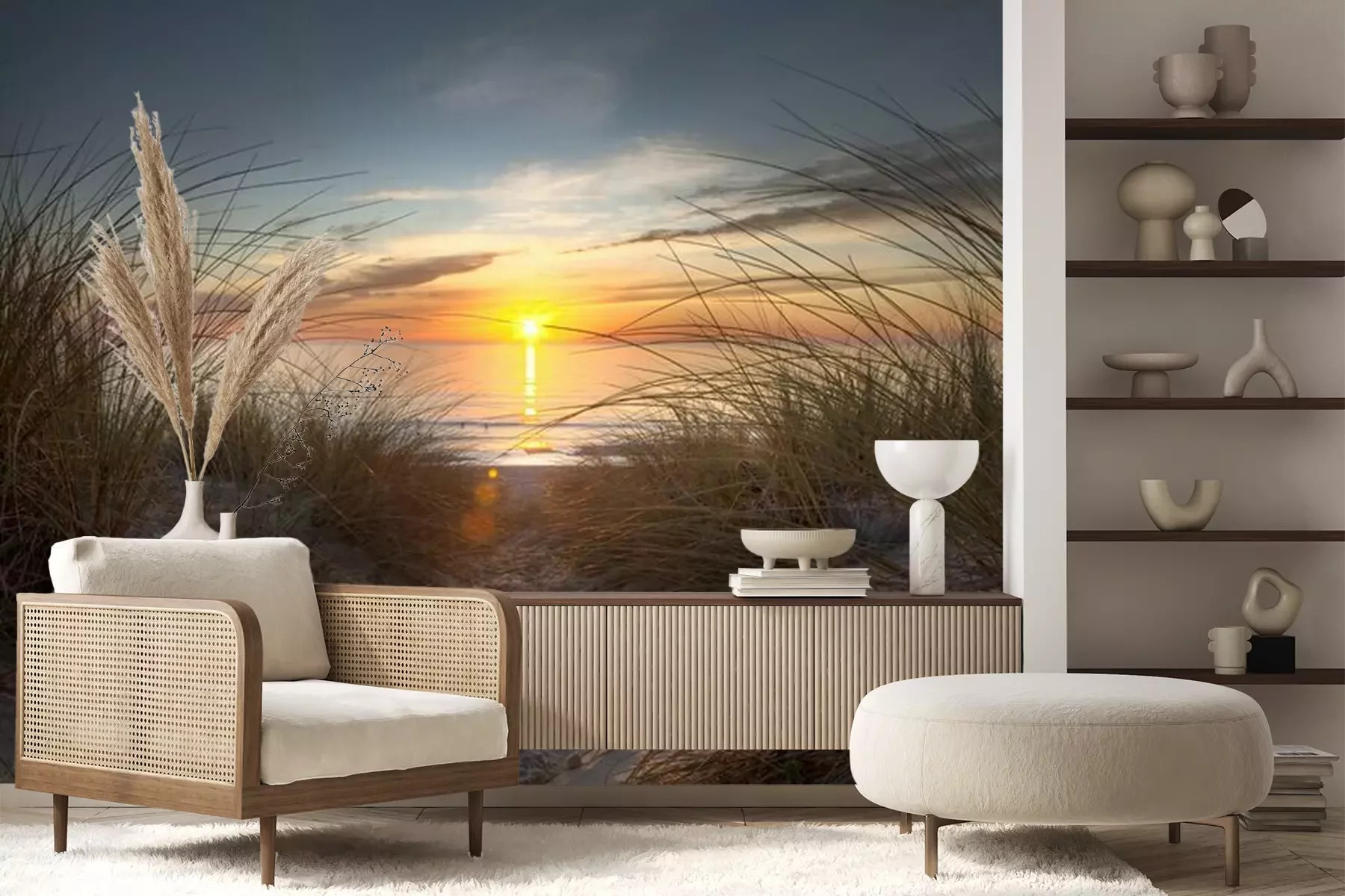 Het materiaal Premium+ is een gestructureerd vinyl op vlies met een gewicht van 255 g/m², dat kleine oneffenheden in de muur effectief camoufleert. De subtiele structuur van fijn zand geeft het oppervlak een exclusieve uitstraling, terwijl de halfmatte afwerking de diepte van de kleuren benadrukt. Het materiaal is dampdoorlatend, waardoor het ook in de keuken en badkamer kan worden gebruikt. De maximale breedte van één baan bedraagt 100 cm – bij grotere afmetingen wordt het fotobehang in meerdere gelijke banen verdeeld. De lijm wordt direct op de muur aangebracht en het behang wordt rand-aan-rand geplakt, wat zorgt voor een esthetisch resultaat zonder zichtbare naden. Het oppervlak kan gemakkelijk worden schoongemaakt door het voorzichtig af te nemen met een vochtige doek.
