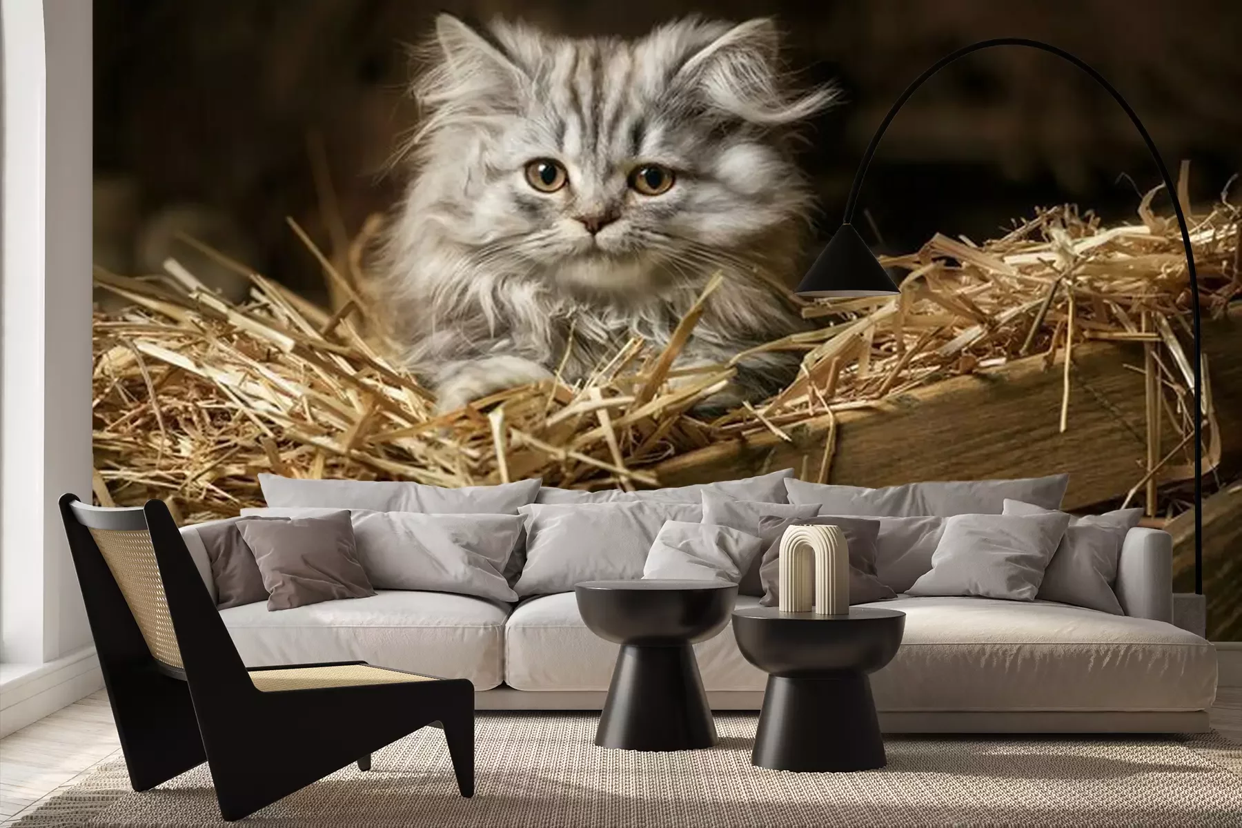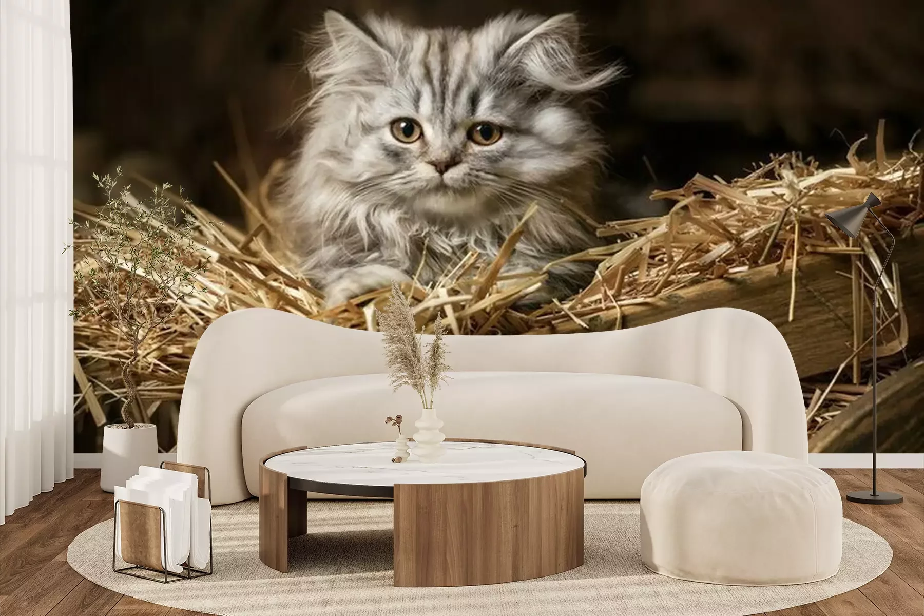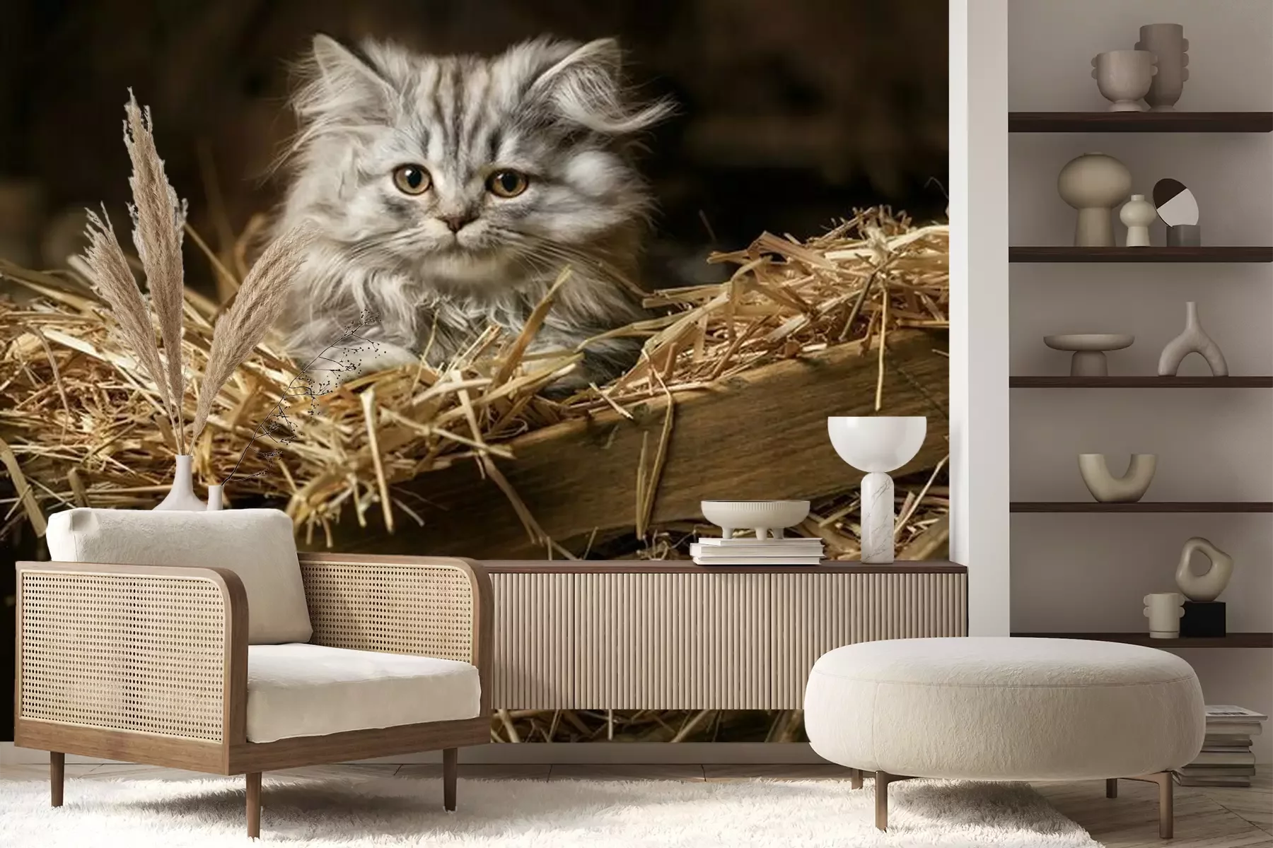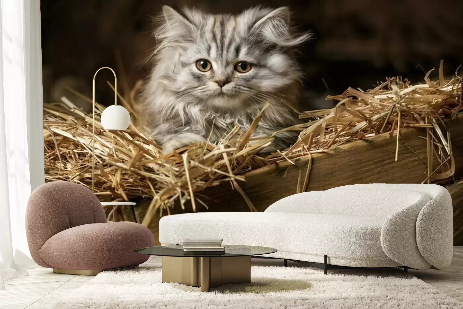 Fotobehang Striped fluffy kitten in an old wagon with straw
