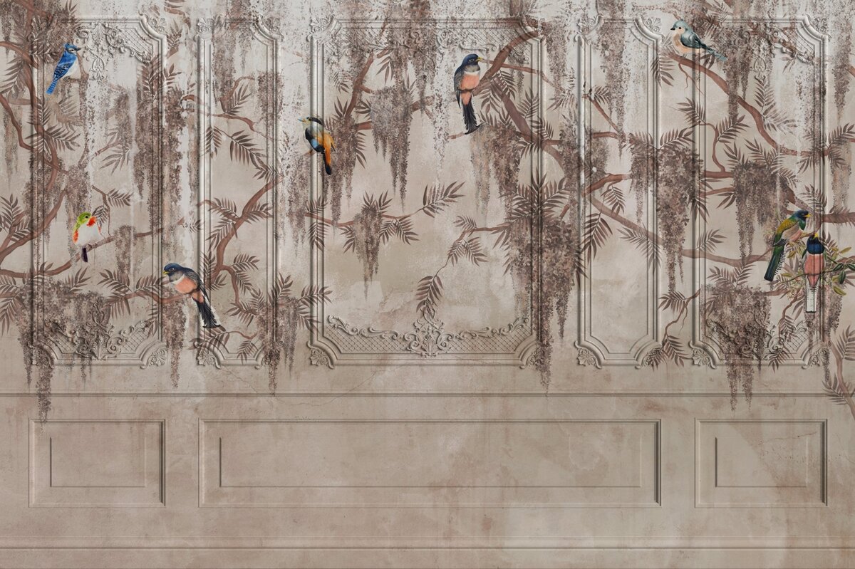 Fotobehang: Stucwerk met bosvogels en takken